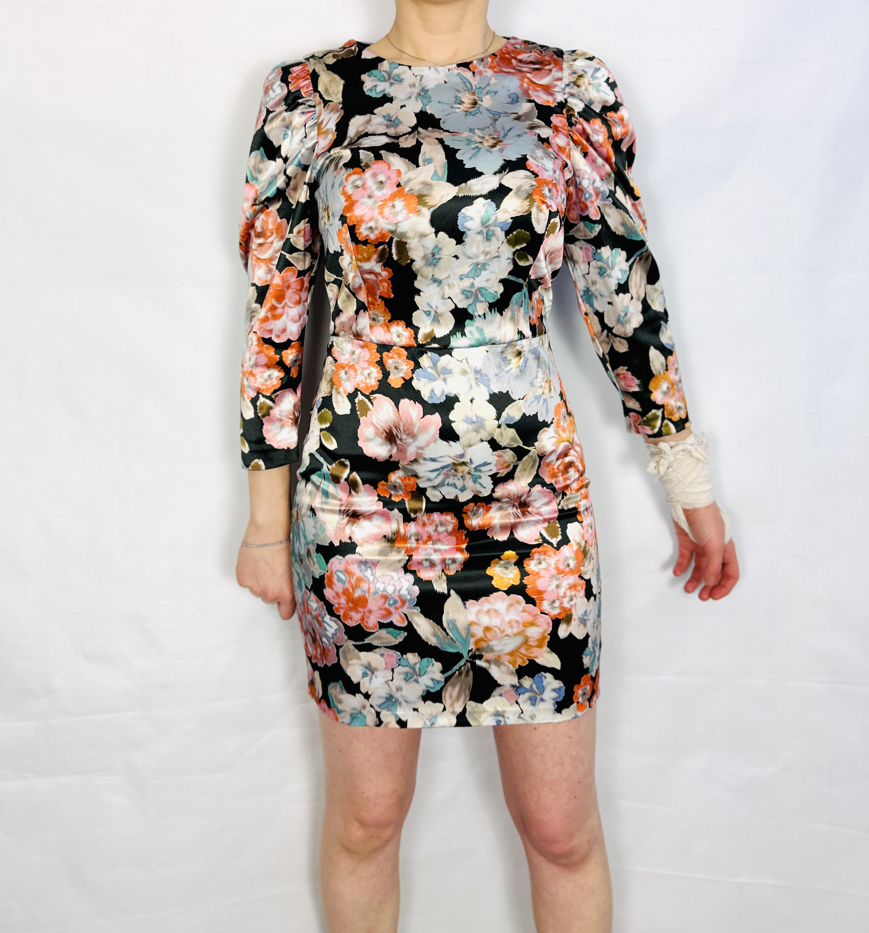Materiał ma satynowe, delikatnie połyskujące wykończenie — tkanina wydaje się gładka i lekko lejąca, miękko podążająca za ruchem ciała i tworząca subtelne refleksy światła. Ten rodzaj faktury nadaje sukience wieczorowego szyku, a jednocześnie sprawia, że wzór kwiatowy nabiera trójwymiarowego charakteru. Dzięki miękkiemu układowi materiał tworzy estetyczne fałdy i podkreśla kształty, nie tracąc przy tym schludnej formy.