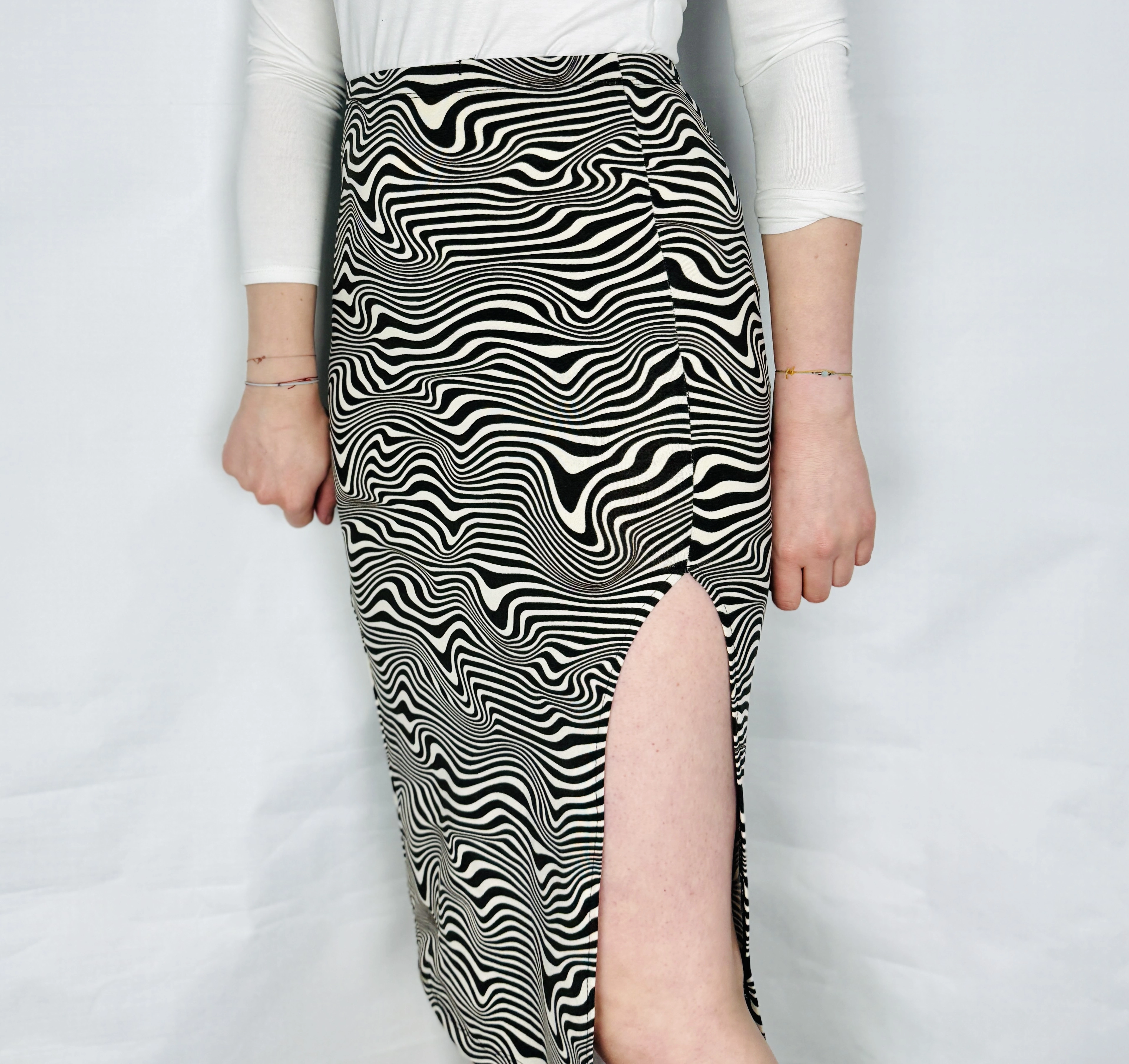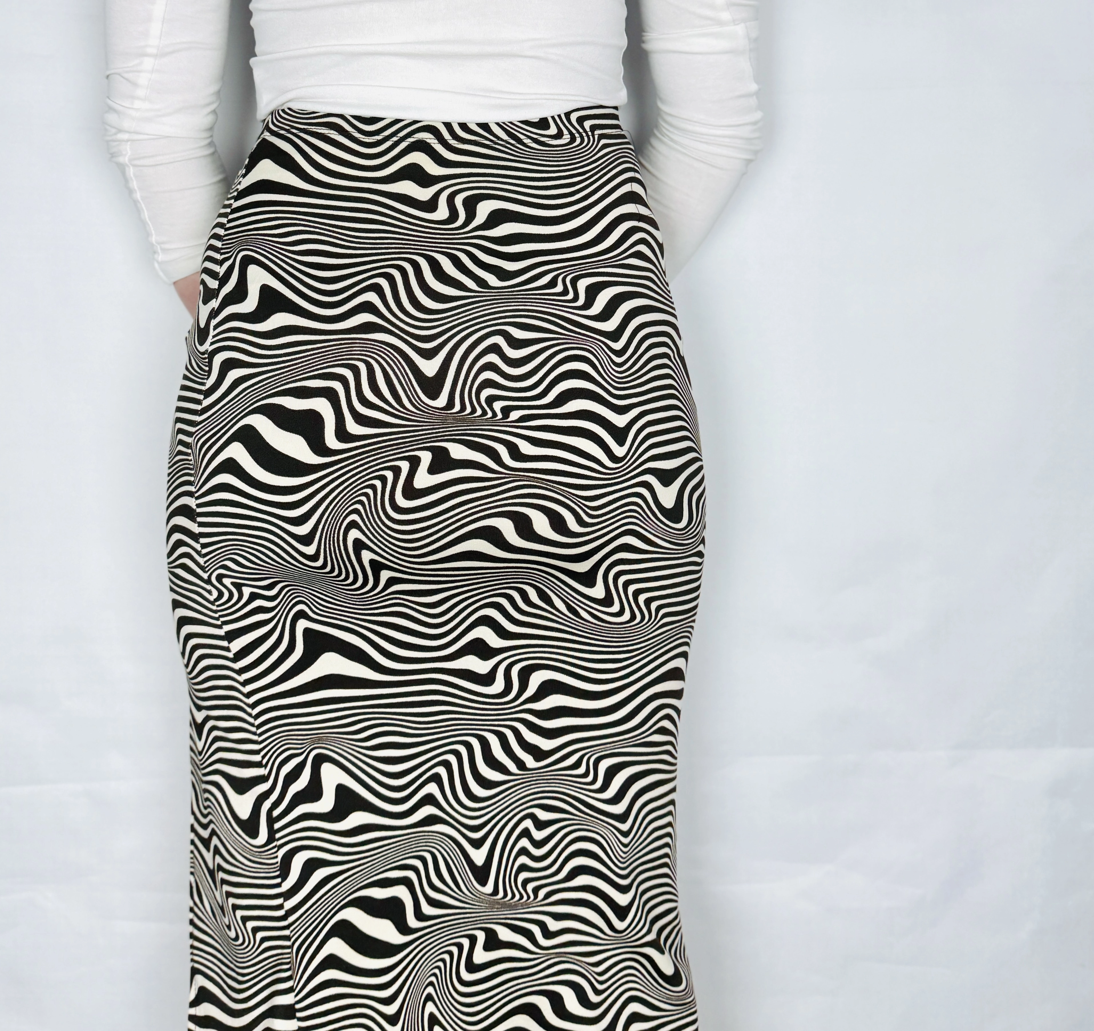 Ta spódnica przyciąga uwagę wyrazistym, falującym wzorem, który tworzy niemal hipnotyzujący efekt wizualny. Połączenie kontrastujących odcieni nadaje jej nowoczesnego i artystycznego charakteru, jednocześnie zachowując elegancję i kobiecą lekkość. To model, który wyróżnia się na tle klasycznych propozycji i wnosi do stylizacji odrobinę odwagi oraz świeżości.