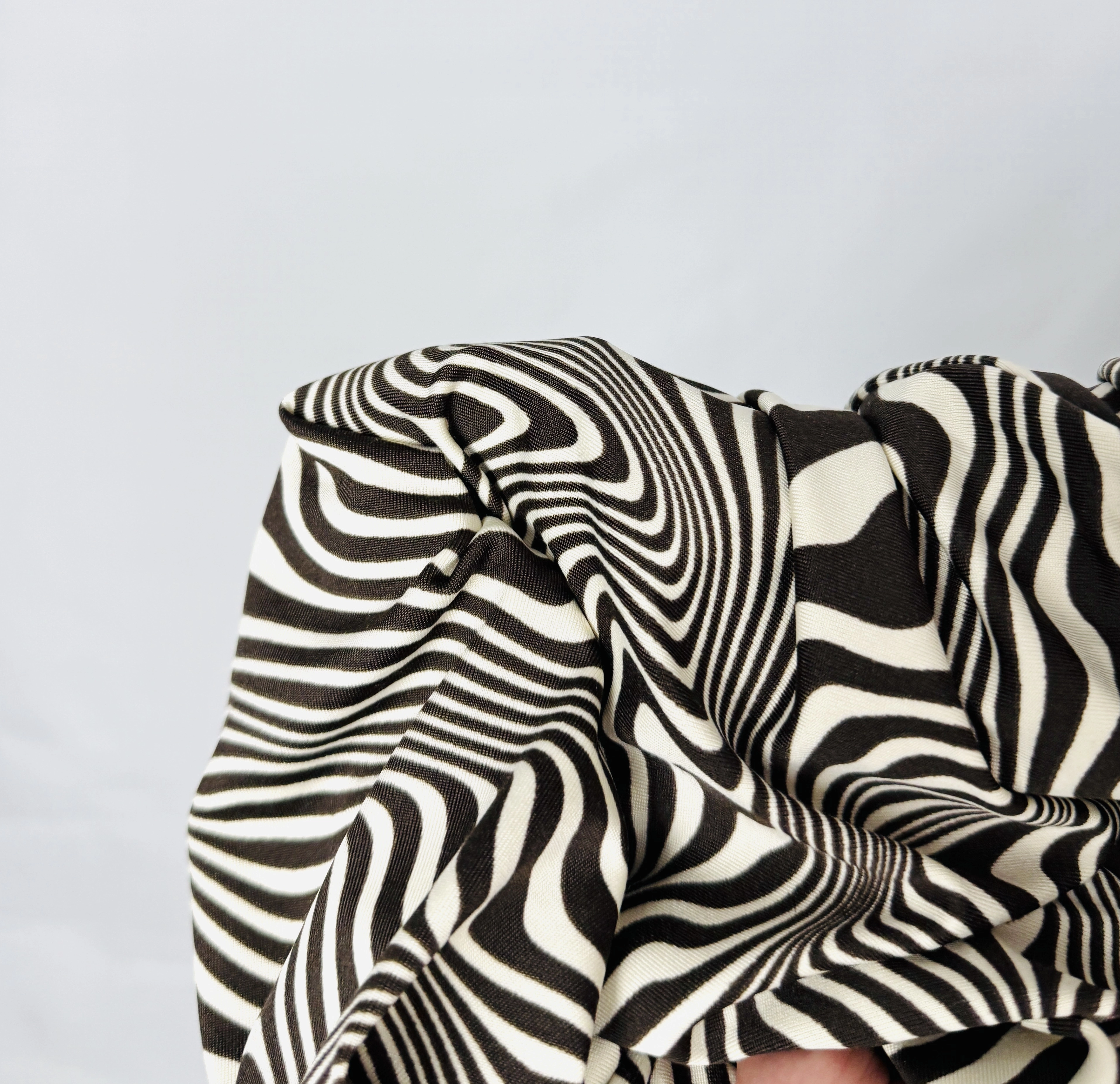 Materiał sprawia wrażenie miękkiego, elastycznego i przyjemnie otulającego ciało. Tkanina układa się płynnie, podkreślając linię sylwetki bez nadmiernego opinania. Gładka powierzchnia i dynamiczny wzór tworzą efekt ruchu, który dodatkowo ożywia całość i nadaje jej nowoczesnego wyrazu.