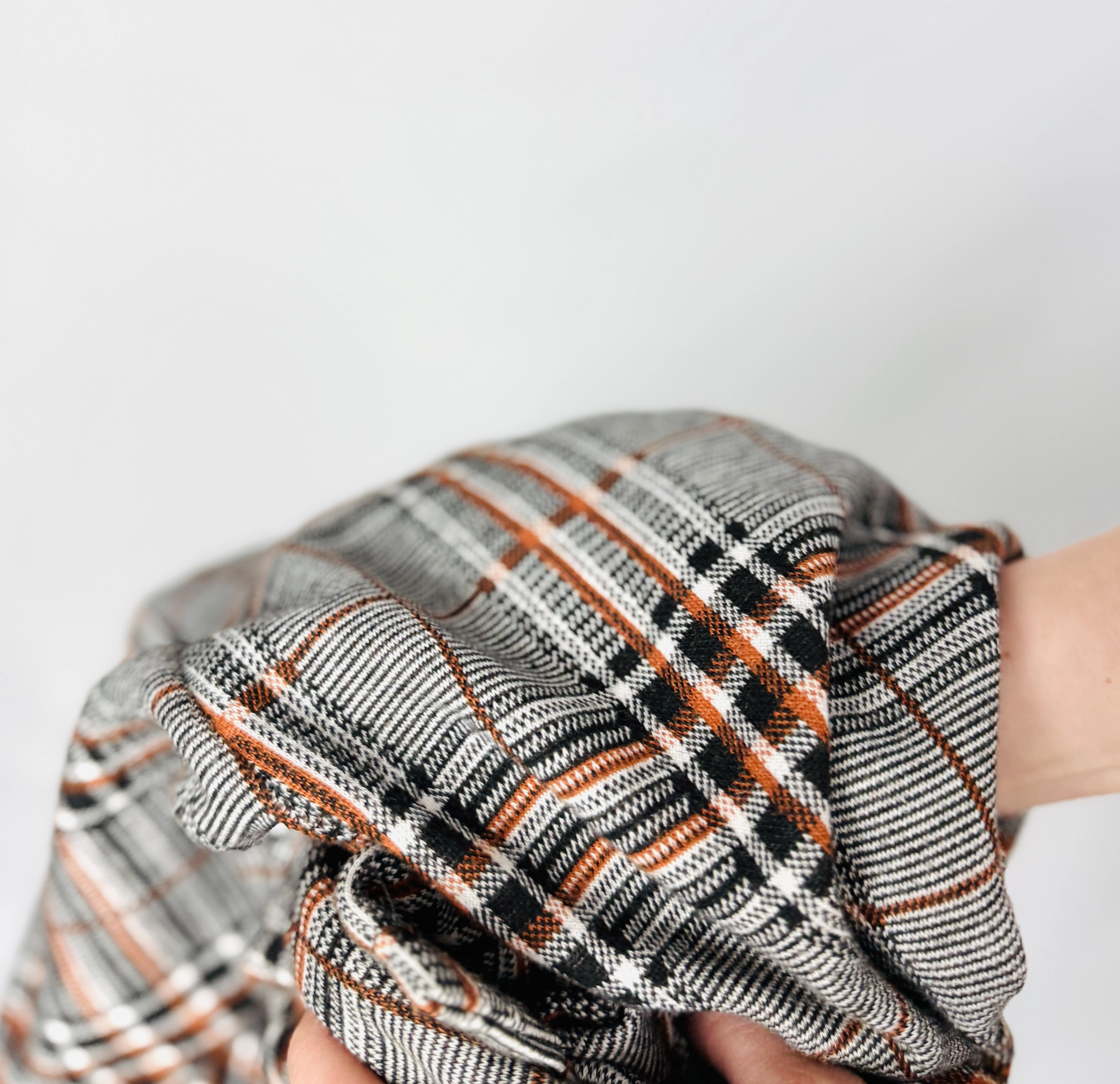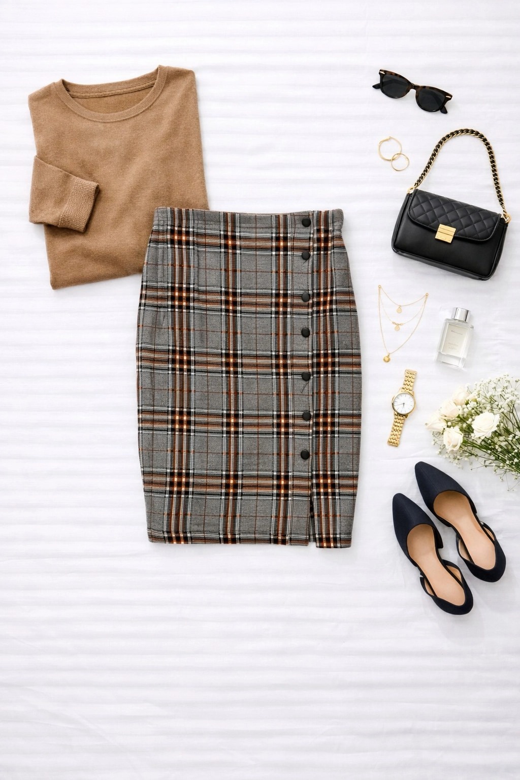 Ta spódnica to elegancka interpretacja klasycznego wzoru w kratkę, która zyskuje nowoczesny charakter dzięki dopracowanym detalom i kobiecej linii. Stonowana baza w odcieniach szarości przełamana jest subtelnymi akcentami ciepłego brązu i czerni, co tworzy harmonijną i ponadczasową kompozycję. To model, który doskonale odnajduje się w stylizacjach inspirowanych klasyką, ale jednocześnie wprowadza do nich świeżość i lekkość.