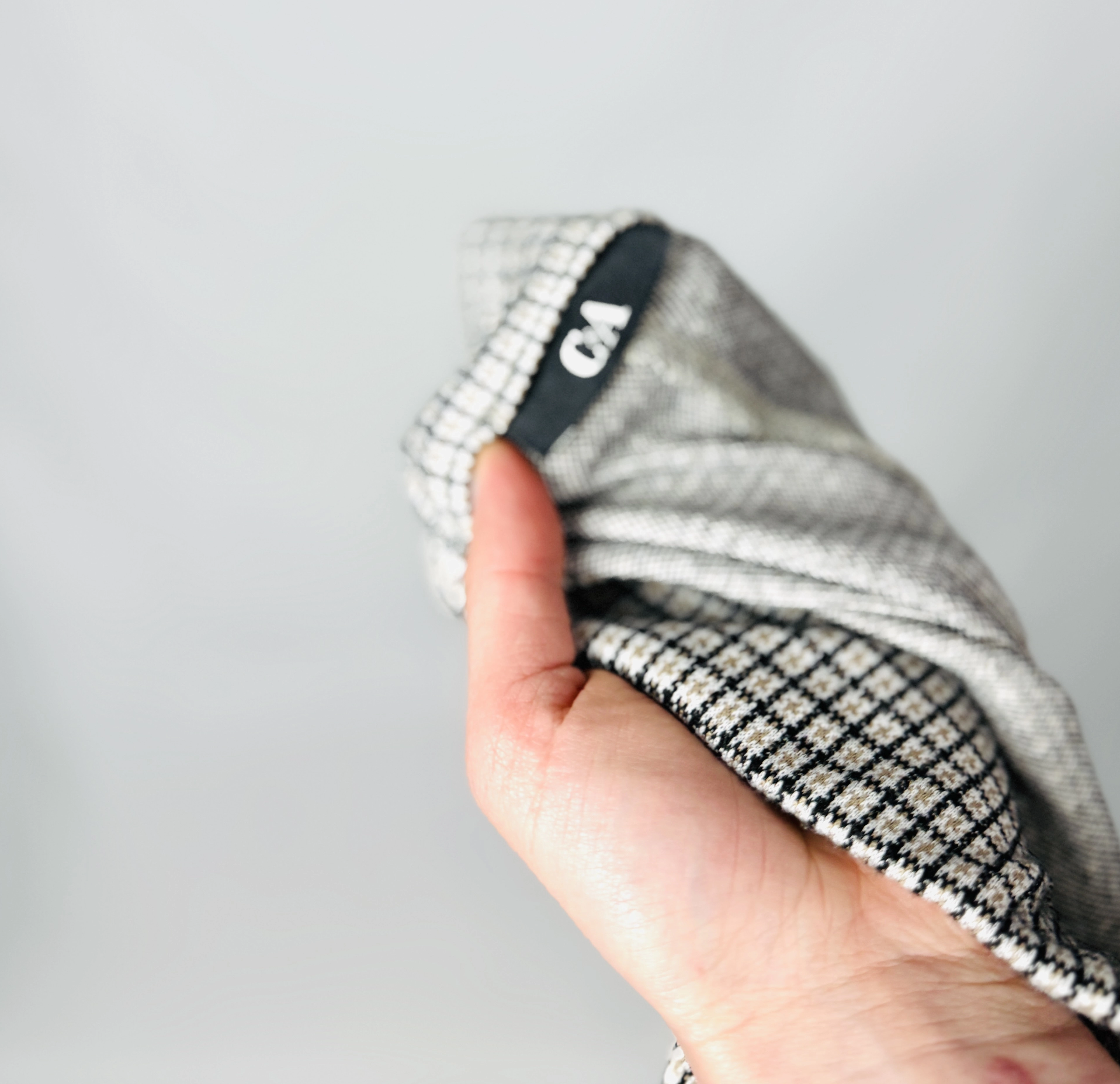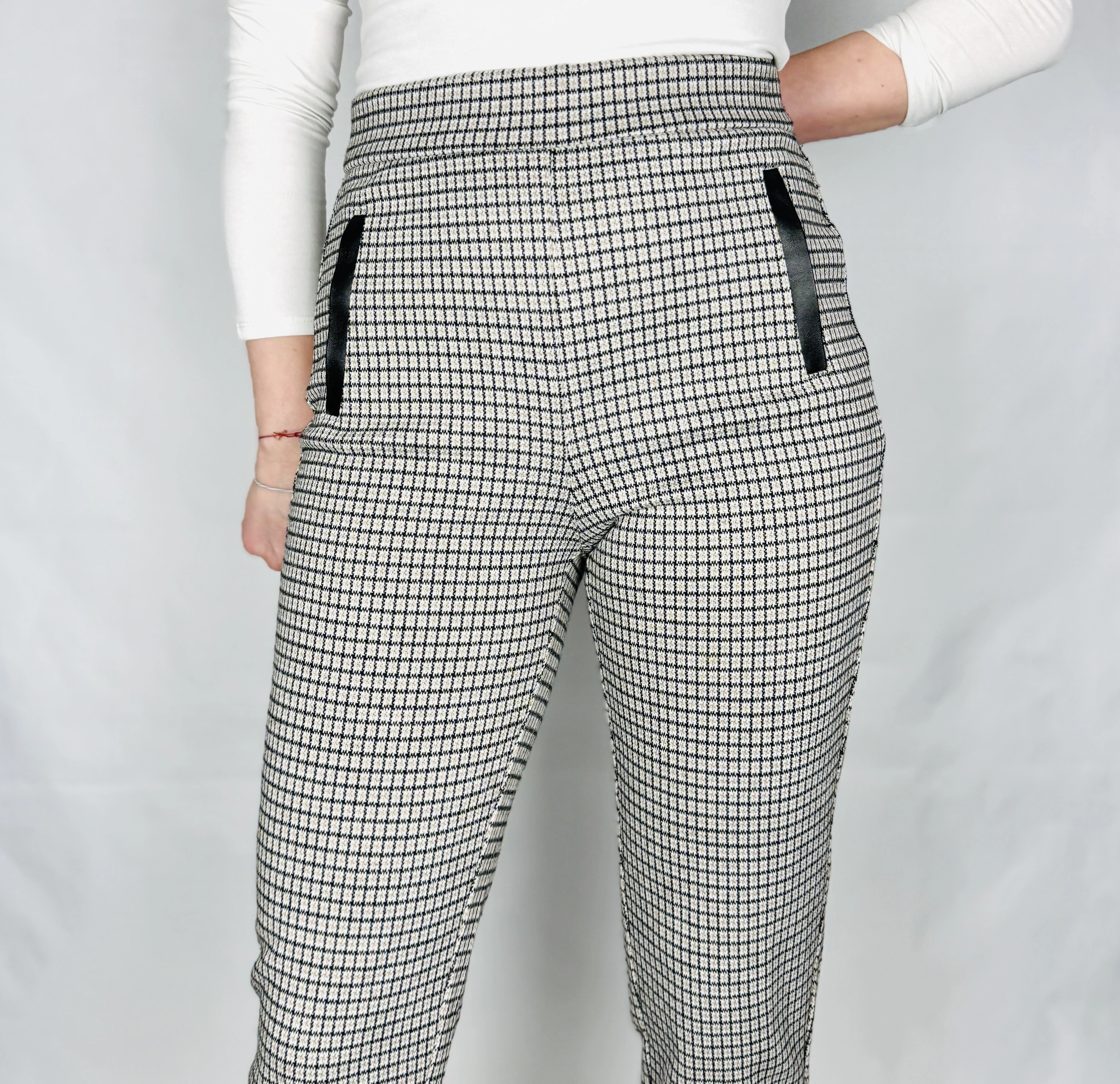 Materiał sprawia wrażenie miękkiego, elastycznego i przyjemnie dopasowującego się do ciała. Tkanina układa się gładko, nie tworząc zbędnych zagnieceń, co podkreśla estetyczny i uporządkowany wygląd spodni. Subtelna struktura wzoru kratki nadaje im głębi i sprawia, że całość wygląda bardzo stylowo, zachowując jednocześnie komfort noszenia przez cały dzień.