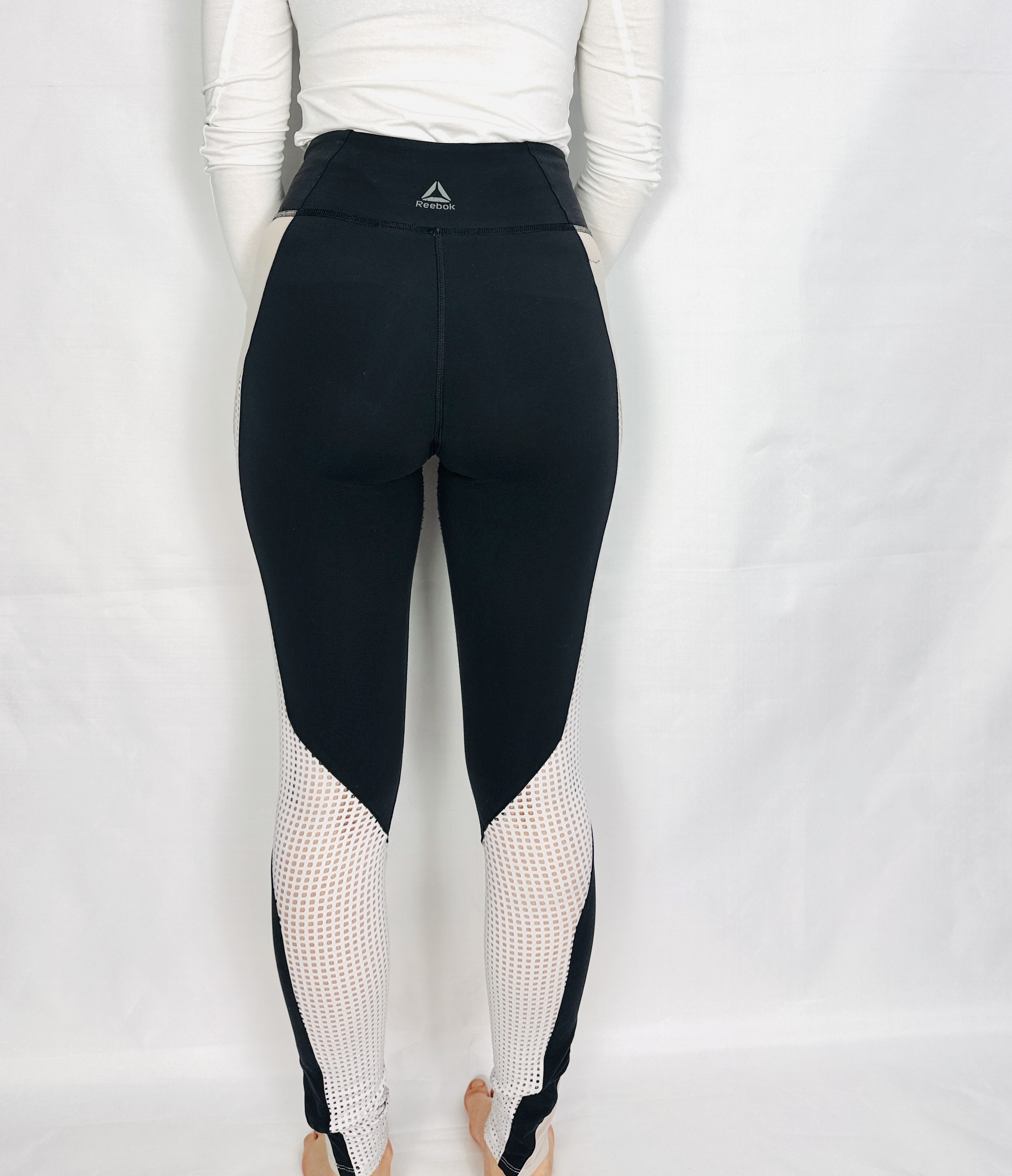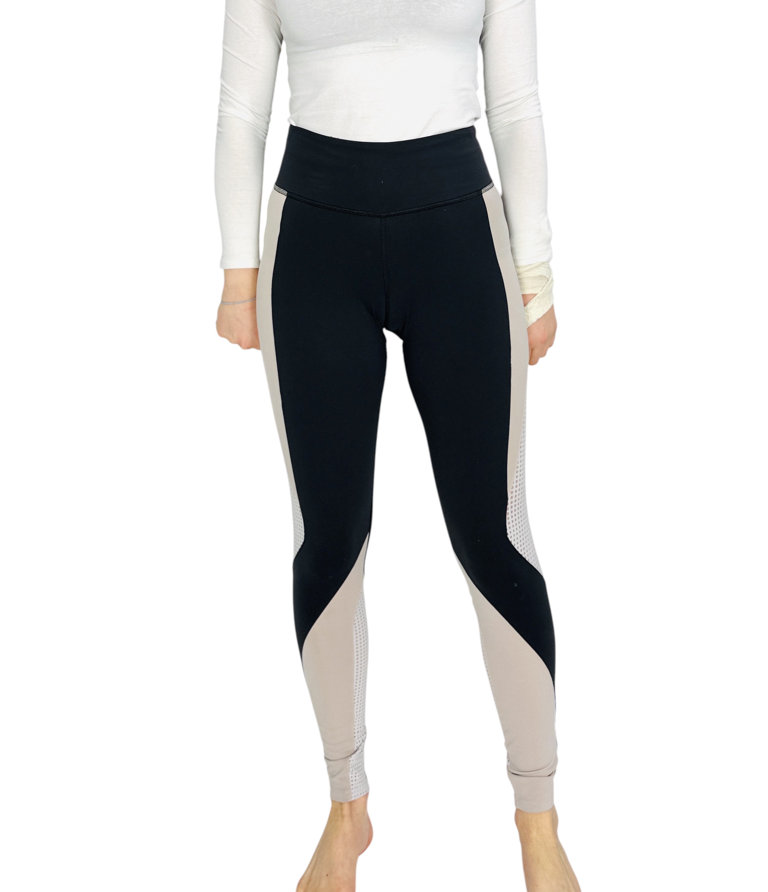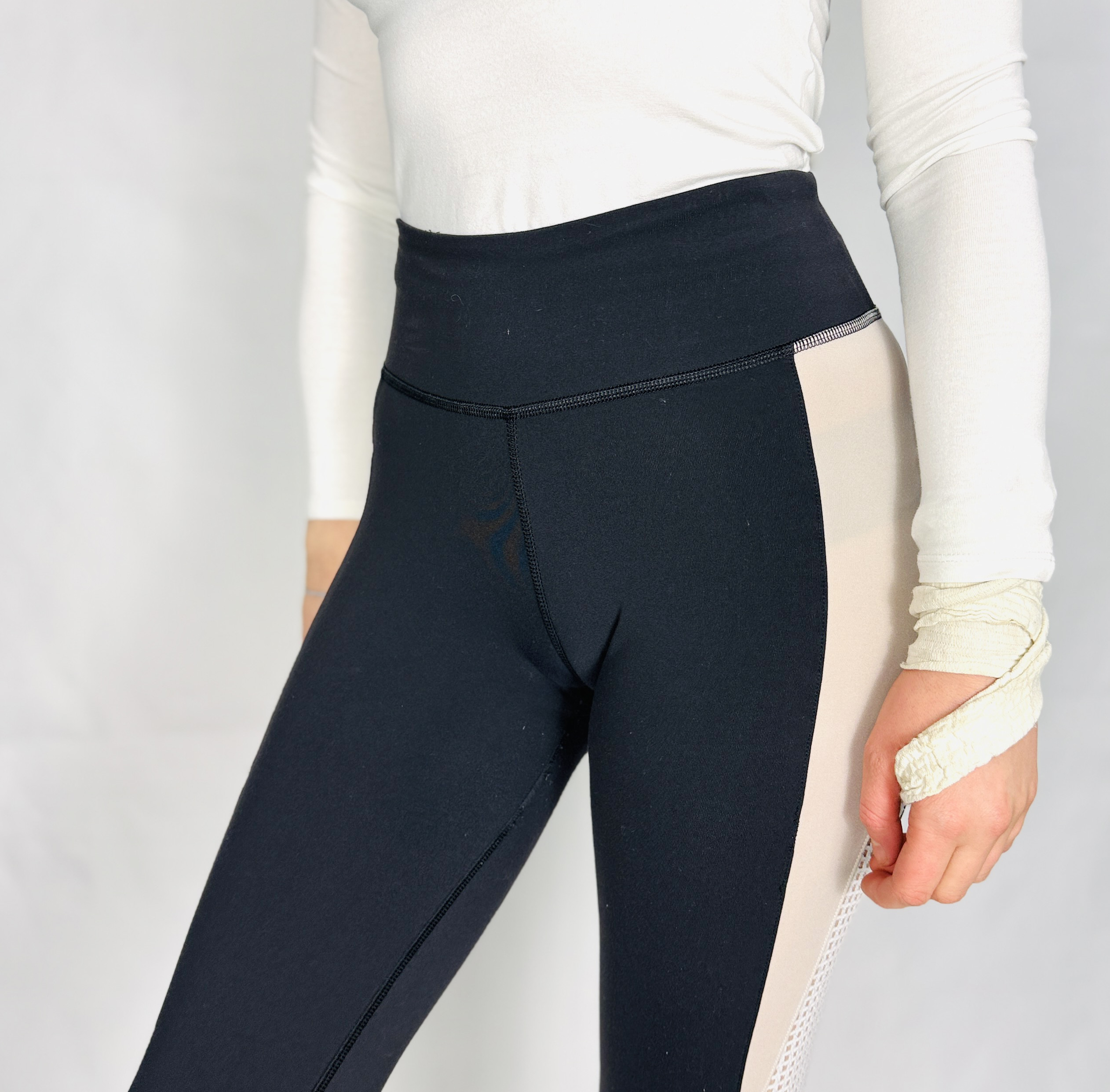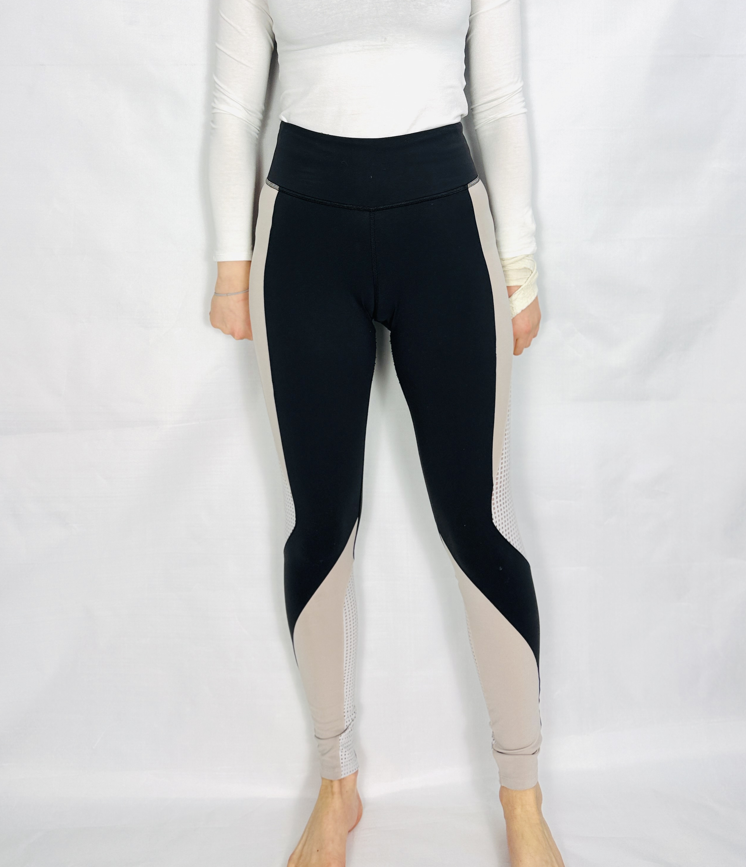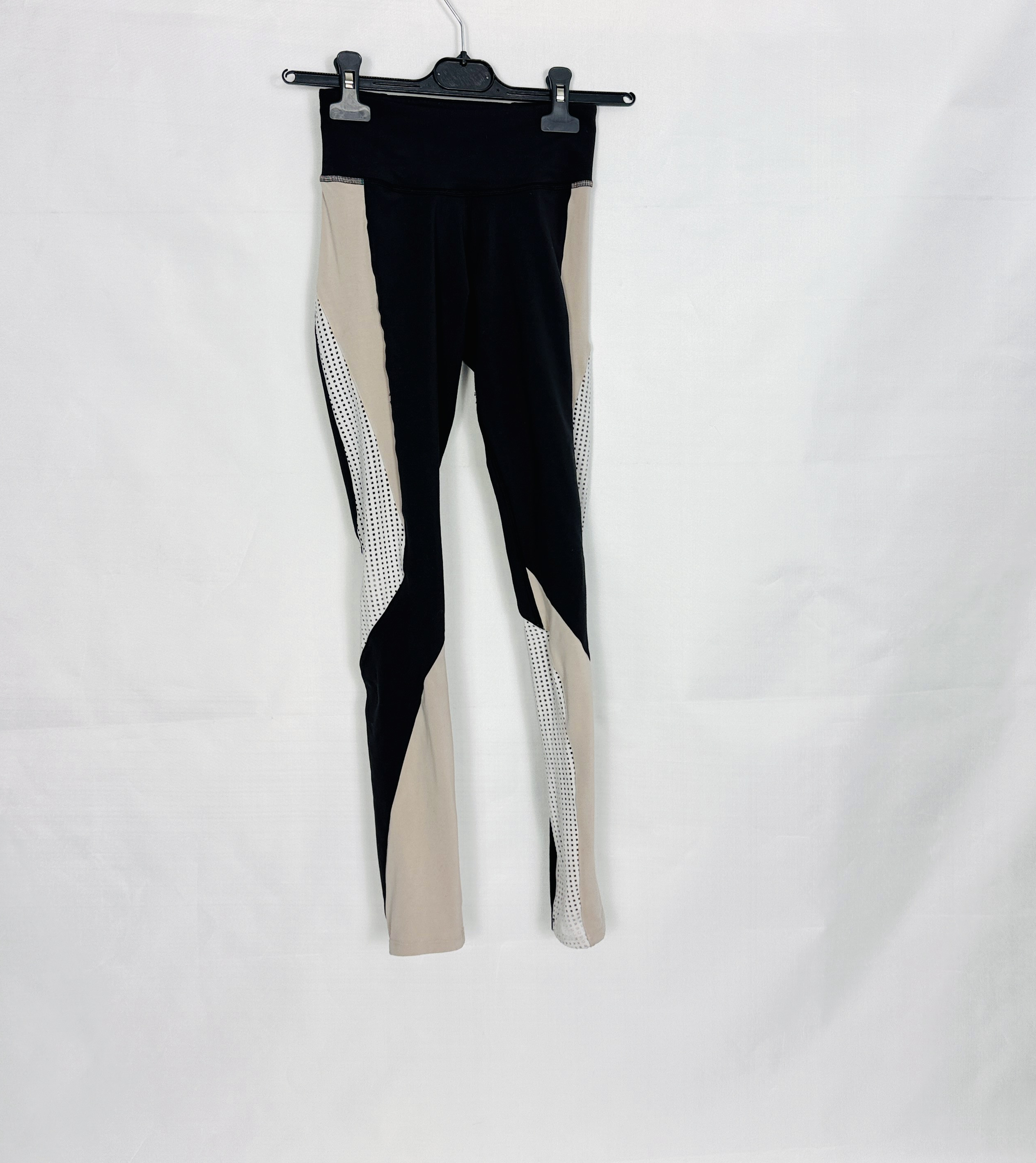Te legginsy to połączenie sportowej funkcjonalności i nowoczesnej estetyki — kontrastowe panele w czerni i beżu z jasnymi, perforowanymi wstawkami nadają im dynamicznego, designerskiego charakteru. Całość wygląda świeżo i uporządkowanie, a jednocześnie pełna jest subtelnych detali, które podkreślają aktywny styl życia: to model, który łączy wygodę treningu z kobiecą elegancją w codziennych stylizacjach.