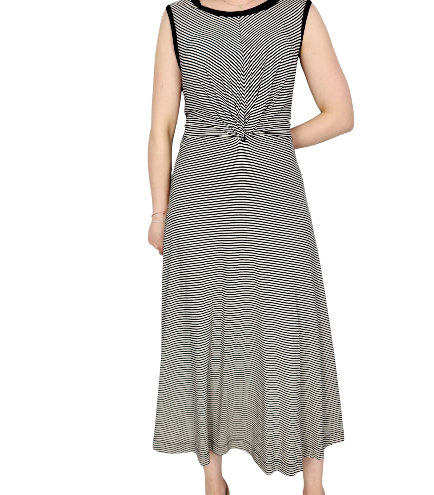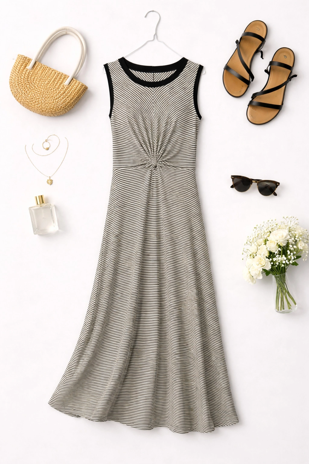 Ta długa sukienka w paski to połączenie klasycznej elegancji z lekką, letnią swobodą. Kontrast czerni i bieli tworzy ponadczasowy efekt, który nigdy nie wychodzi z mody, a subtelny układ linii nadaje całości nowoczesnego charakteru. To model, który przyciąga uwagę prostotą, ale jednocześnie zachwyca dopracowanym krojem i kobiecą formą.
