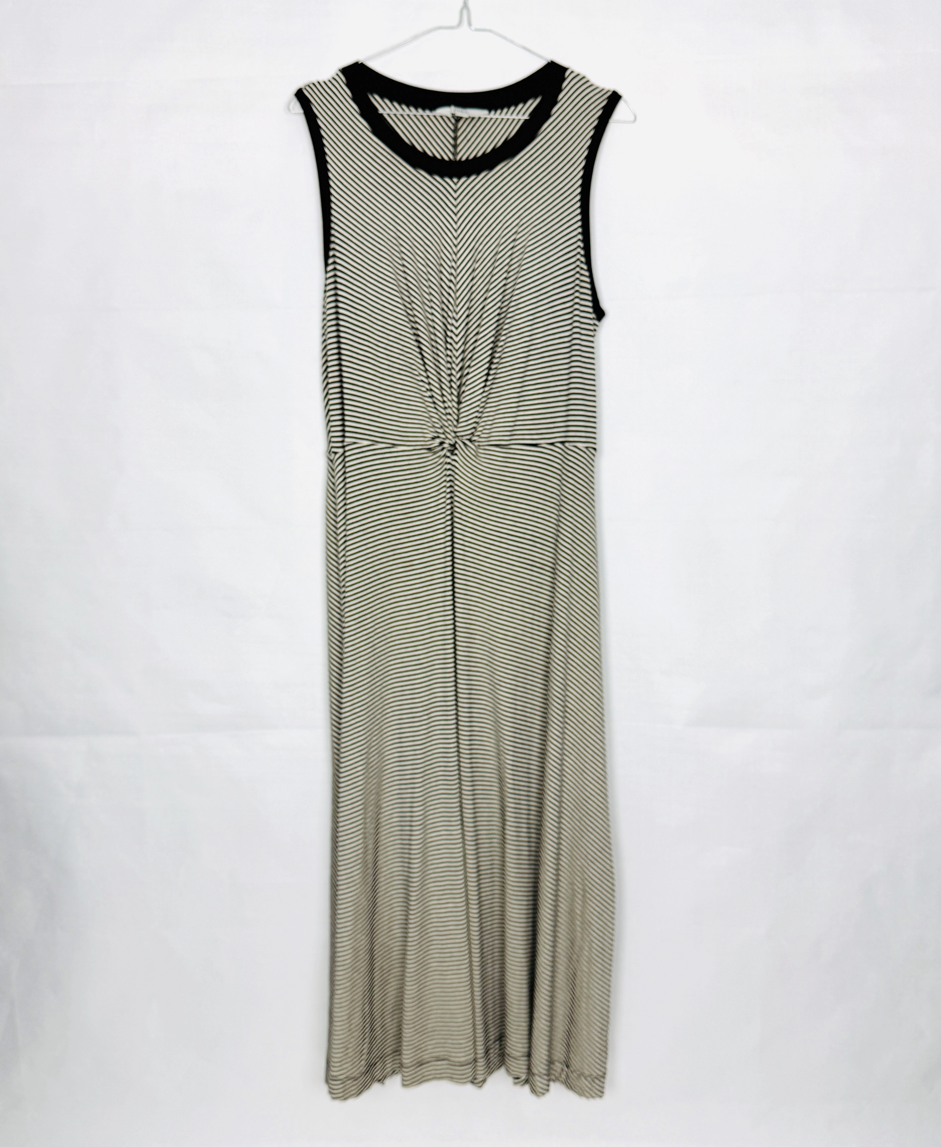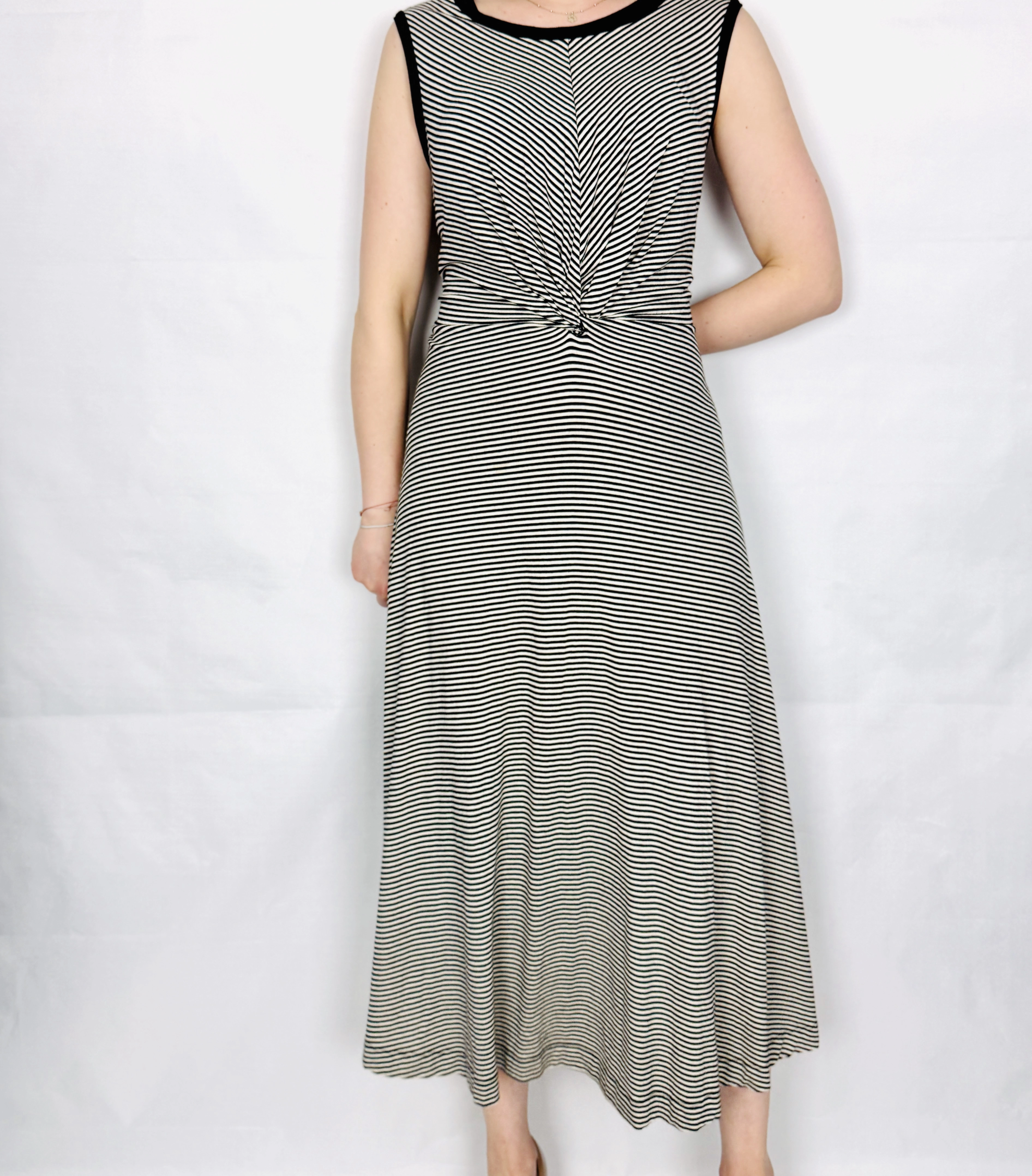 Dół sukienki swobodnie opada w długości maxi, tworząc lekką, falującą linię, która pięknie porusza się przy każdym kroku. Poziome paski na całej długości nadają jej rytmicznego charakteru, a jednocześnie w połączeniu z odpowiednim krojem nie zaburzają proporcji sylwetki. Materiał wygląda na miękki, elastyczny i przyjemnie układający się na ciele, co zapewnia komfort noszenia.