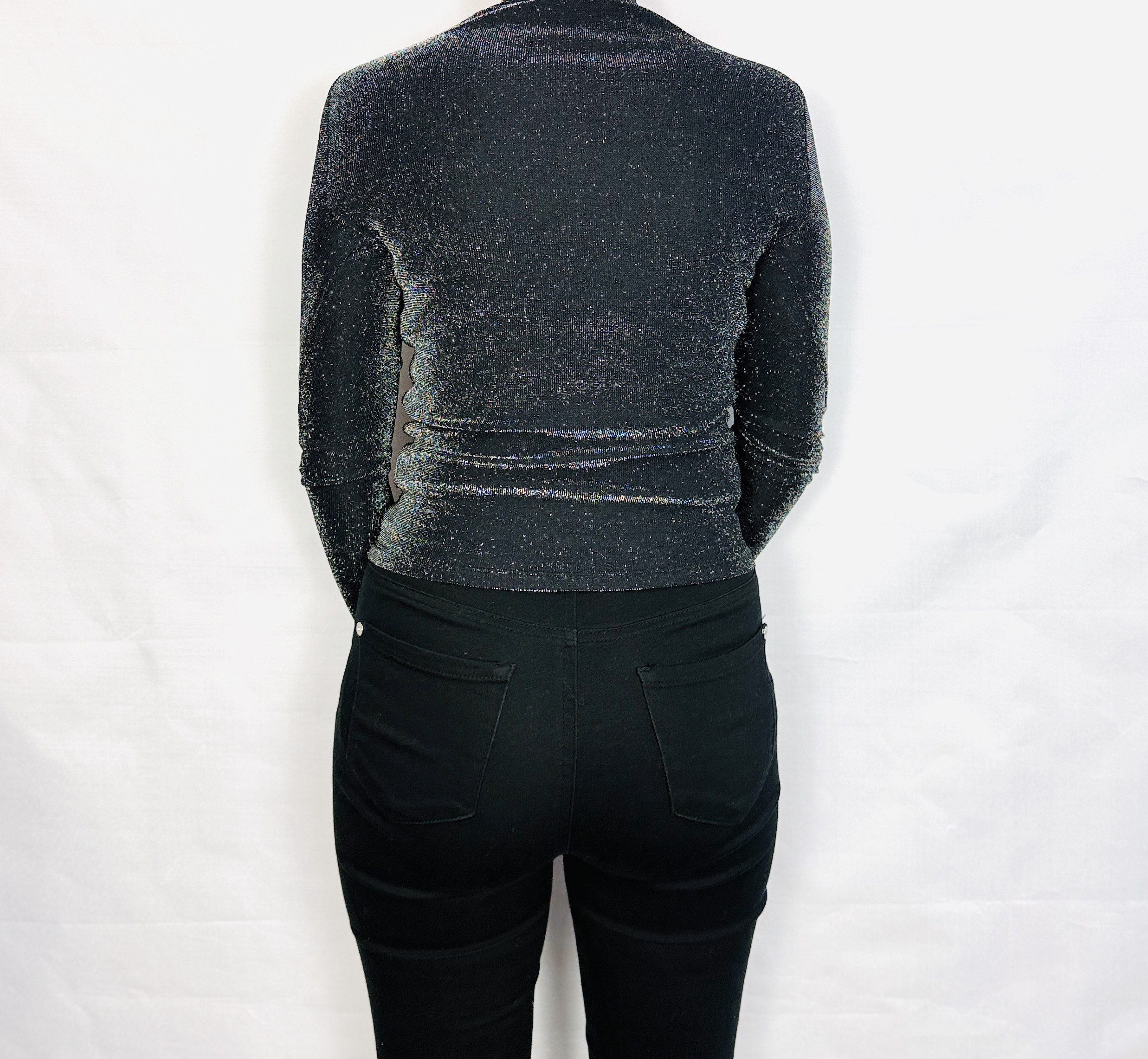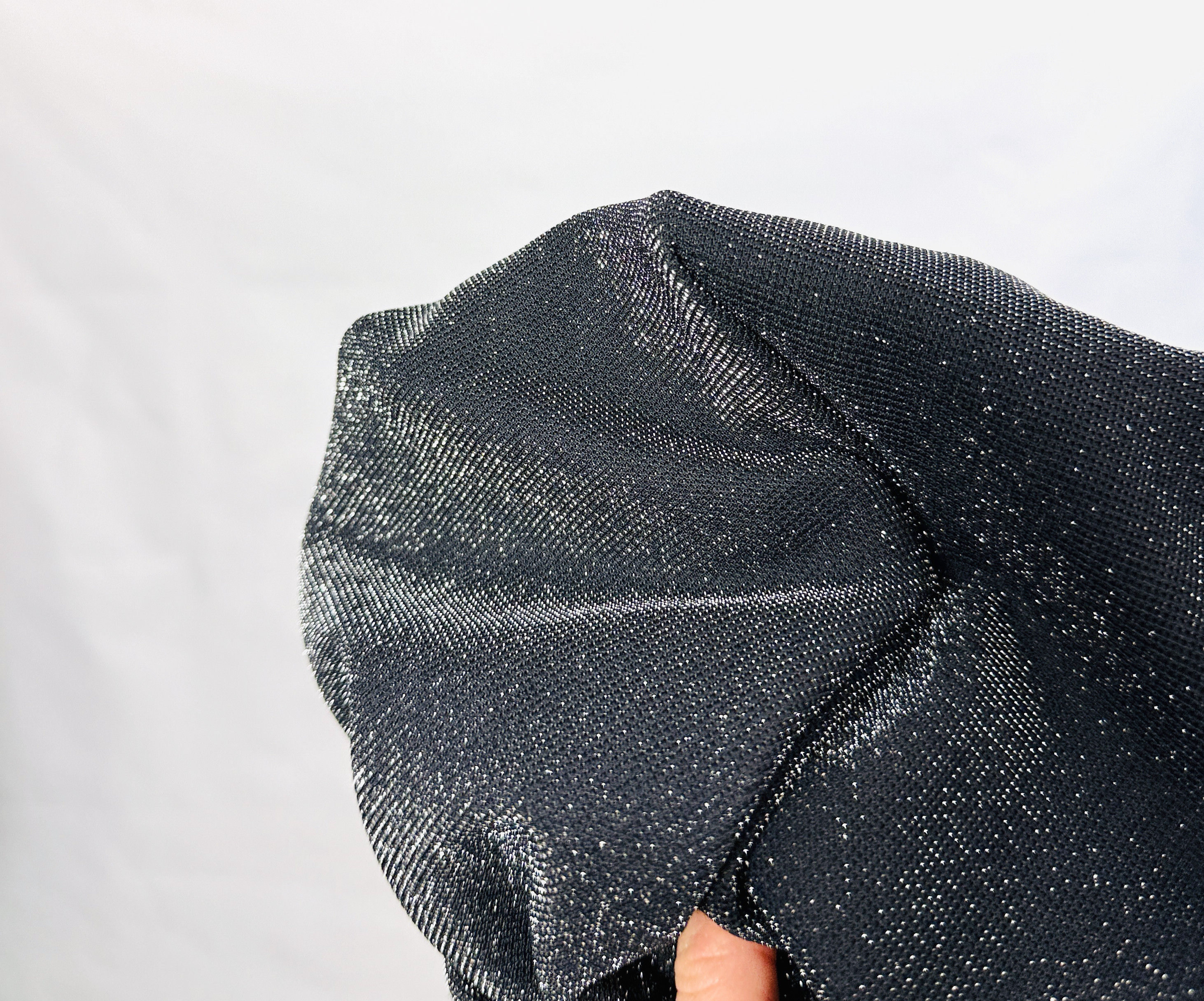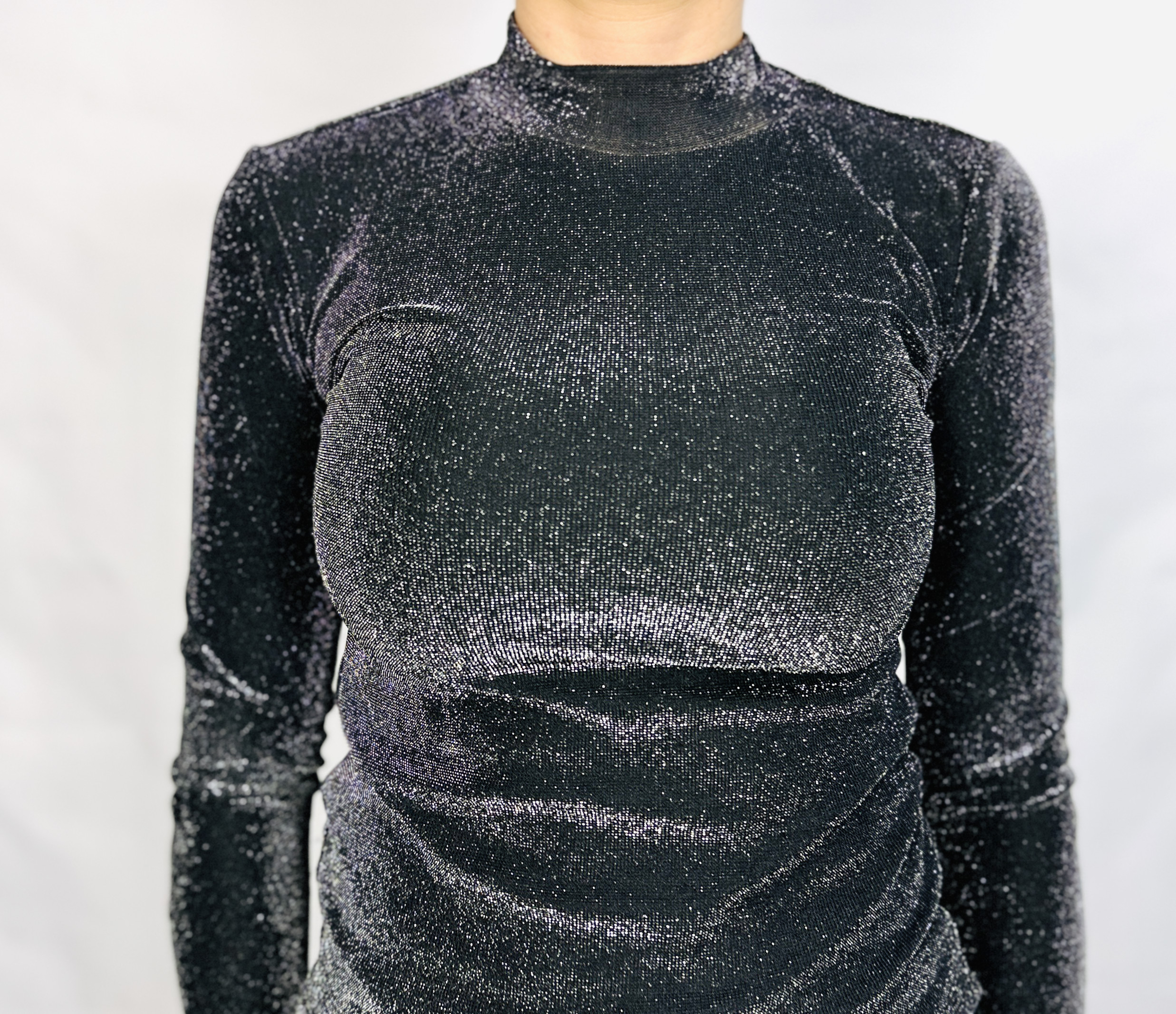 Materiał prezentuje się jako gładki, delikatnie połyskujący i subtelnie brokatowy, z drobnymi, równomiernie rozłożonymi refleksami, które odbijają światło w elegancki sposób. Tkanina wygląda na miękko układającą się i lekko dopasowującą do kształtów, tworząc naturalne fałdy, szczególnie w partiach, gdzie ciało pracuje w ruchu. Dzięki temu bluzka zachowuje komfort noszenia, jednocześnie eksponując sylwetkę w sposób stonowany i gustowny.