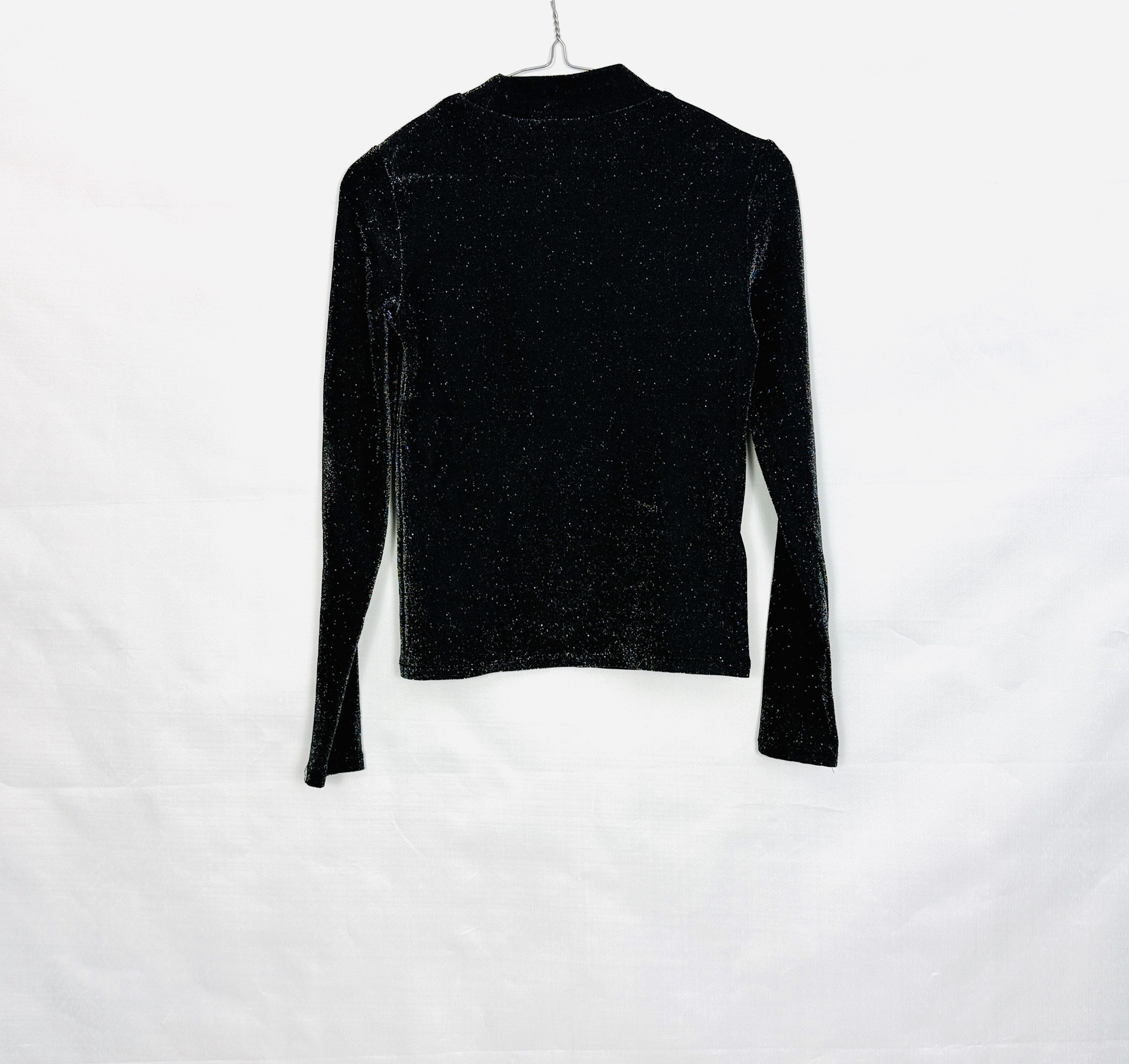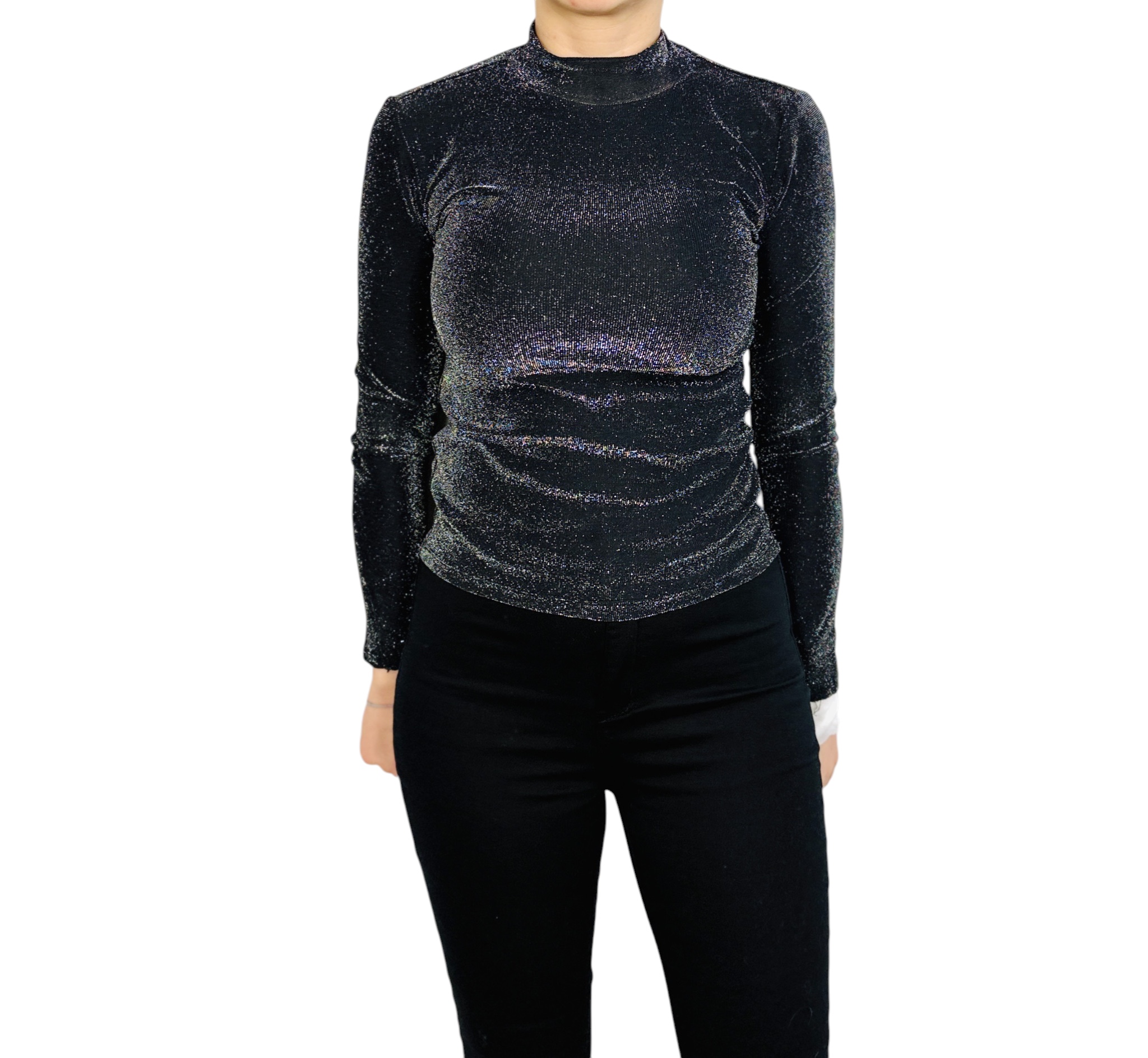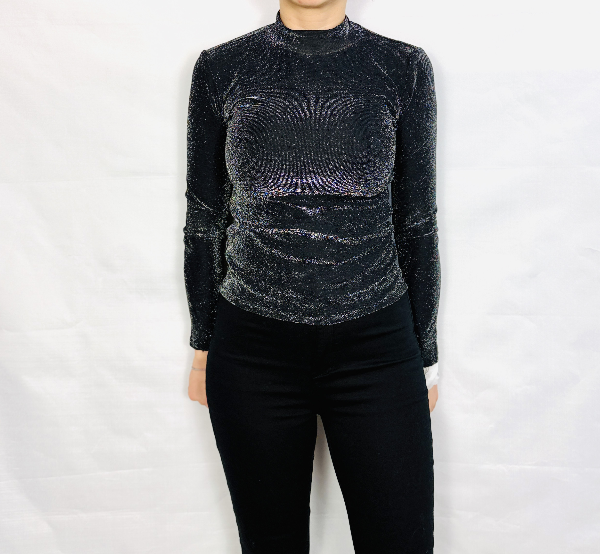 Materiał prezentuje się jako gładki, delikatnie połyskujący i subtelnie brokatowy, z drobnymi, równomiernie rozłożonymi refleksami, które odbijają światło w elegancki sposób. Tkanina wygląda na miękko układającą się i lekko dopasowującą do kształtów, tworząc naturalne fałdy, szczególnie w partiach, gdzie ciało pracuje w ruchu. Dzięki temu bluzka zachowuje komfort noszenia, jednocześnie eksponując sylwetkę w sposób stonowany i gustowny.