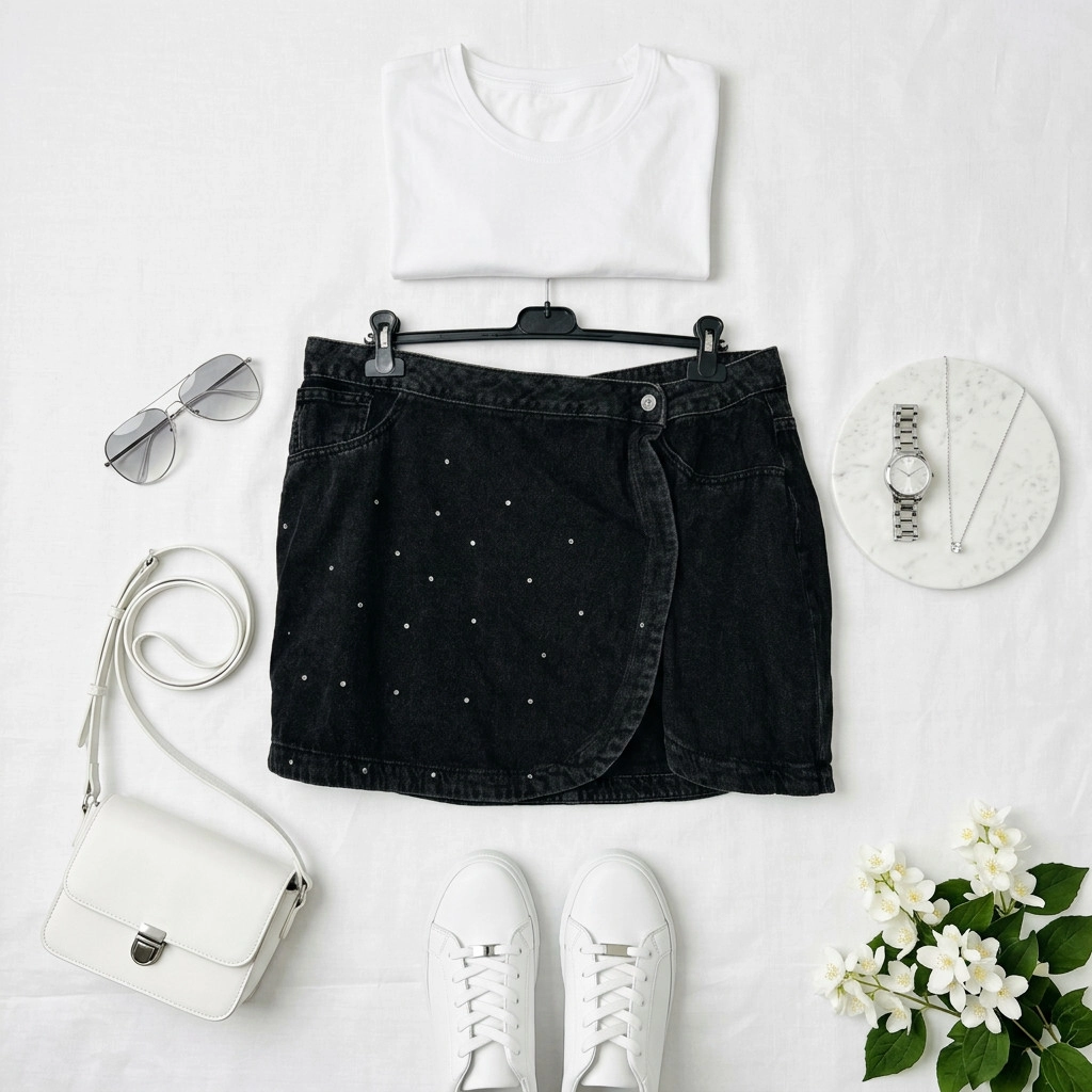 Ta spódnica to subtelne połączenie młodzieńczej swobody i eleganckiej surowości — szara, jeansowa tonacja z delikatnym spraniem nadaje jej spokojnego, nieprzesadzonego charakteru, a rozłożyste linie przynoszą przyjemne uczucie lekkości. Projekt ma w sobie naturalną świeżość: jest kobieca, ale zarazem bardzo codzienna, gotowa by stać się ulubionym elementem garderoby na wiele okazji. Minimalistyczna forma z ozdobnym akcentem daje wrażenie starannie przemyślanej prostoty.