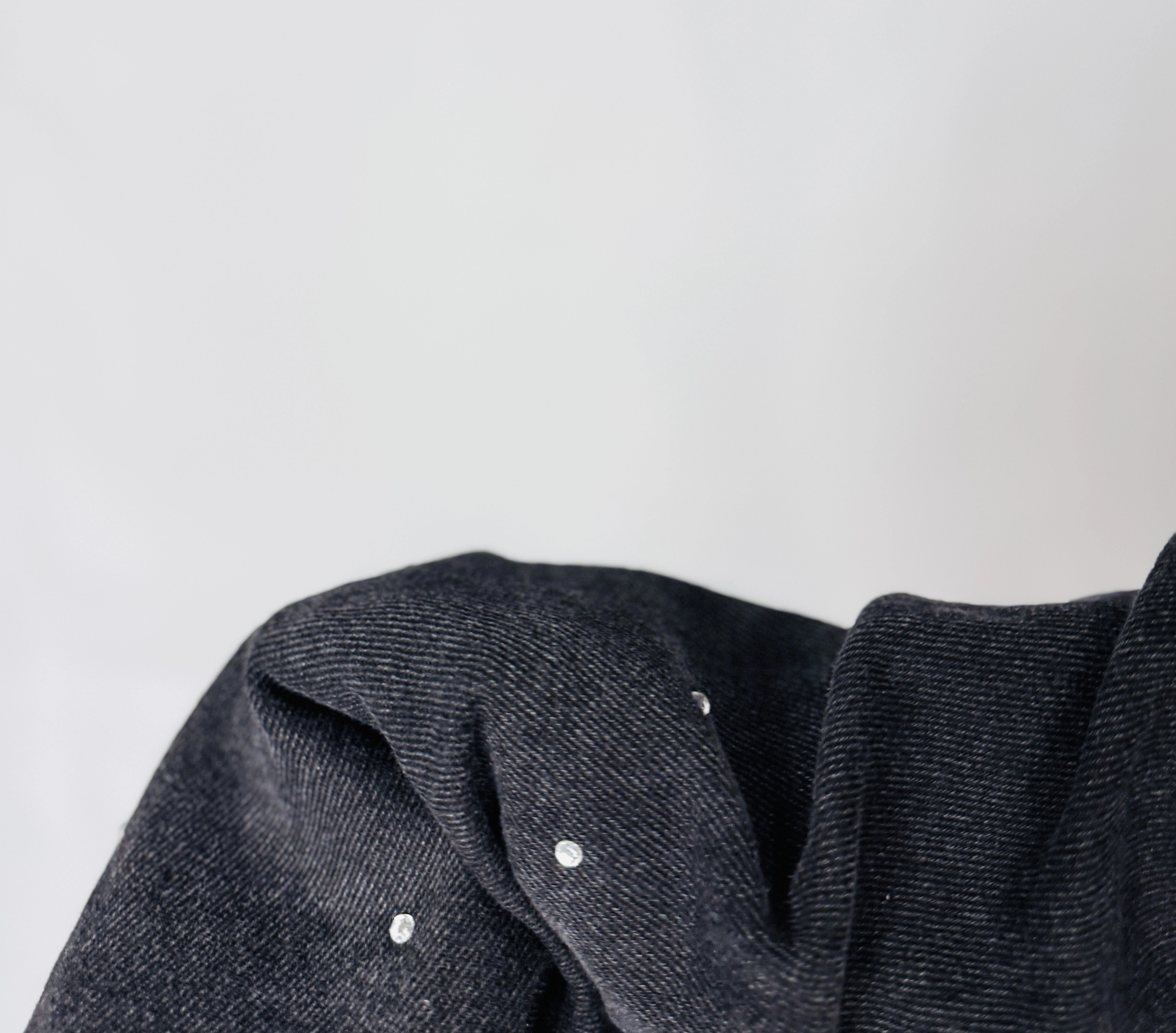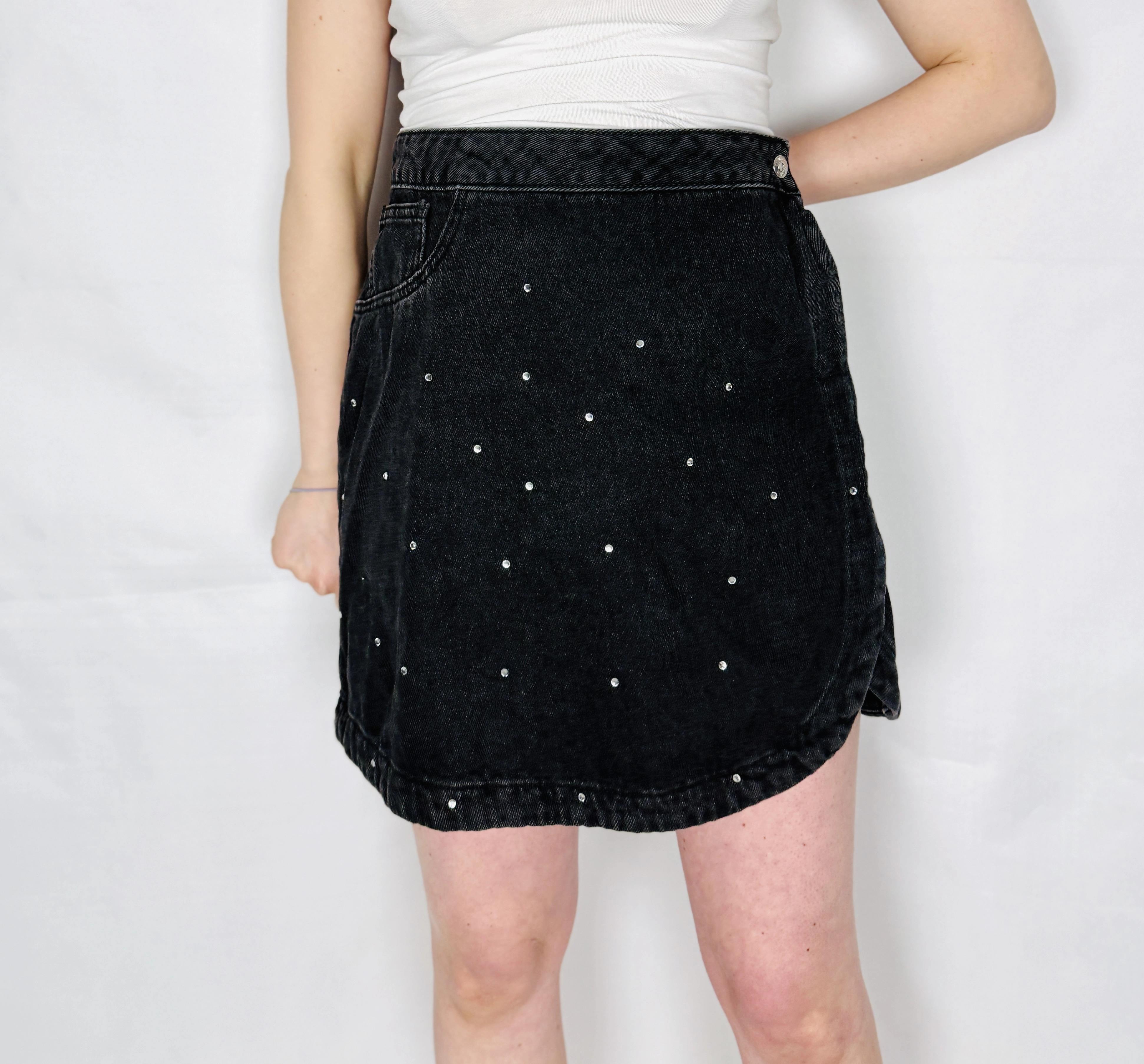 Krój opiera się na klasycznej linii mini z lekko zaokrąglonym dołem, który tworzy subtelne, miękkie fałdy i pięknie porusza się przy kroku. Wokół talii spódnica zachowuje zwartą, uporządkowaną linię, a przód zdobią praktyczne kieszenie dodające odrobiny funkcjonalnego charakteru. Najbardziej rozpoznawalnym detalem są niewielkie, srebrzyste ćwieki rozrzucone równomiernie po przedniej części — to drobny, błyszczący akcent, który przełamuje surowość szarego koloru i wprowadza nutę rockowego szyku bez nadmiaru.