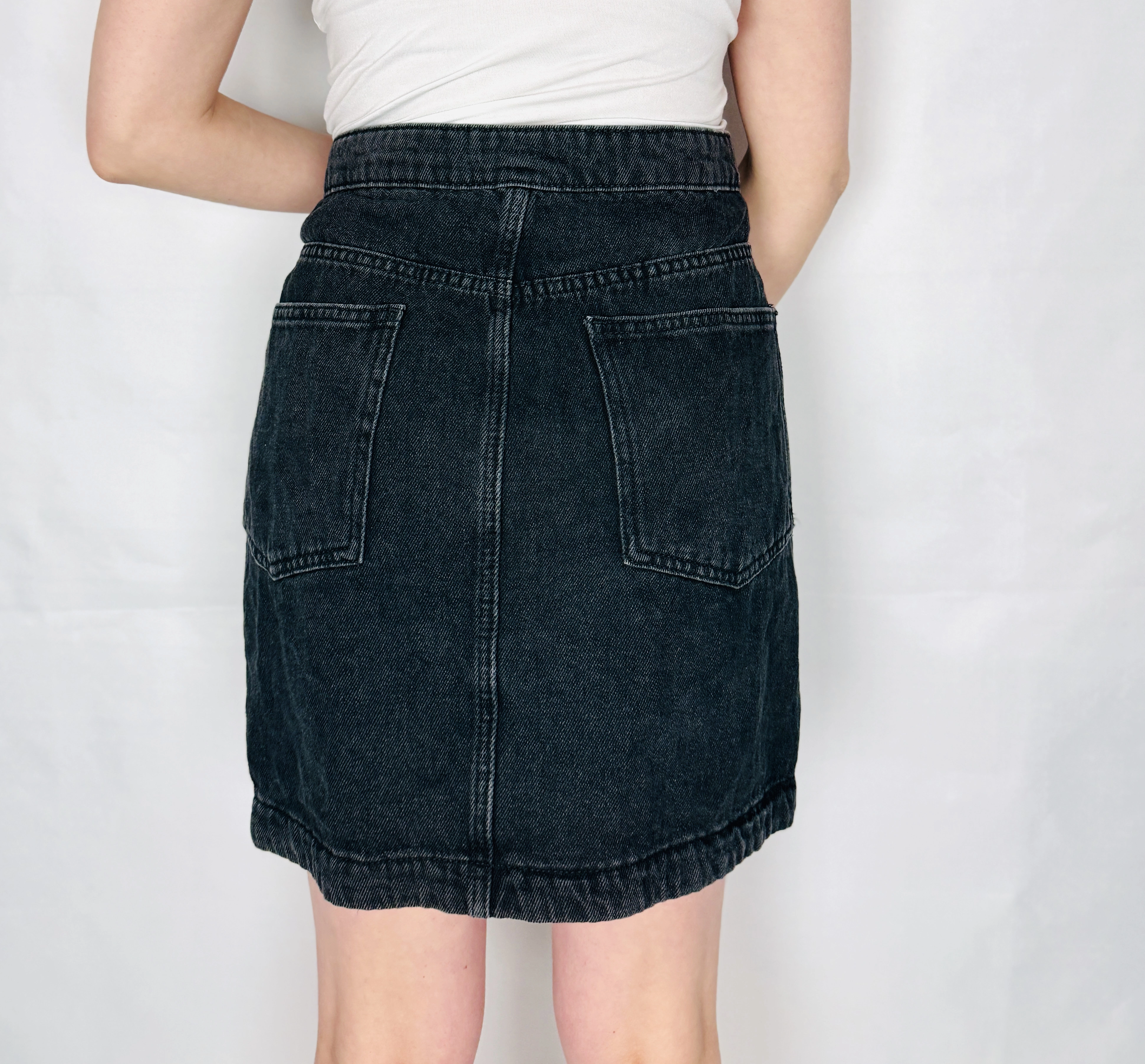 Materiał prezentuje się jako stosunkowo gęsty i lekko zmatowiony, o typowej, nieco surowej teksturze jeansu; powierzchnia ma delikatne przejaśnienia, a przy zgięciach powstają estetyczne marszczenia, które dodają całości autentycznego, codziennego uroku. Taki krój daje poczucie formy w talii, a jednocześnie nie ogranicza ruchu w biodrach, co sprawia, że spódnica jest wygodna w noszeniu przez cały dzień.