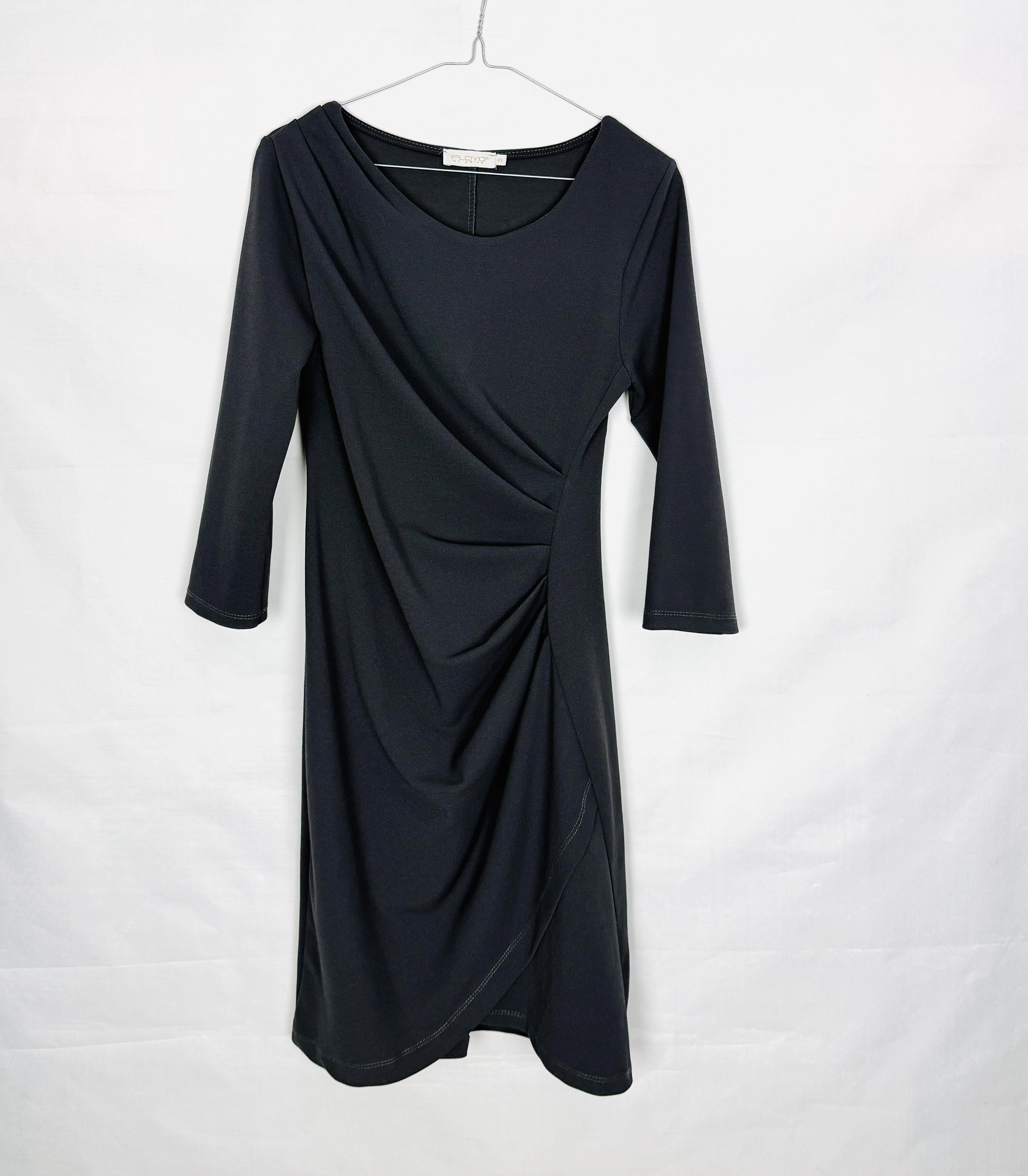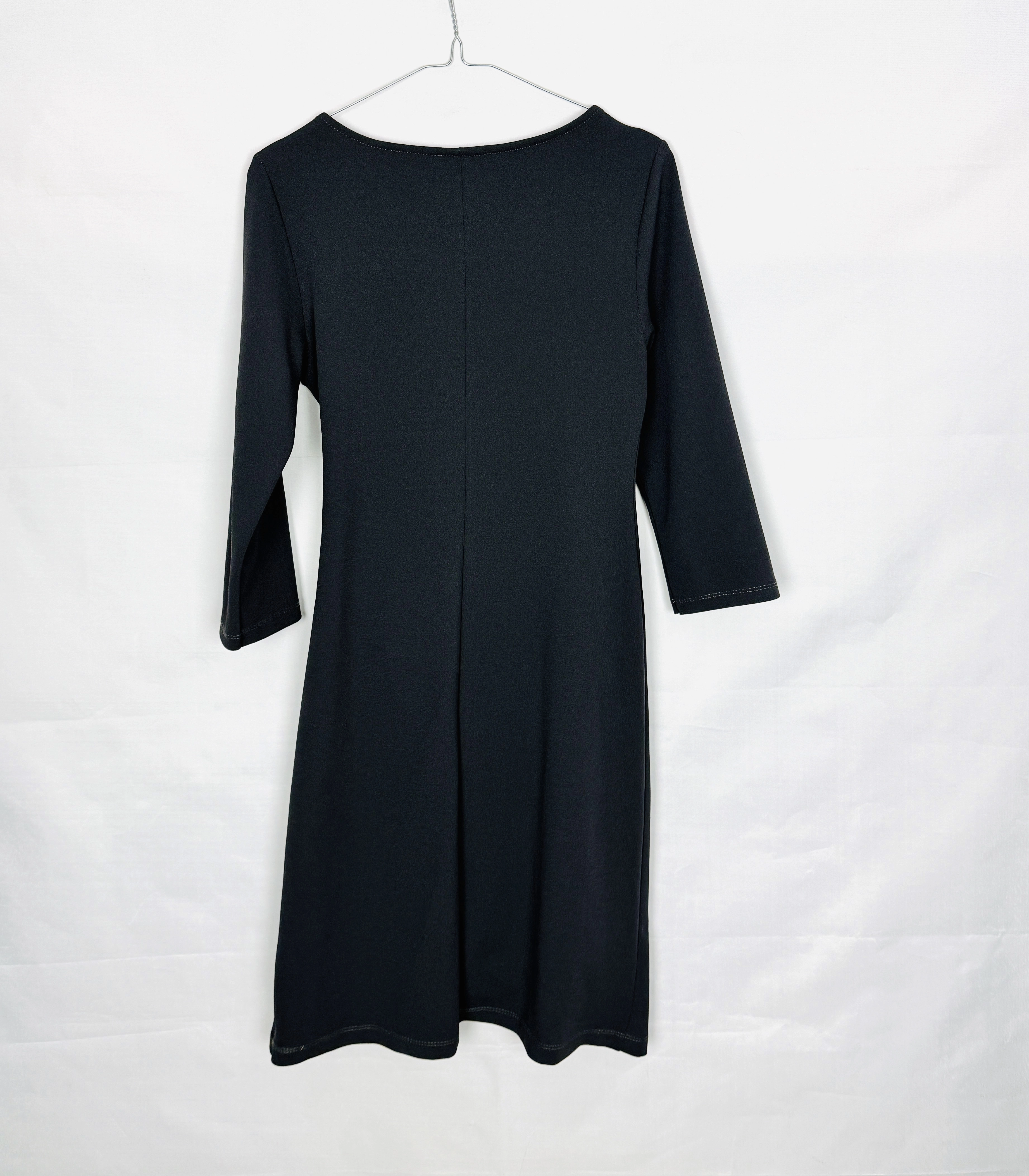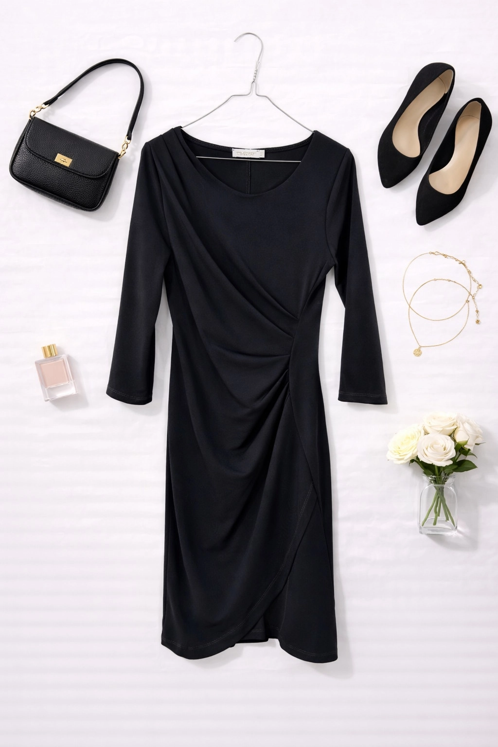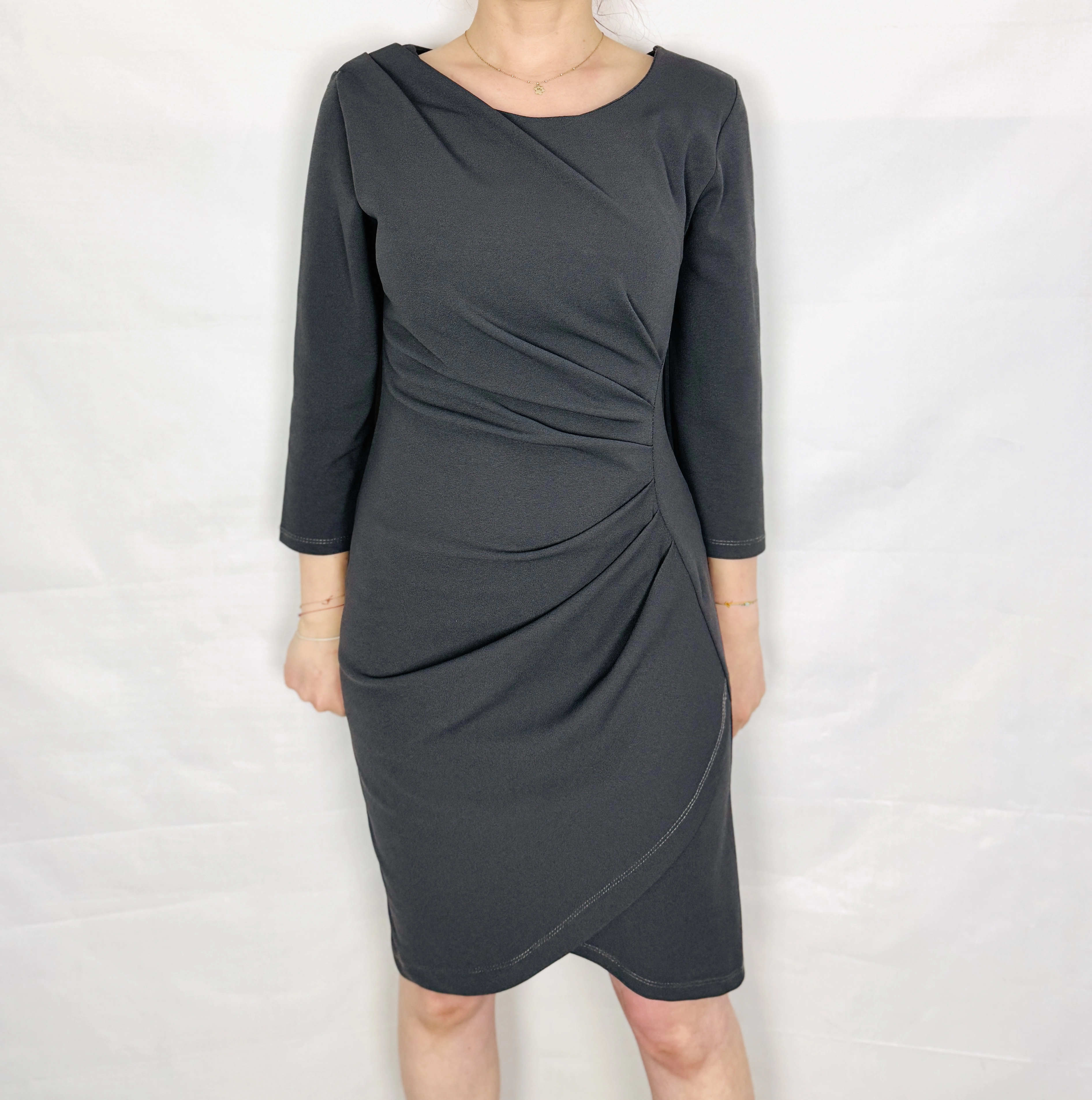 Fason sukienki jest dopasowany i pięknie podkreśla sylwetkę, akcentując talię oraz biodra. Dekolt ma łagodną, zaokrągloną linię z subtelnym, miękko układającym się drapowaniem, które dodaje objętości w górnej części i przyciąga uwagę w elegancki sposób. Rękawy o długości za łokieć nadają całości harmonii i sprawiają, że model sprawdzi się w różnych porach roku.