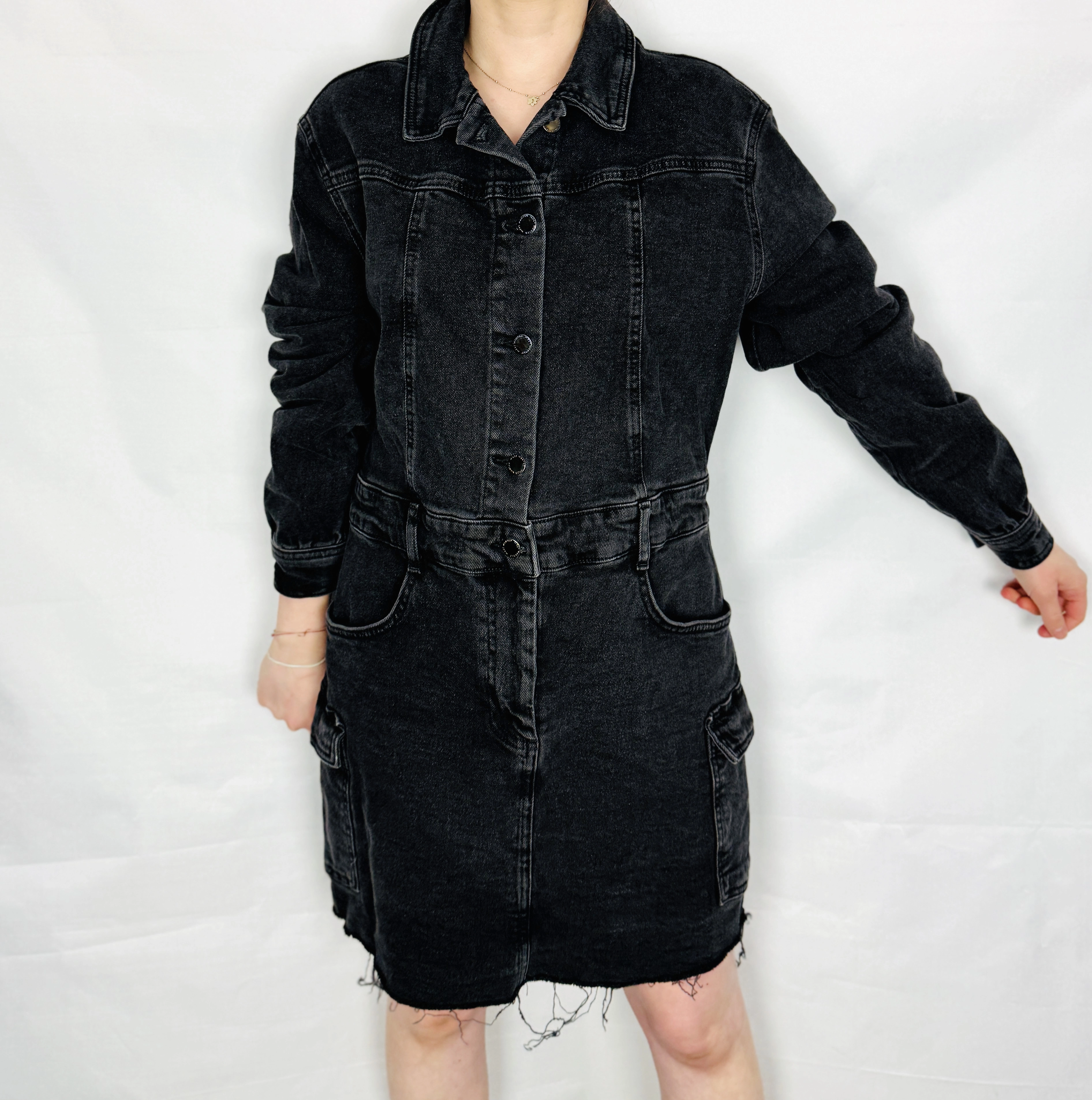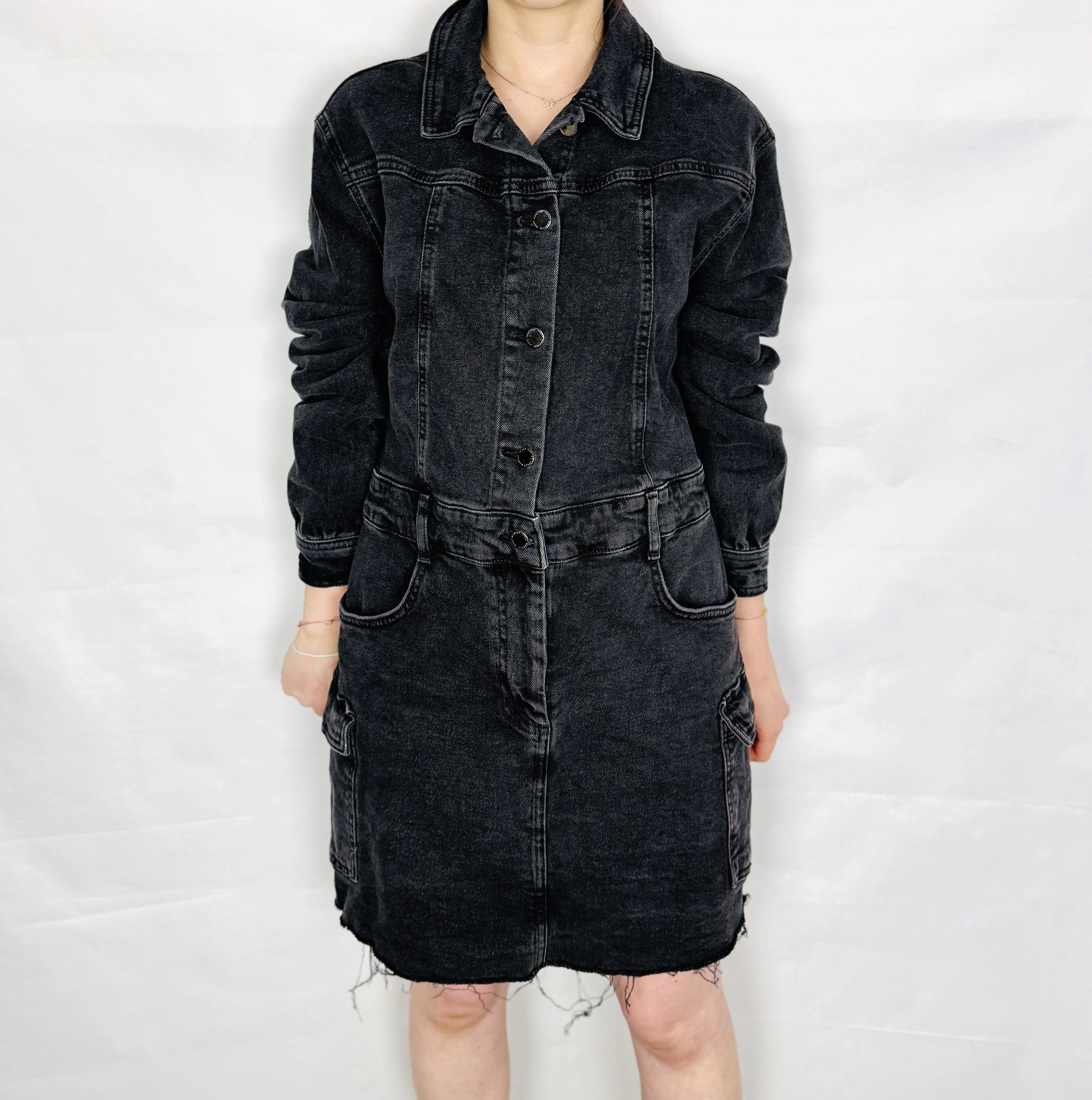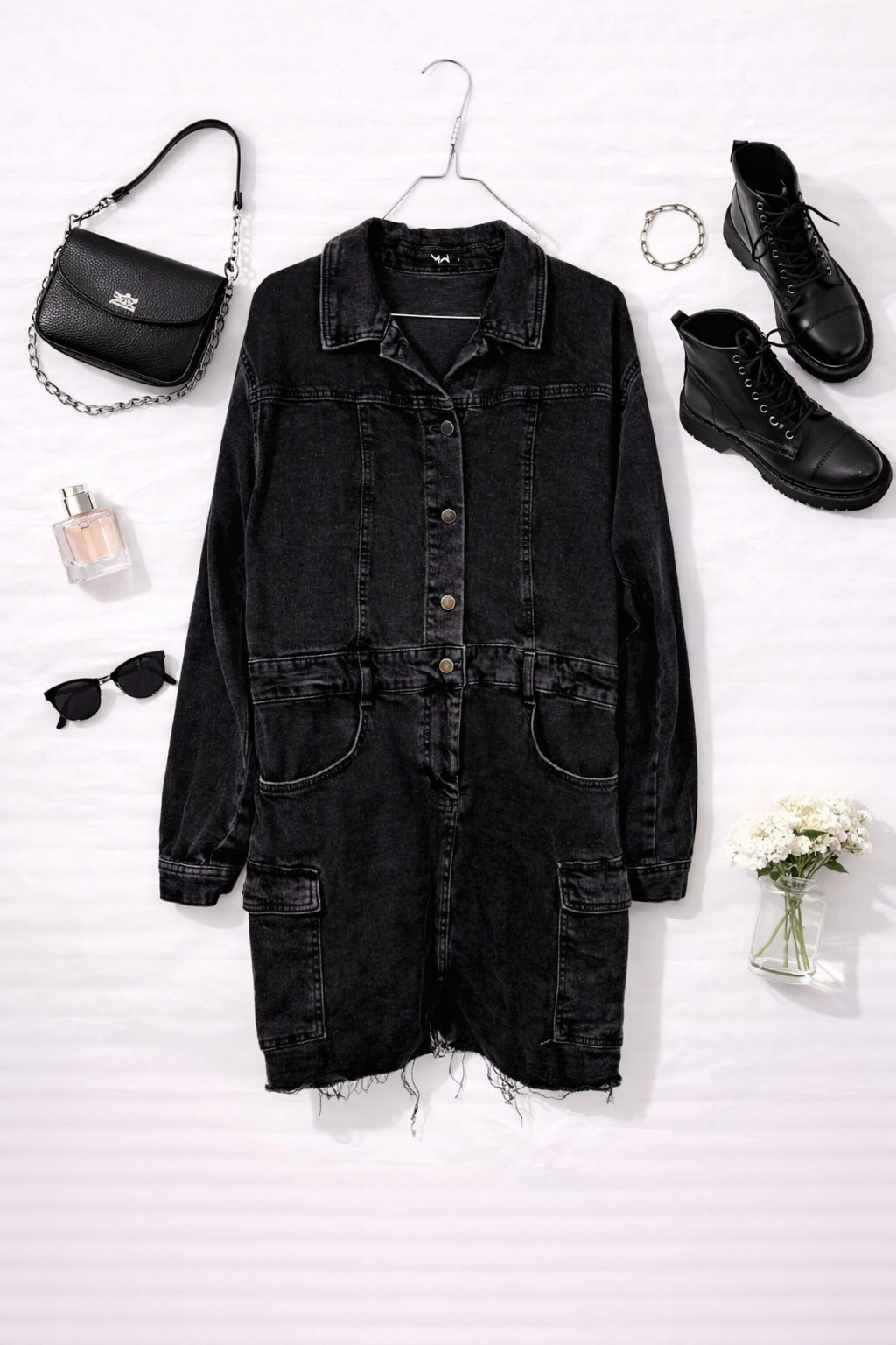 Ta szara sukienka jeansowa to połączenie casualowego luzu z wyraźnie zarysowaną, kobiecą formą. Ciemniejszy, sprany odcień szarości nadaje jej charakteru i lekko surowego, miejskiego stylu, który świetnie wpisuje się w nowoczesne, codzienne stylizacje. To model, który łączy wygodę z wyrazistym designem i ponadczasową estetyką denimu.