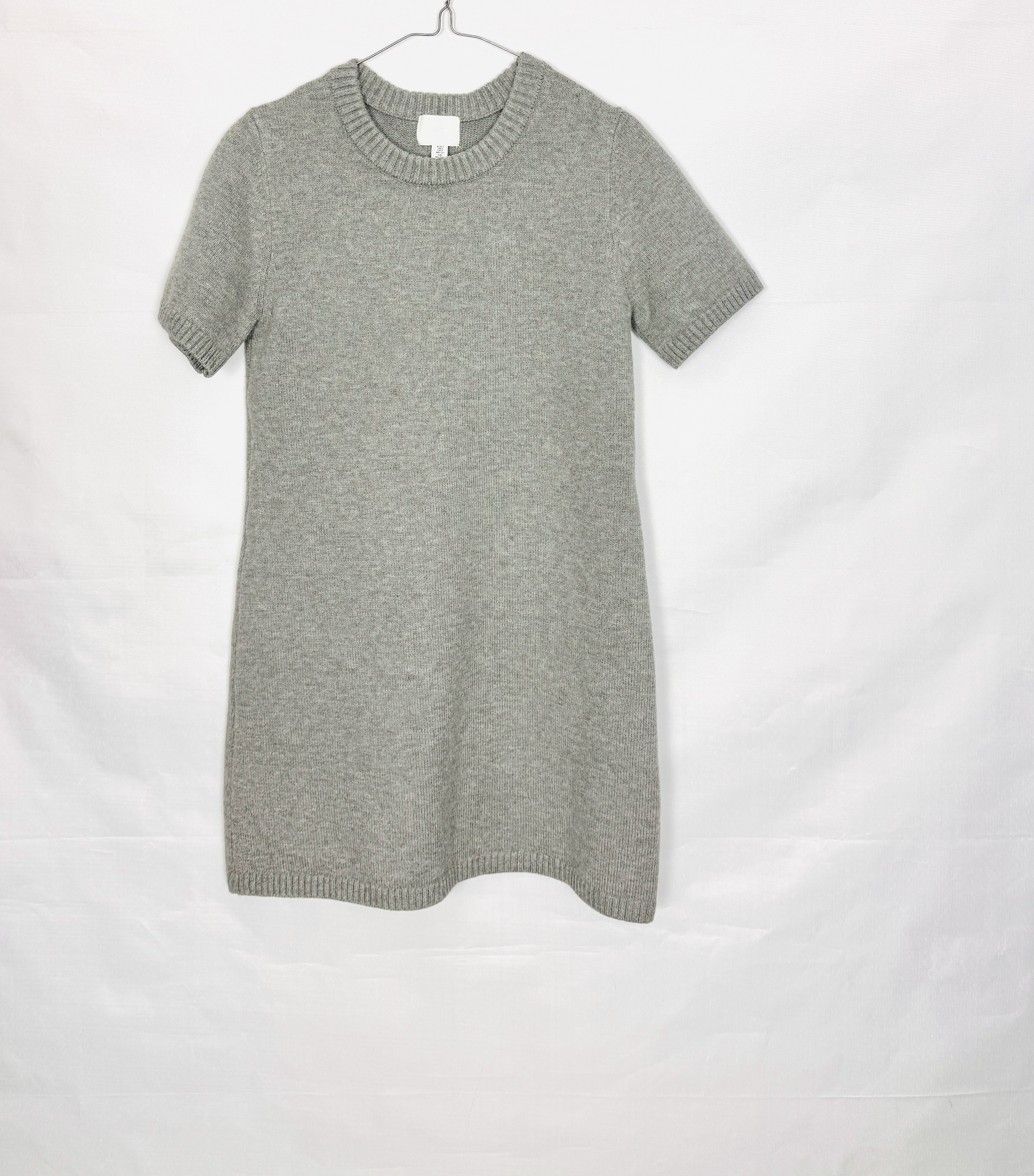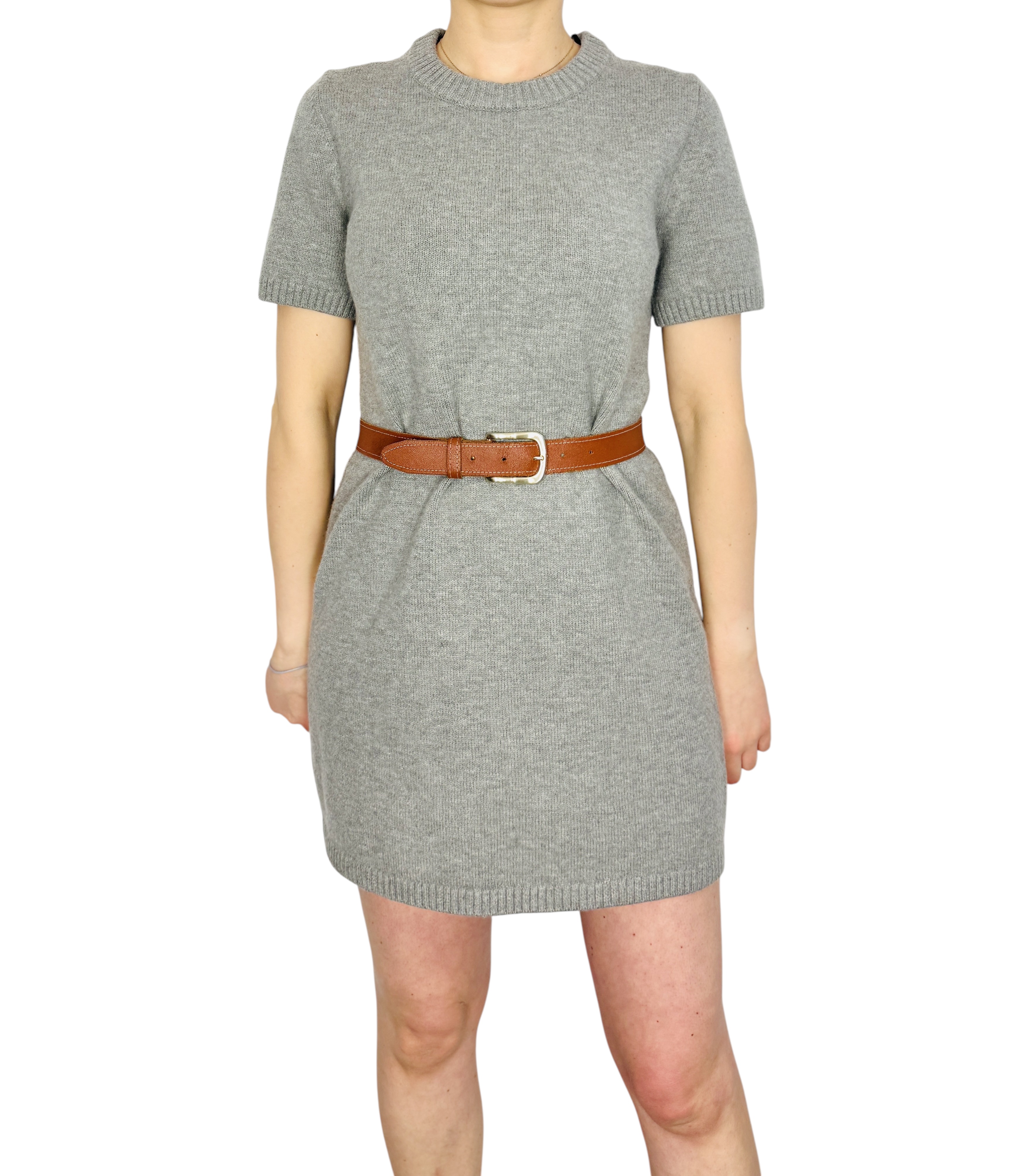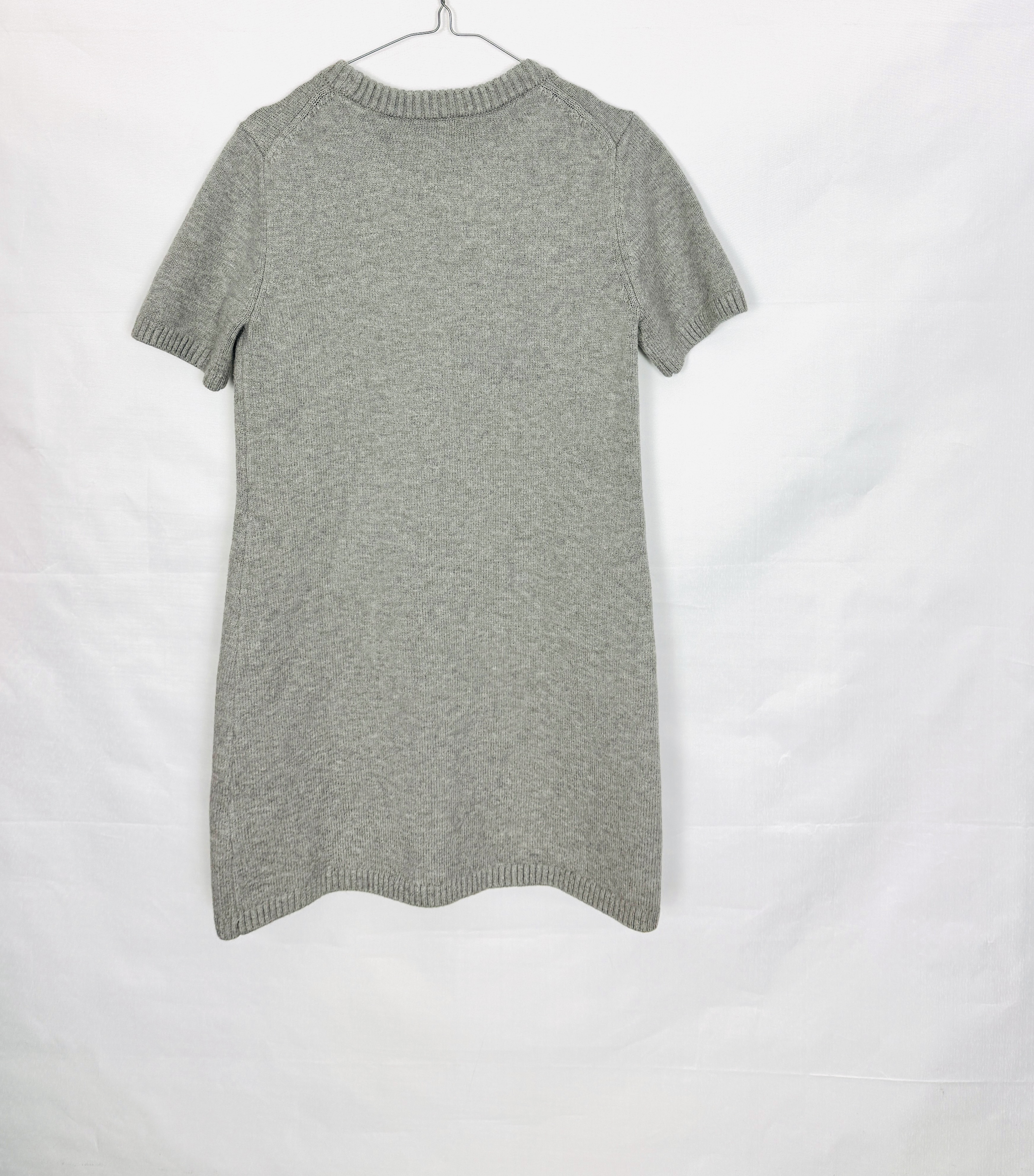 Spódnica ma krótką długość, wyraźnie ponad kolano, co wysmukla nogi i nadaje stylowi świeżości. Linia sukienki jest prosta, lekko układająca się w biodrach, dzięki czemu całość wygląda schludnie i zharmonizowanie. Materiał prezentuje się jako miękki, sweterkowy i nieco grubszy — przyjemnie otulający, o drobnym, równomiernym splocie, który daje poczucie komfortu i subtelnej struktury. Brzeg rękawów i dół sukienki wykończone są delikatnym ściągaczem, co dodaje całości wykończeniowej jakości i podkreśla swetrowy charakter.