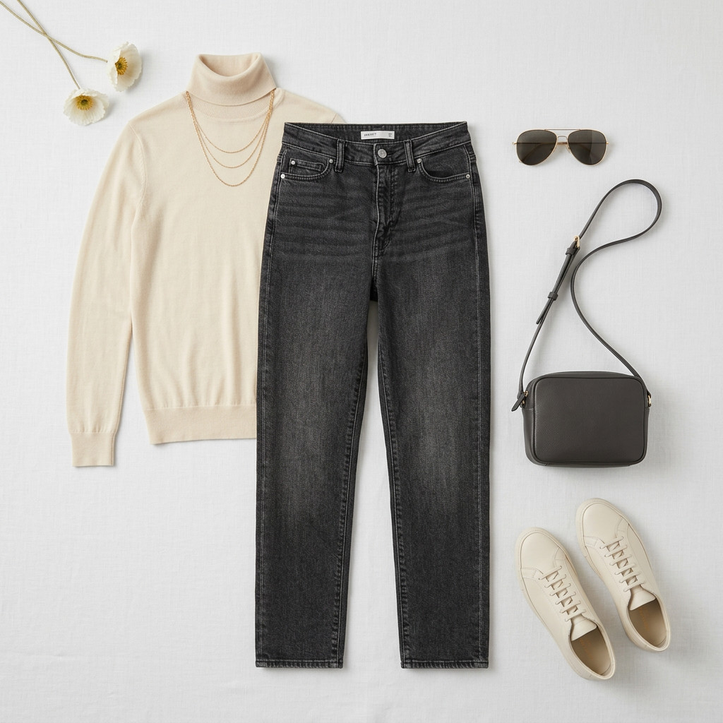 Materiał prezentuje się jako średnio grubszy denim o matowym wykończeniu — strukturalny, ale nie sztywny, miękko dopasowujący się przy ruchu. Taka faktura trzyma formę, modeluje biodra i uda, a przy tym pozwala sylwetce oddychać; jeansy nie opinają przesadnie, lecz podkreślają naturalne kontury ciała. Dzięki prostemu krojowi nogawki sylwetka zyskuje optyczne wydłużenie i wysmuklenie, a podwyższony stan pomaga zrównoważyć proporcje, co jest szczególnie korzystne dla sylwetek prostokątnych i gruszki, które chcą podkreślić talię i wydobyć harmonijną linię.