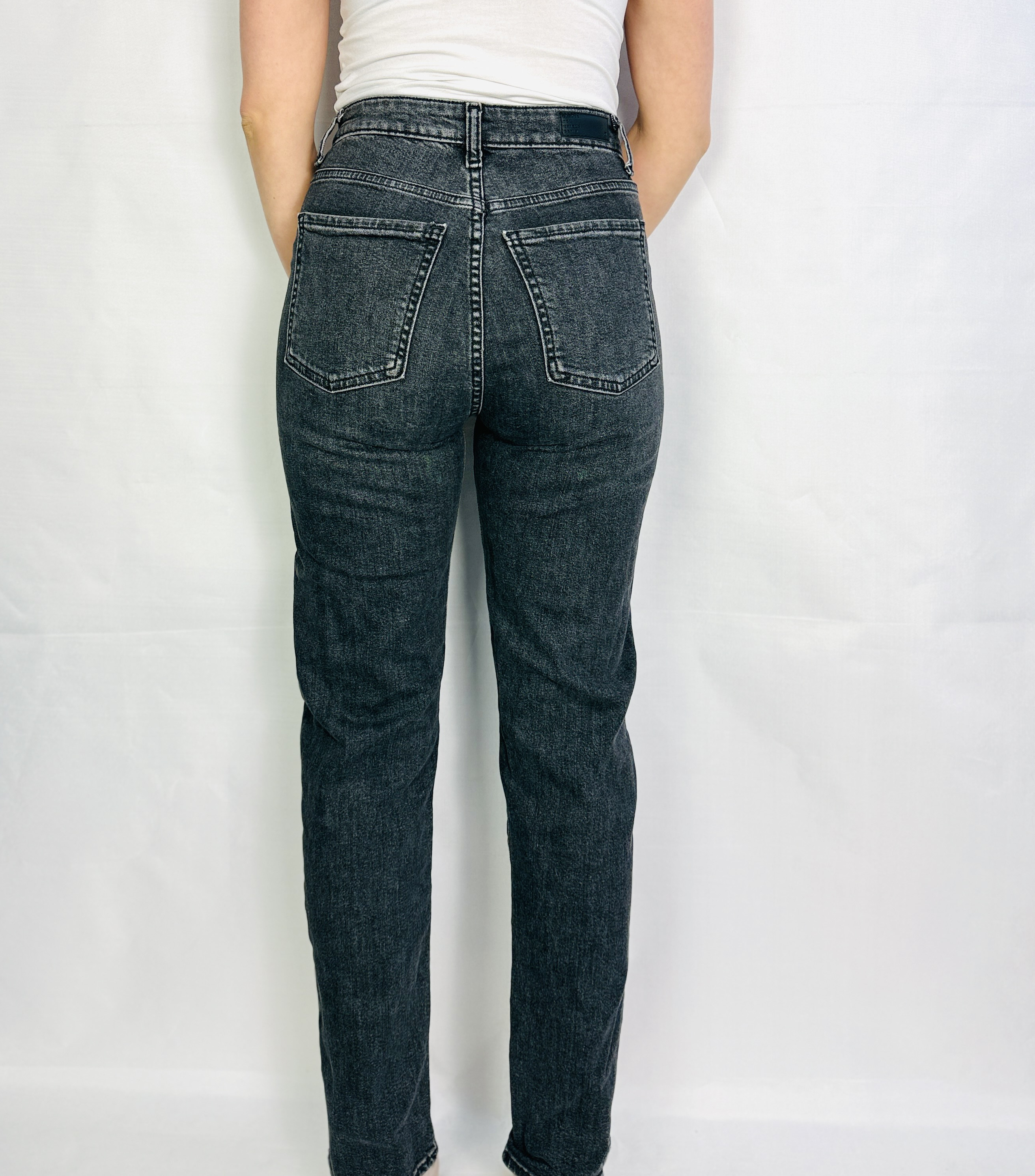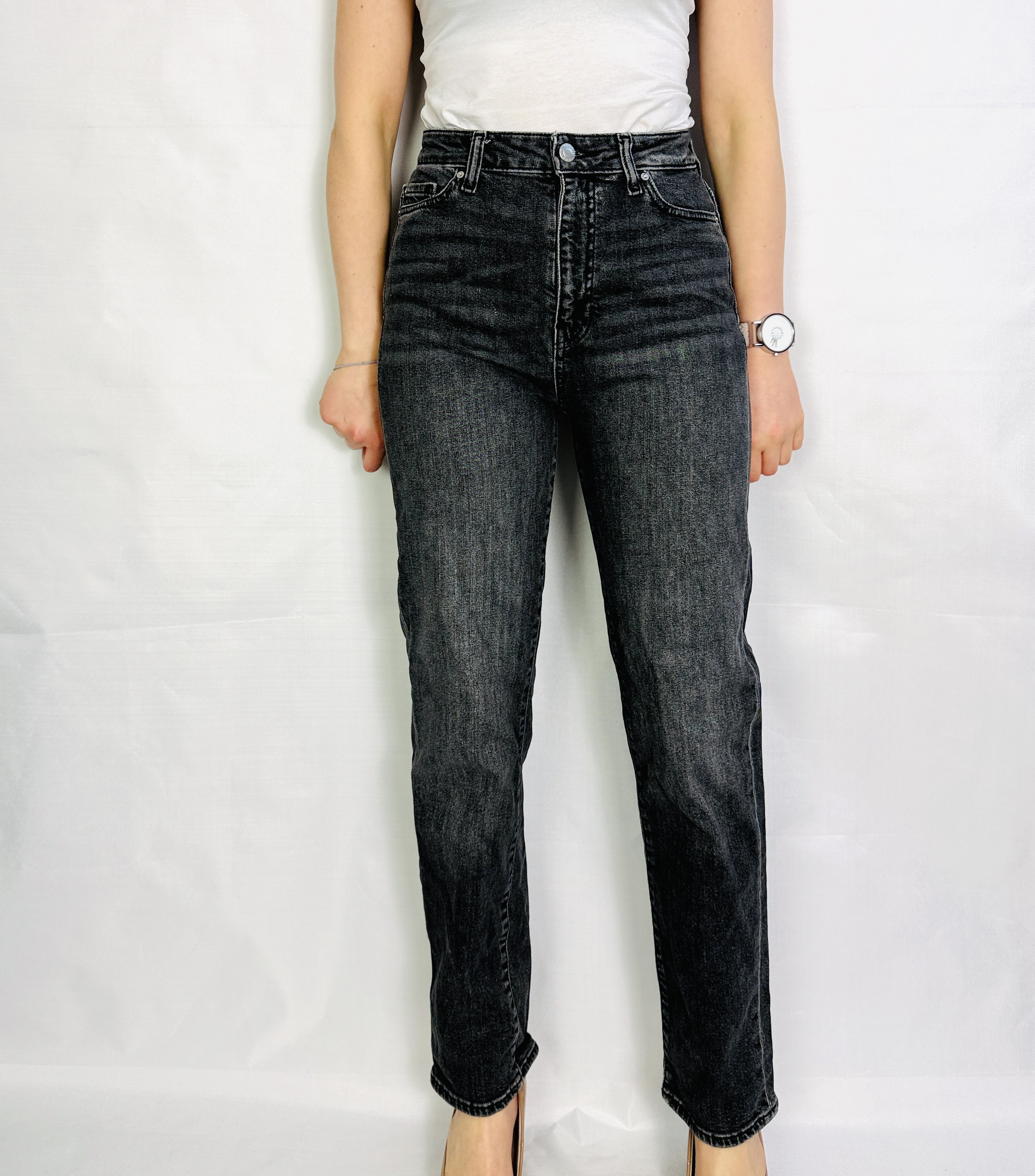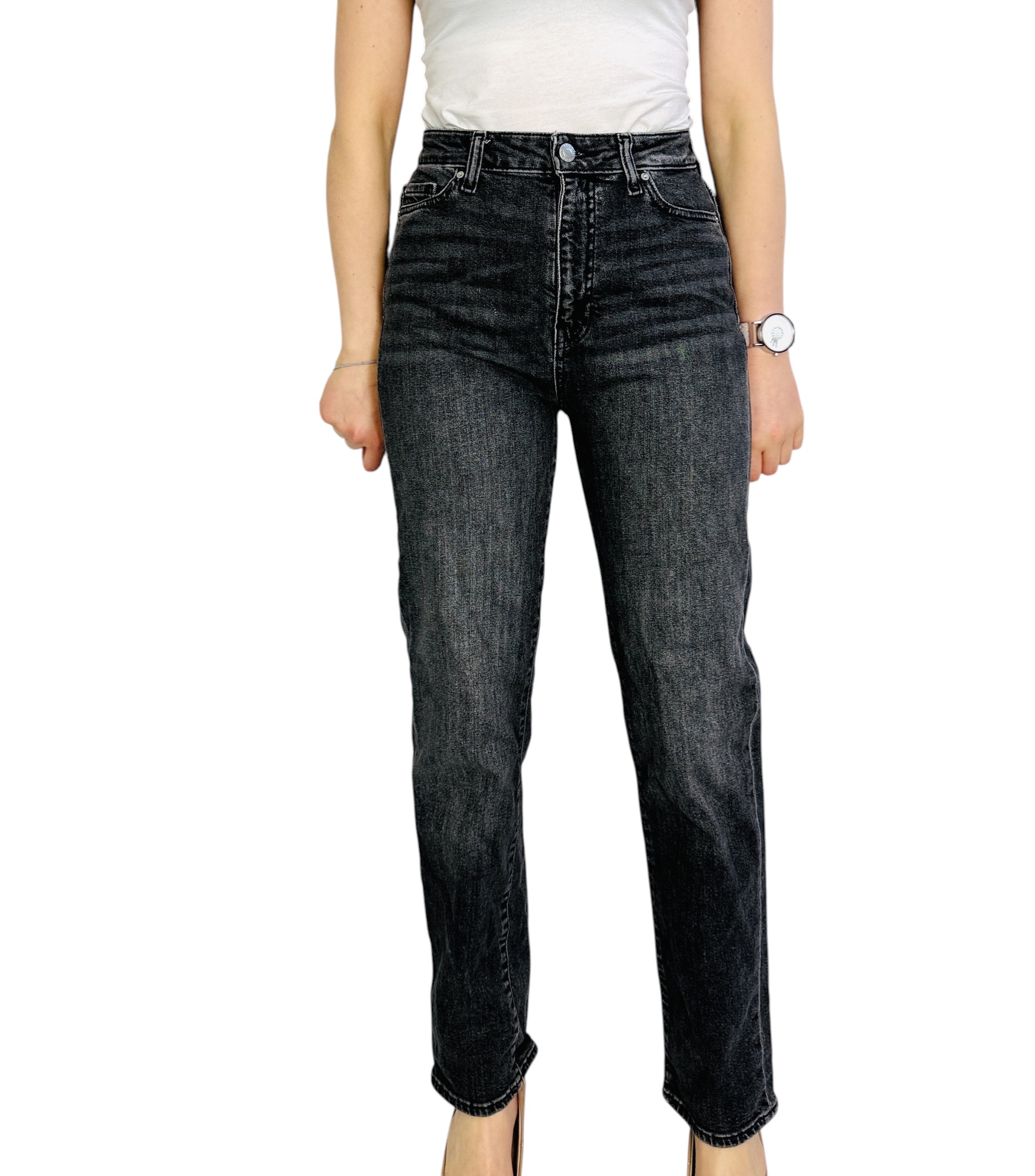 Krój charakteryzuje się delikatnie podwyższonym stanem, który subtelnie podkreśla linię talii, oraz prostą nogawką opadającą swobodnie od bioder ku dołowi. W górnej części widoczny jest klasyczny, lekko usztywniony pas z metalowym guzikiem i szlufkami, a standardowy układ przednich kieszeni podkreśla znaną, funkcjonalną konstrukcję jeansów. Subtelne przetarcia i naturalne spranie w rejonie ud oraz pionowe linie dodają bryle charakteru bez nadmiernego efektu, zachowując jednocześnie schludny, uporządkowany kształt.