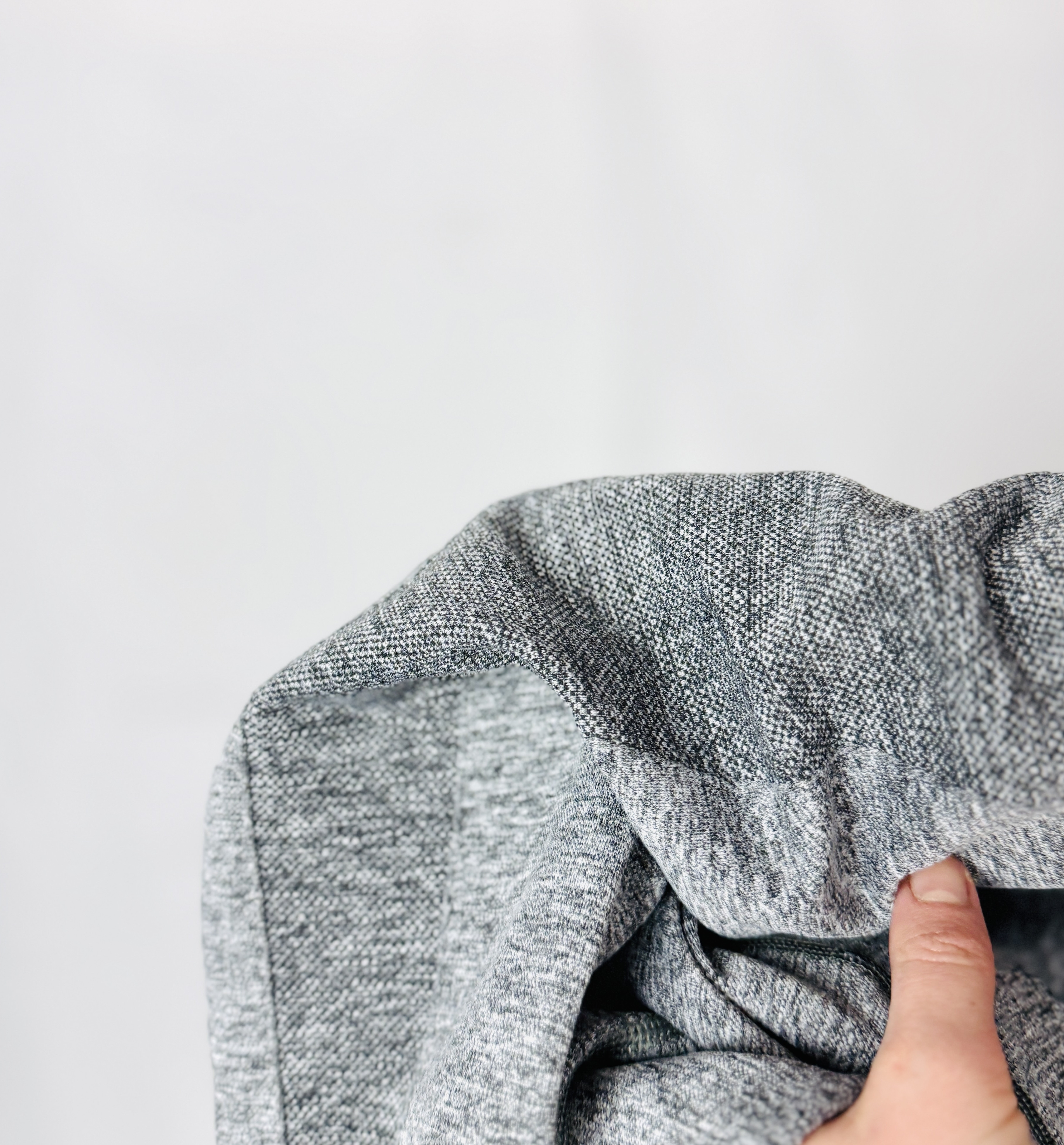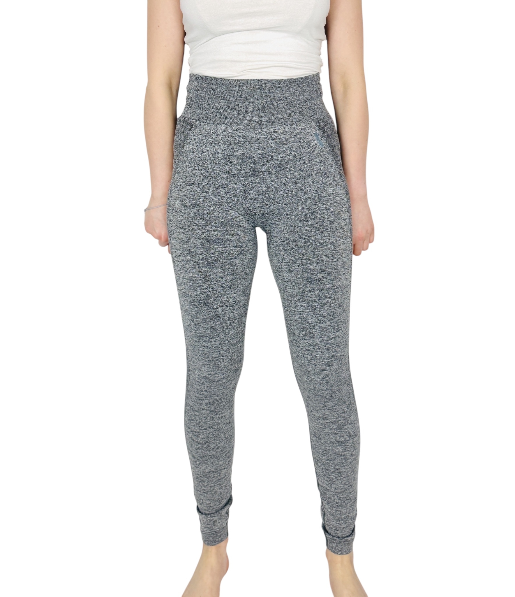 Materiał prezentuje się jako gładki, wyraźnie elastyczny splot z subtelnym melanżowym deseniem; tkanina wydaje się miękka i przyjemna w dotyku, jednocześnie na tyle strukturalna, by dobrze trzymać formę. Wykończenie ma lekko matowy charakter, a nierównomierność melanżu dodaje ubraniu wizualnej głębi. W miejscach zgięć pojawiają się naturalne załamania, co świadczy o swobodzie ruchu i komforcie noszenia — legginsy wyglądają na elastyczne, dopasowujące się do sylwetki bez nadmiernego napinania.