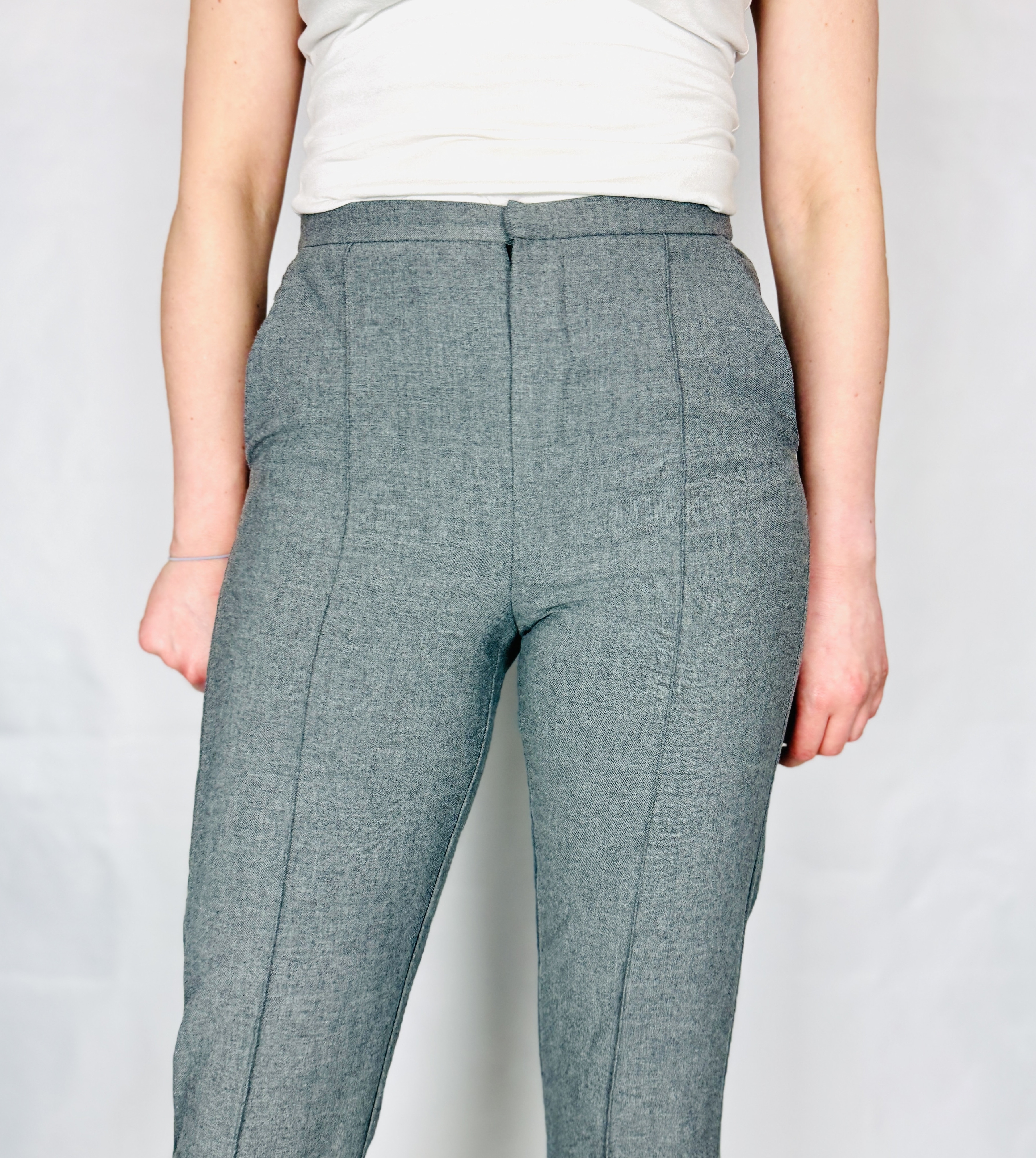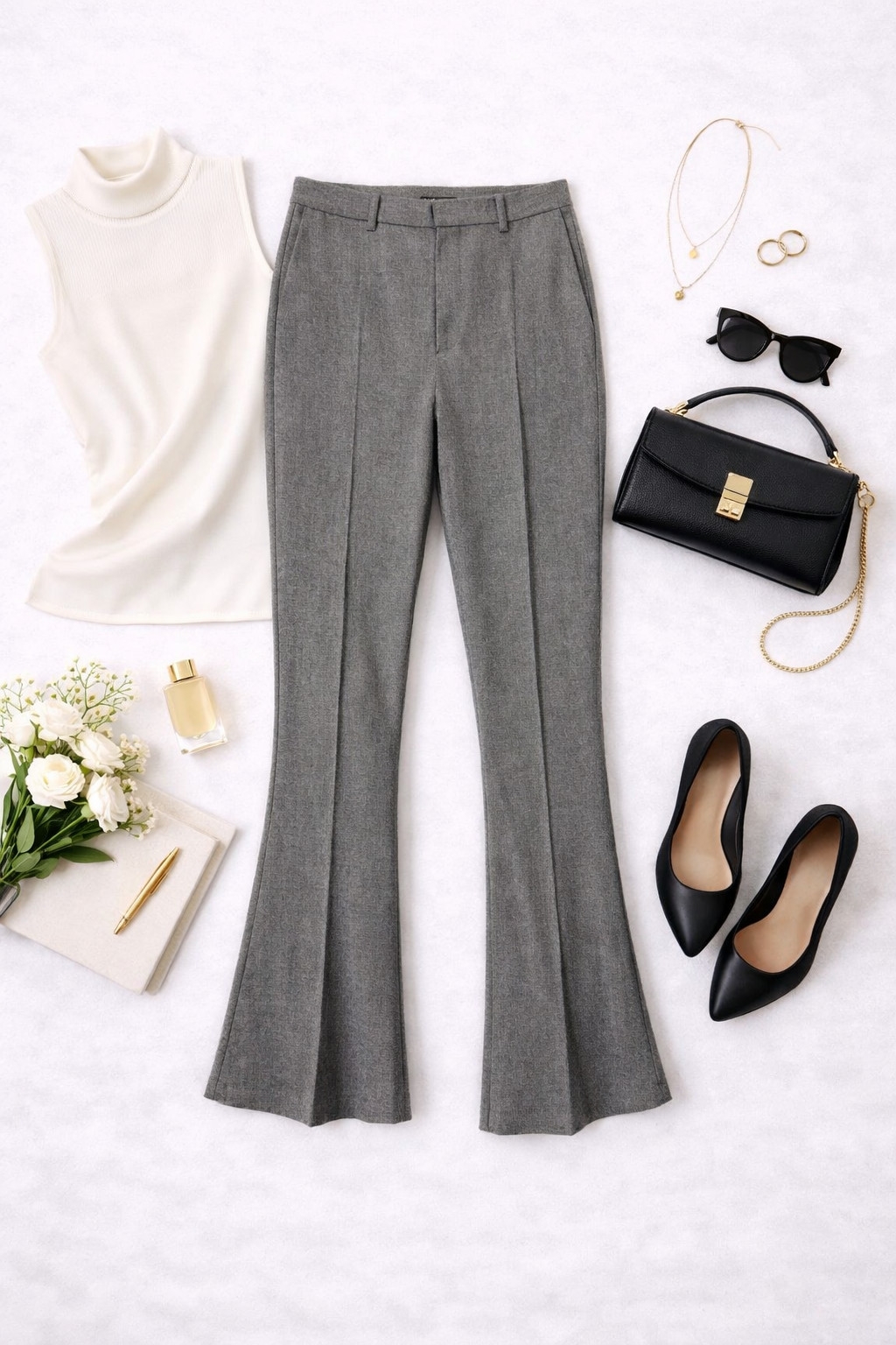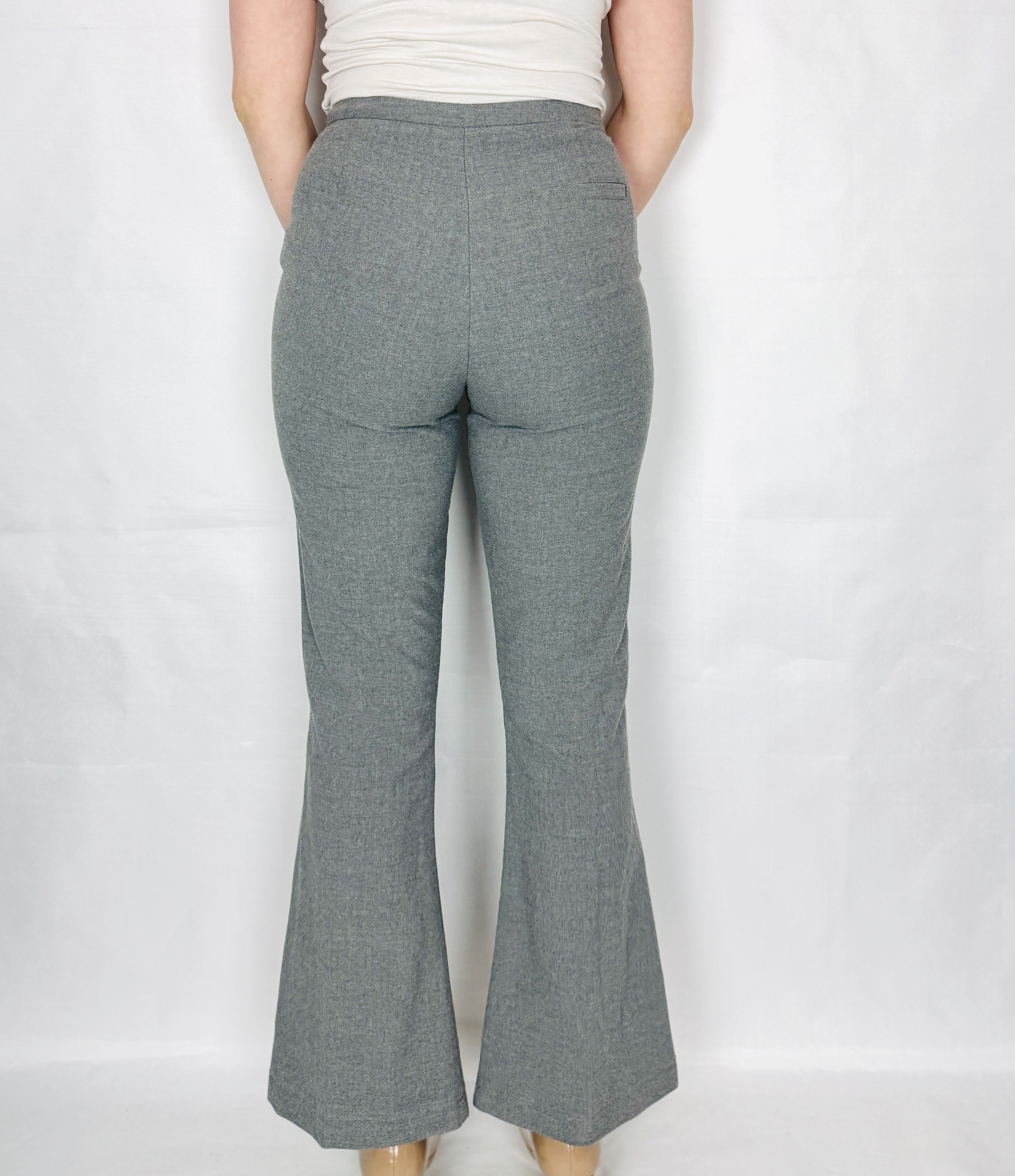 Krój silnie modeluje sylwetkę: wysoki stan optycznie wydłuża tułów i nogi, a pionowe przeszycia dodatkowo wysmuklają sylwetkę, tworząc elegancki, wydłużony kontur. Rozkloszowana nogawka równoważy proporcje, co jest korzystne szczególnie dla sylwetek gruszka i prostokąt — pomaga zrównoważyć biodra i dodać lekkości dolnej partii ciała. Jednocześnie dopasowana góra bioder dyskretnie podkreśla kształty, zachowując jednak uporządkowany, uporządkowany look.