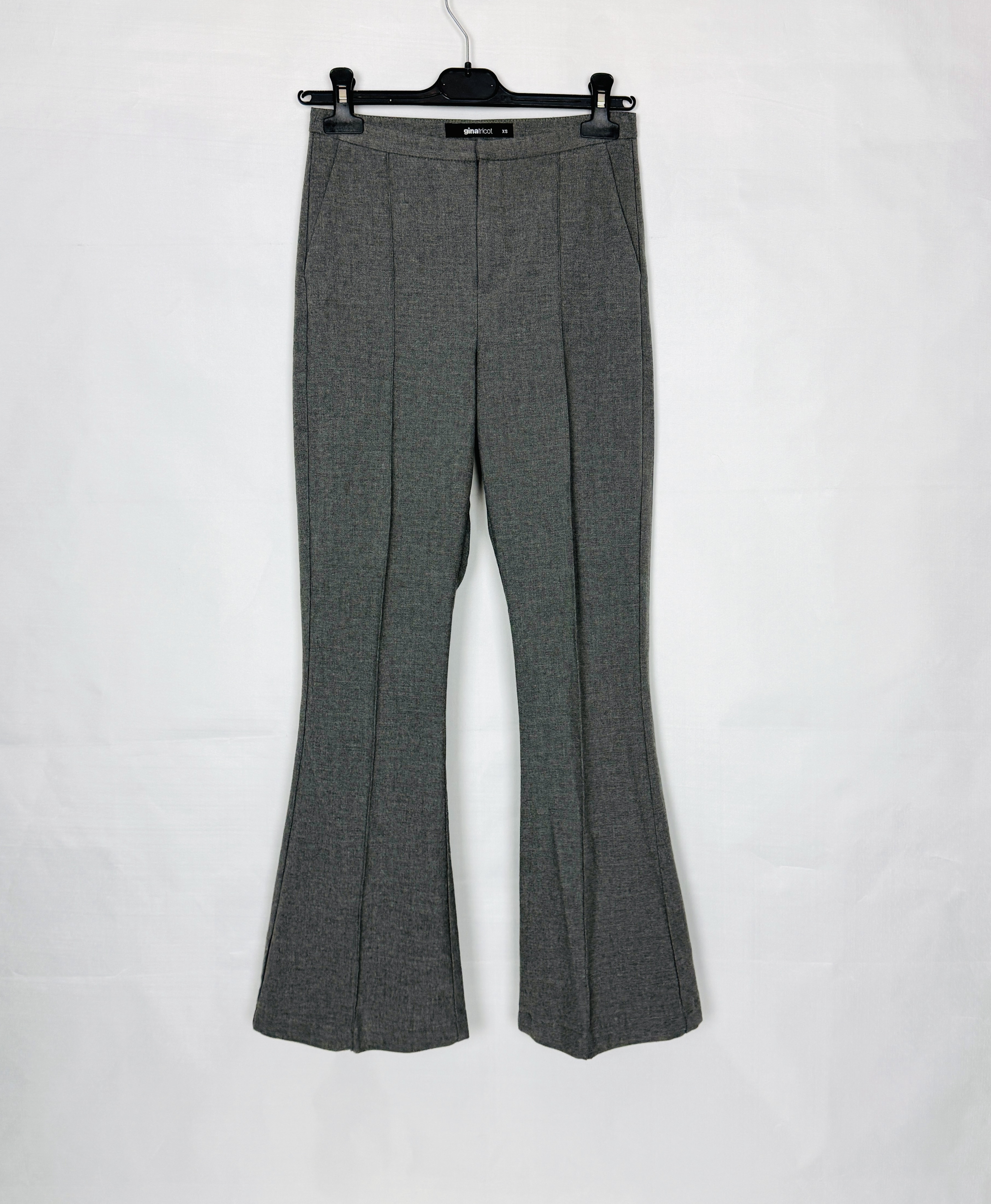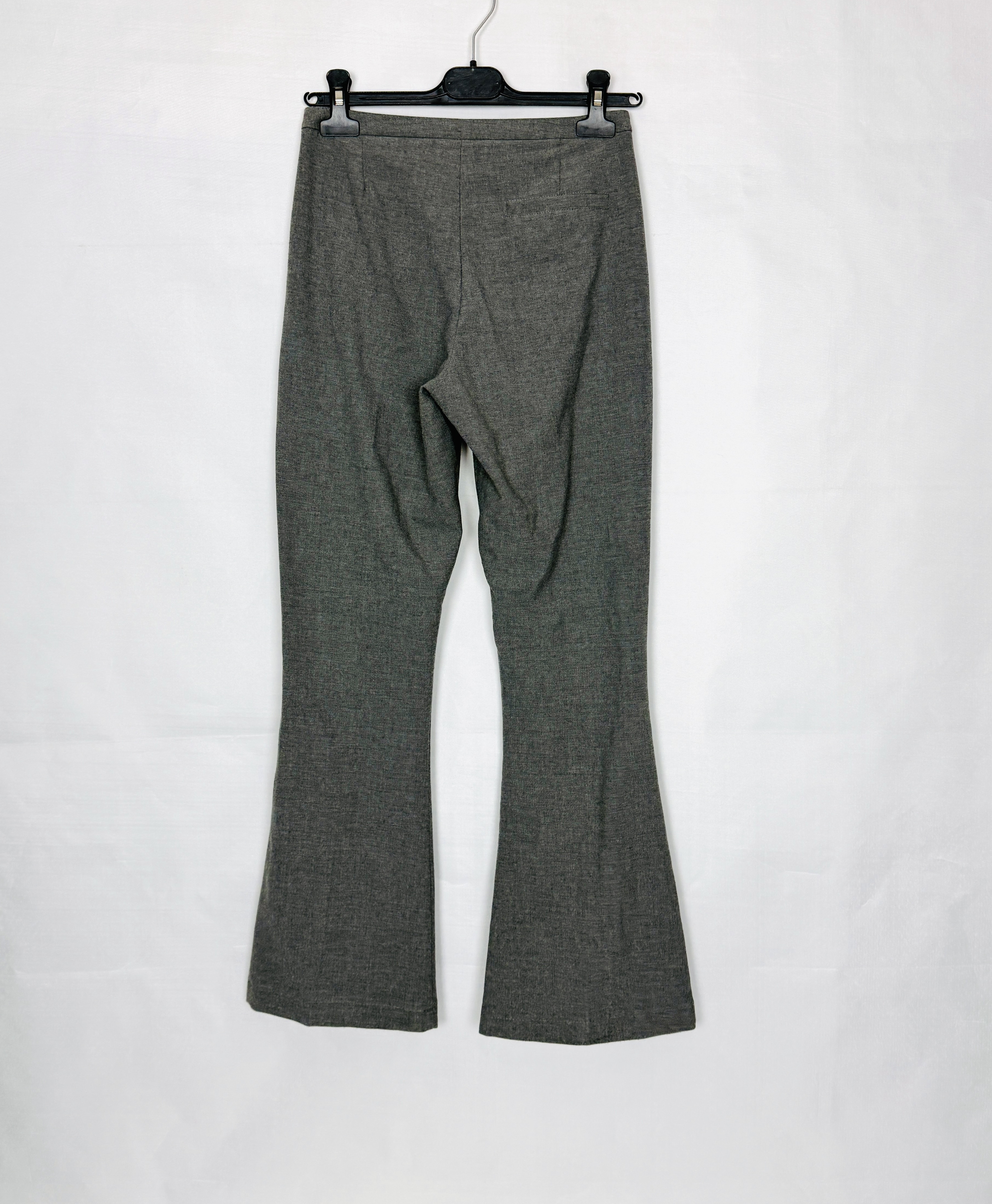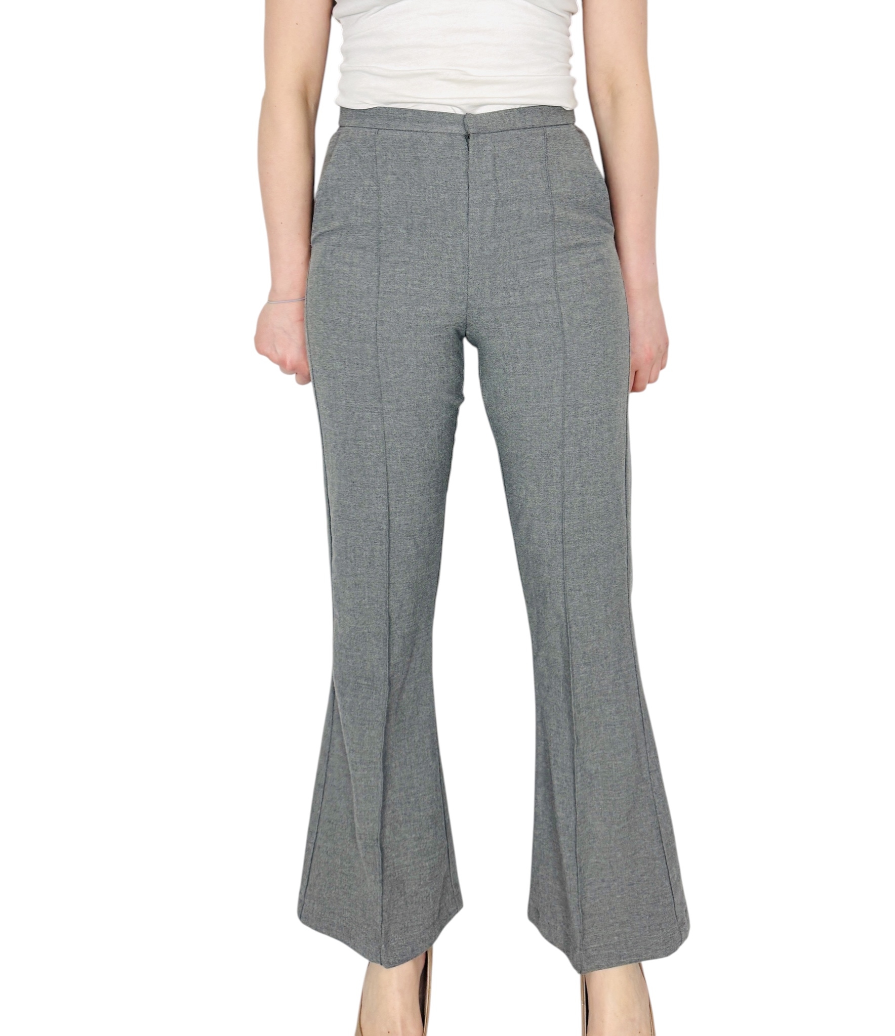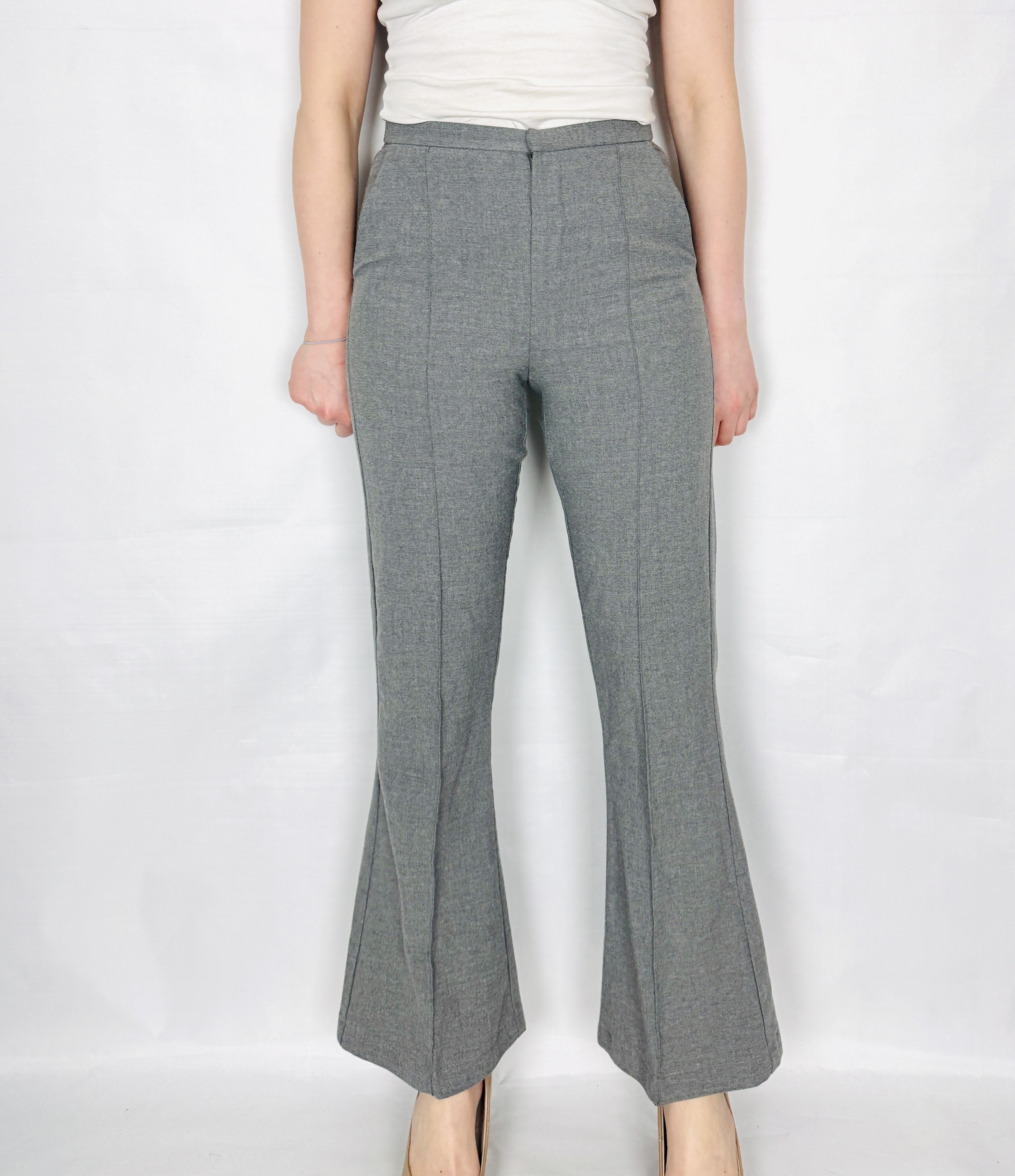 To klasyczna i jednocześnie kobieca propozycja, która łączy elegancję z lekką retro nutą. Szary, stonowany odcień nadaje spodniom powściągliwego i uporządkowanego charakteru, a rozszerzana ku dołowi linia wprowadza subtelną lekkość i dynamikę. Całość daje wrażenie dopracowanej harmonii — to model, który sprawia, że wygląd staje się wyrafinowany, ale nie przesadnie oficjalny, idealny dla osób ceniących przemyślane formy i kobiecą sylwetkę.