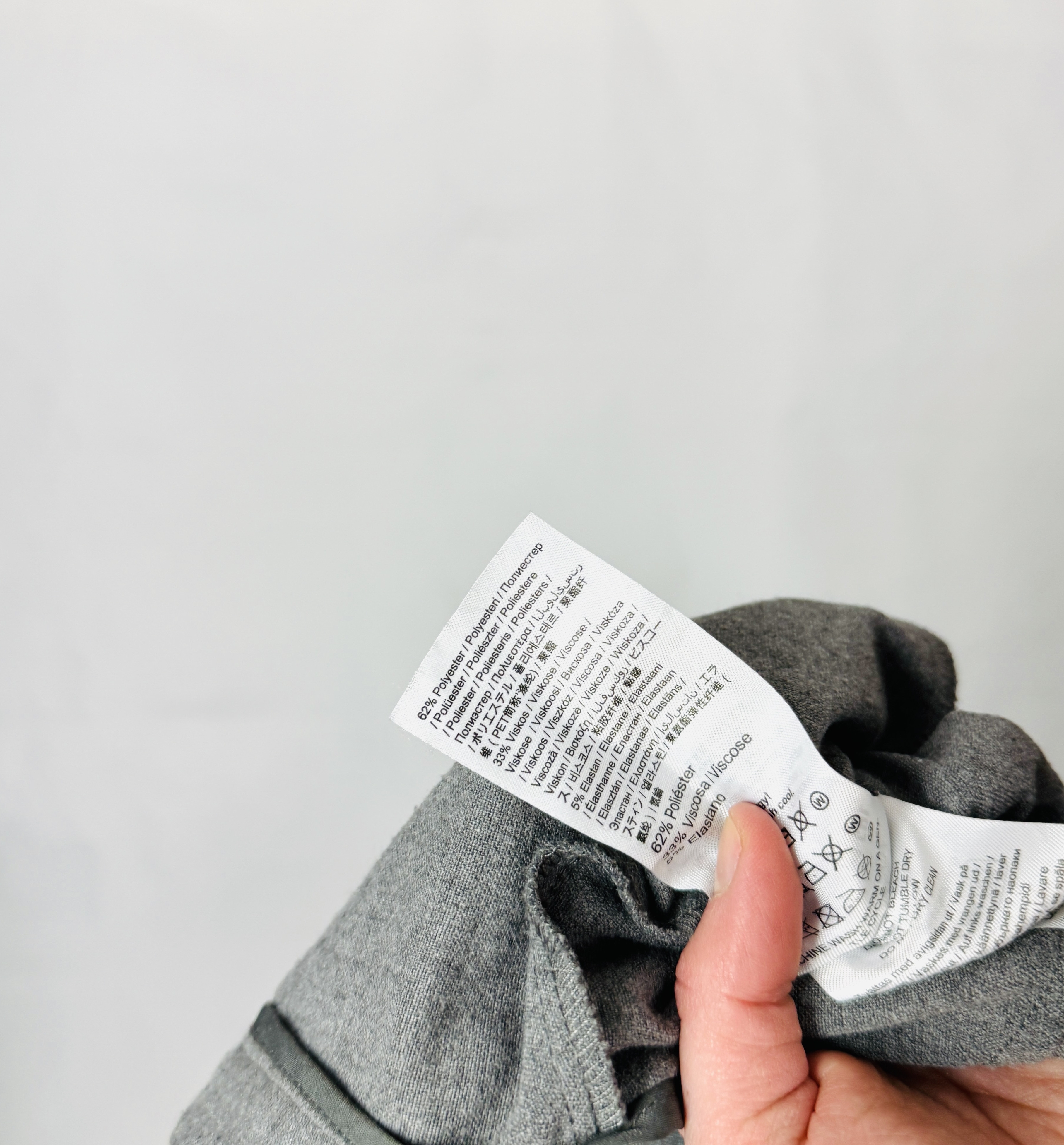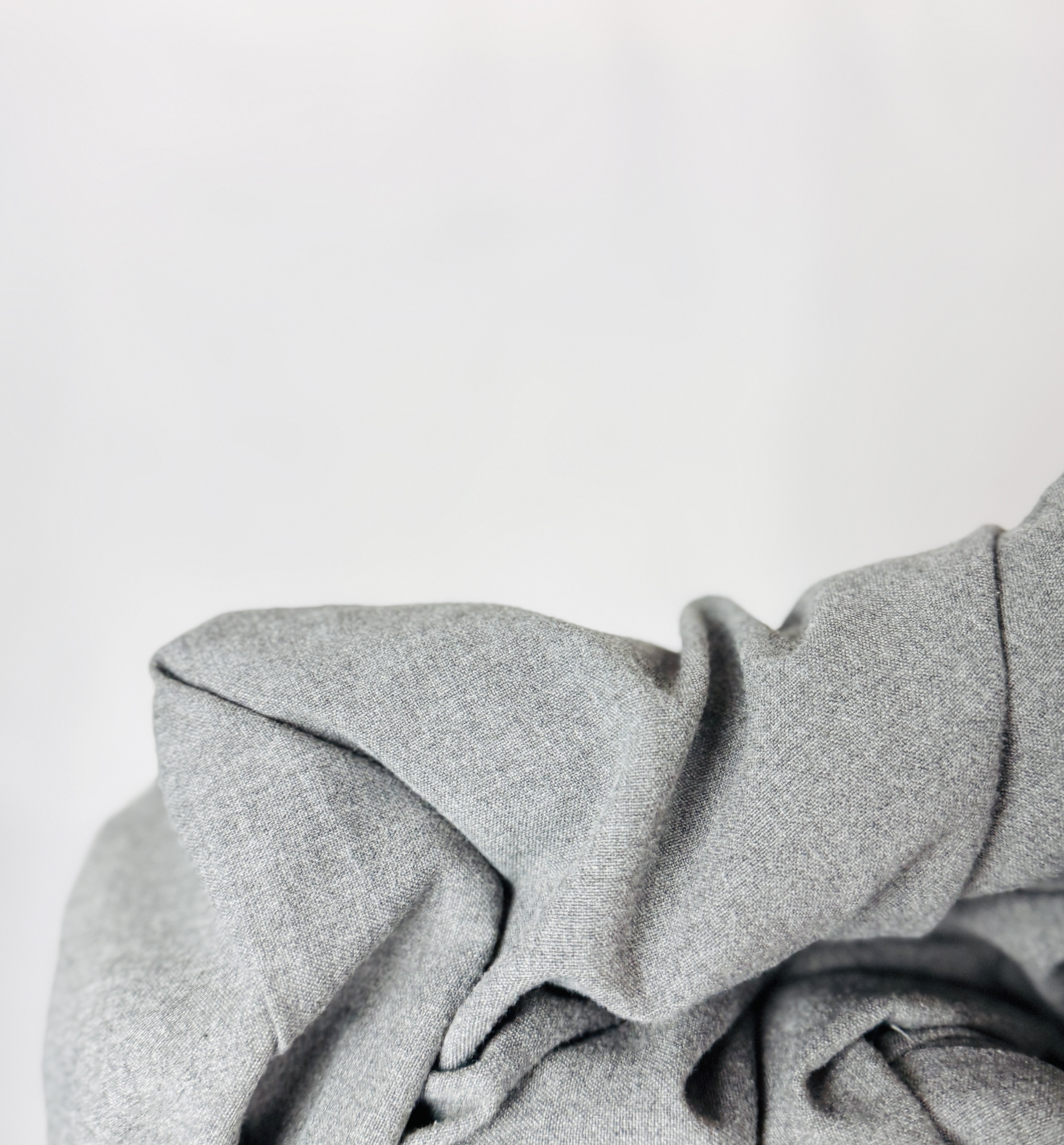 Materiał prezentuje się jako gładki, umiarkowanie strukturalny i matowy — tkanina trzyma formę, ale jednocześnie miękko układa się przy zgięciach, tworząc naturalne fałdki w okolicy kolan. Powierzchnia ma uporządkowany, lekko tkany wygląd, co dodaje spodniom formalnego, ale przyjaznego charakteru; tkanina wydaje się być kryjąca i stabilna, zapewniając schludne wykończenie przeszyć i linii. Dzięki temu fason nie traci ani elegancji, ani komfortu użytkowania, a subtelne ułożenia materiału potęgują efekt jakościowego wykonania.