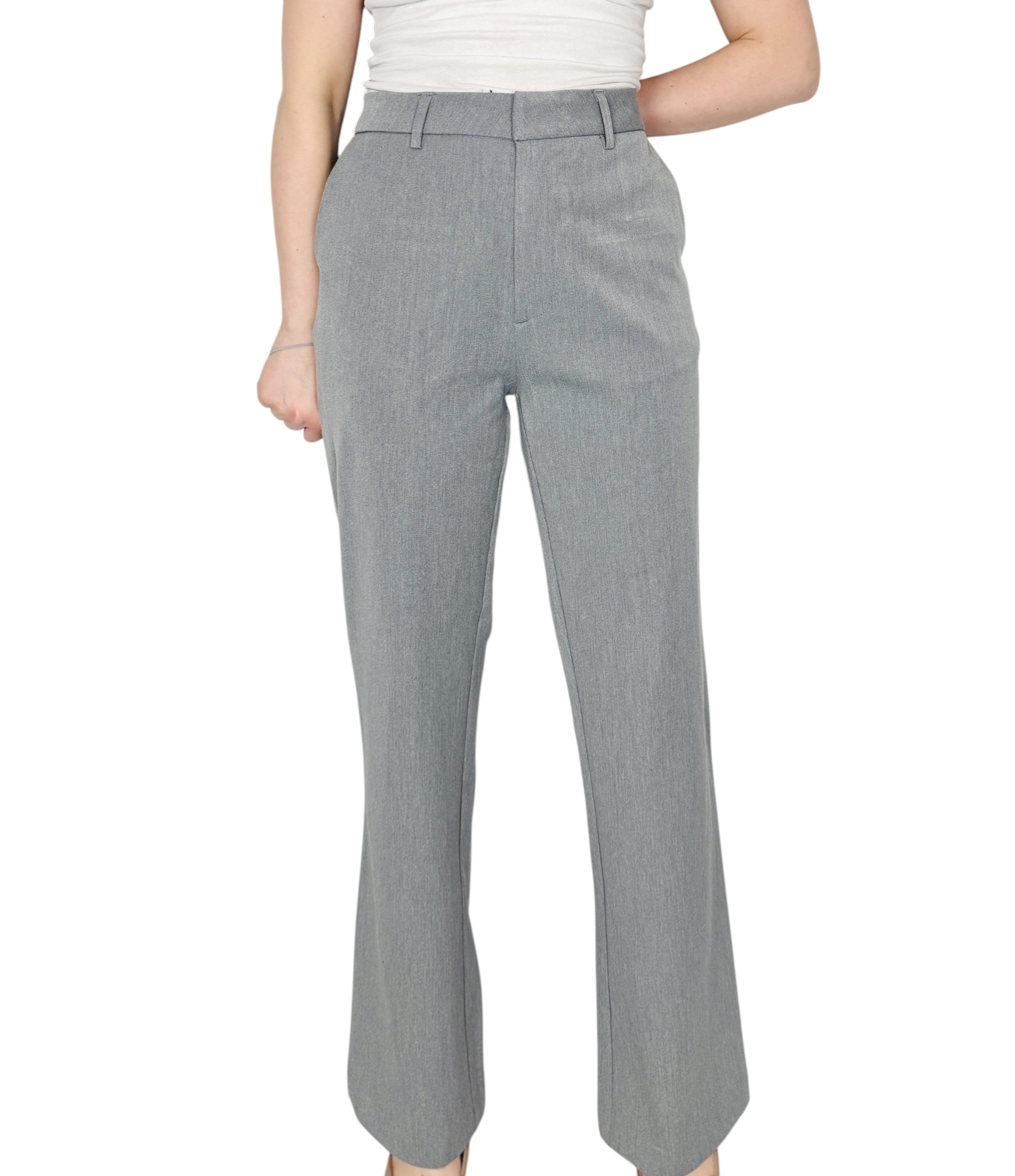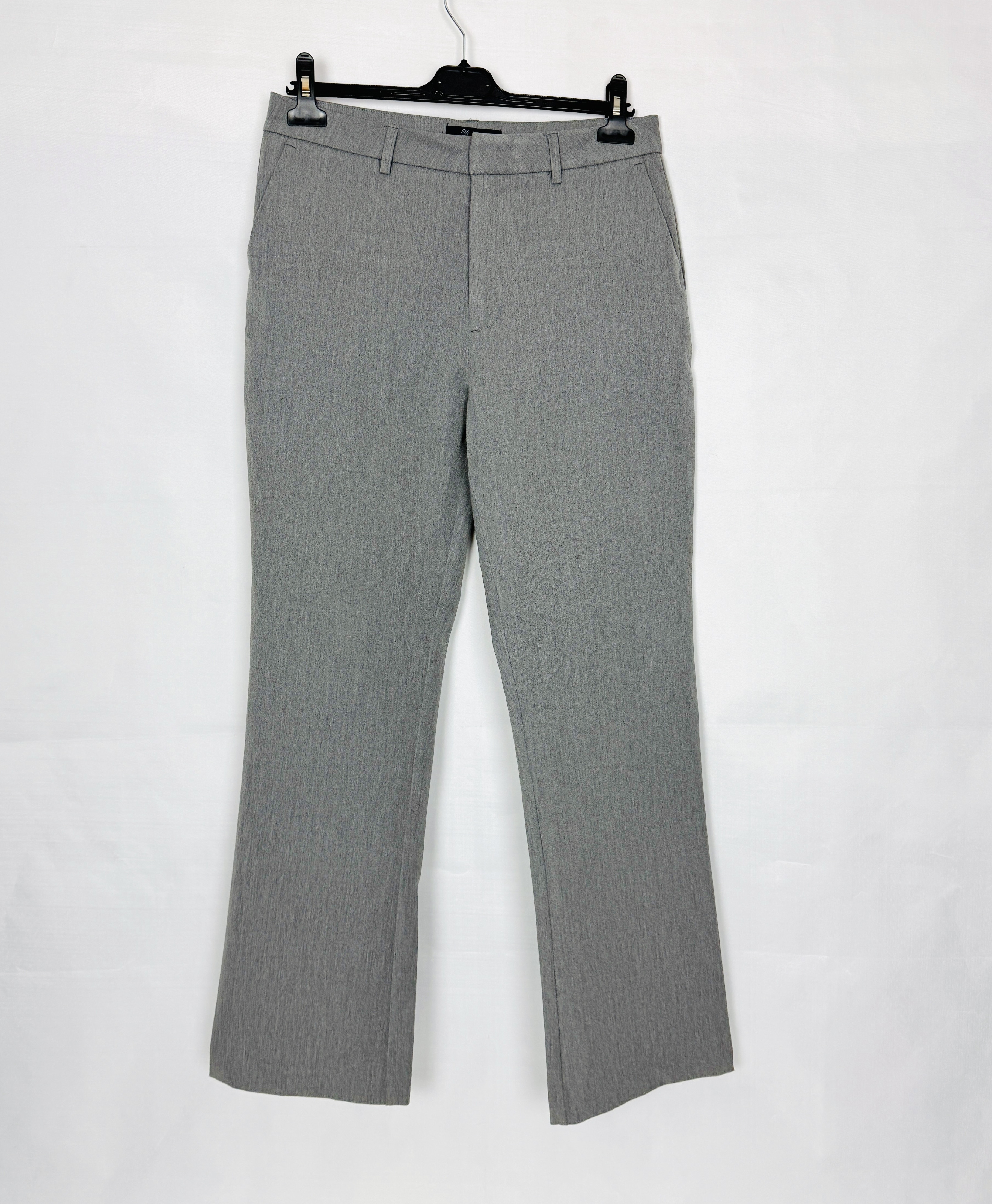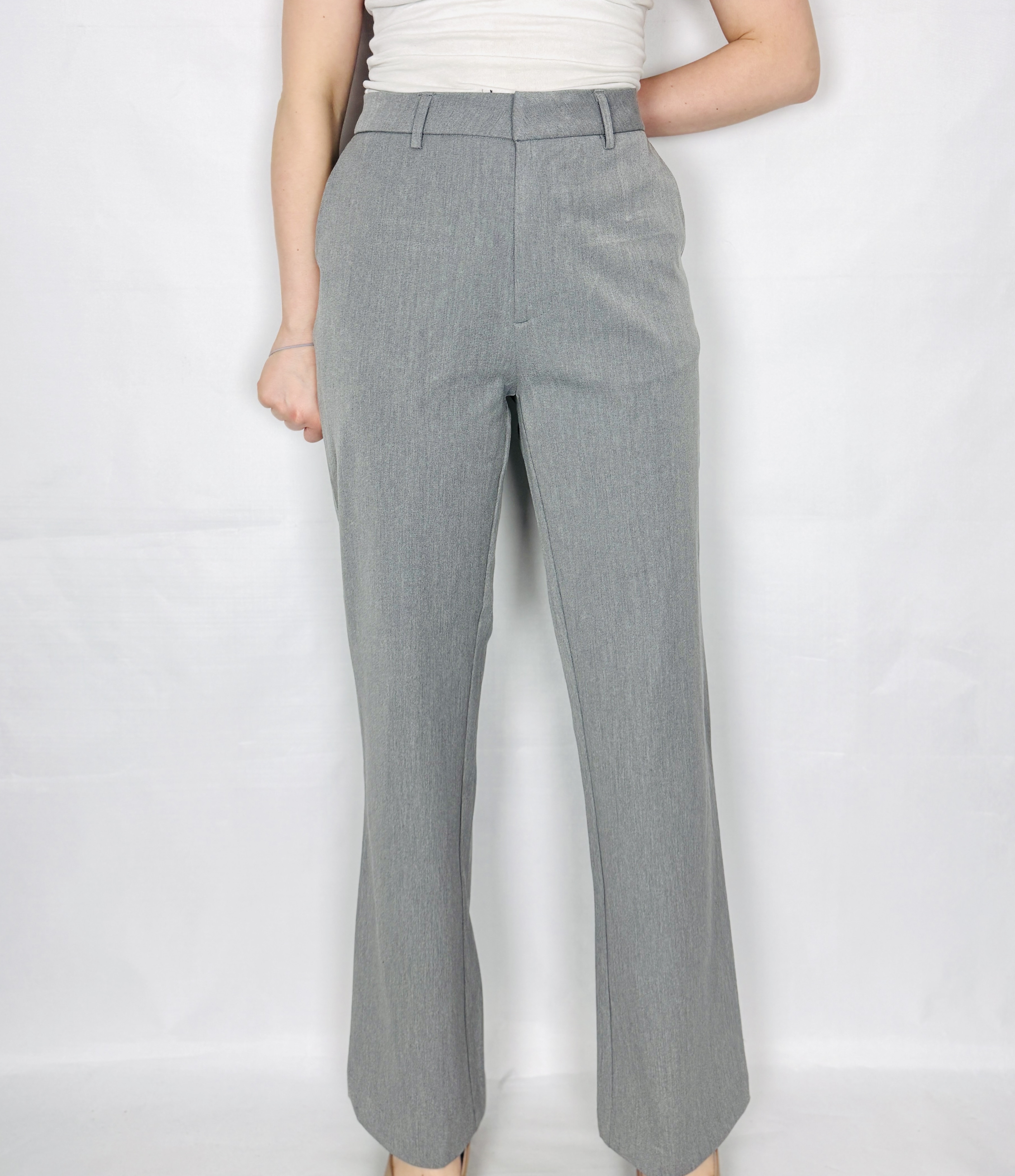 Krój cechuje się wyraźnym, podwyższonym stanem i gładkim pasem z widocznymi szlufkami, co nadaje górnej partii uporządkowanej linii. Przód pozostaje schludny i prosty, z delikatnie zaznaczoną osią środkową, która optycznie wydłuża nogi. Biodra przechodzą w prostą, lekko rozkloszowaną nogawkę, która od kolana subtelnie rozszerza się ku dołowi, tworząc zrównoważoną, klasyczną sylwetkę. Długość sięga stopy, co daje możliwość efektownego eksponowania obuwia i dodaje stylizacji eleganckiej lekkości.