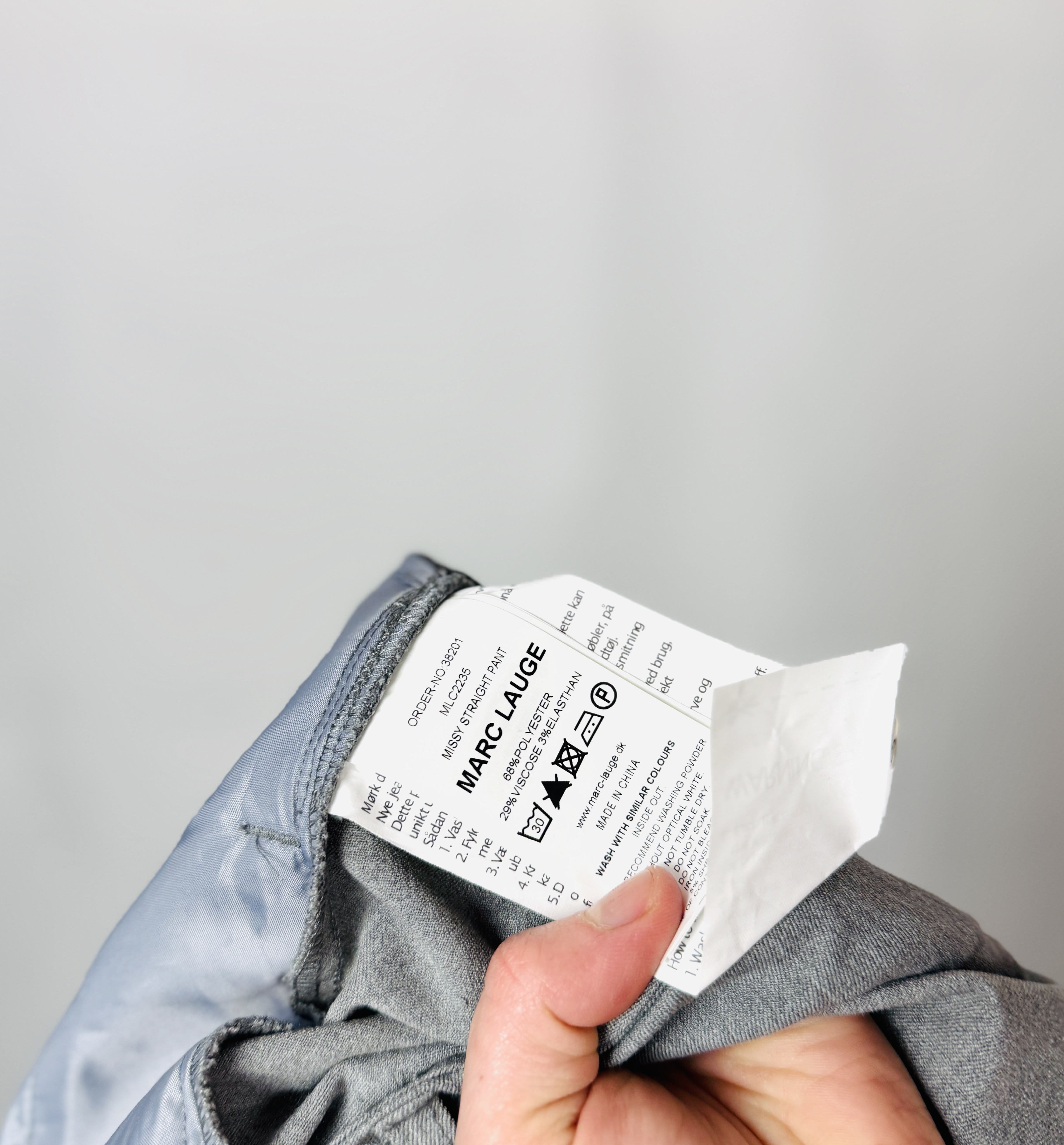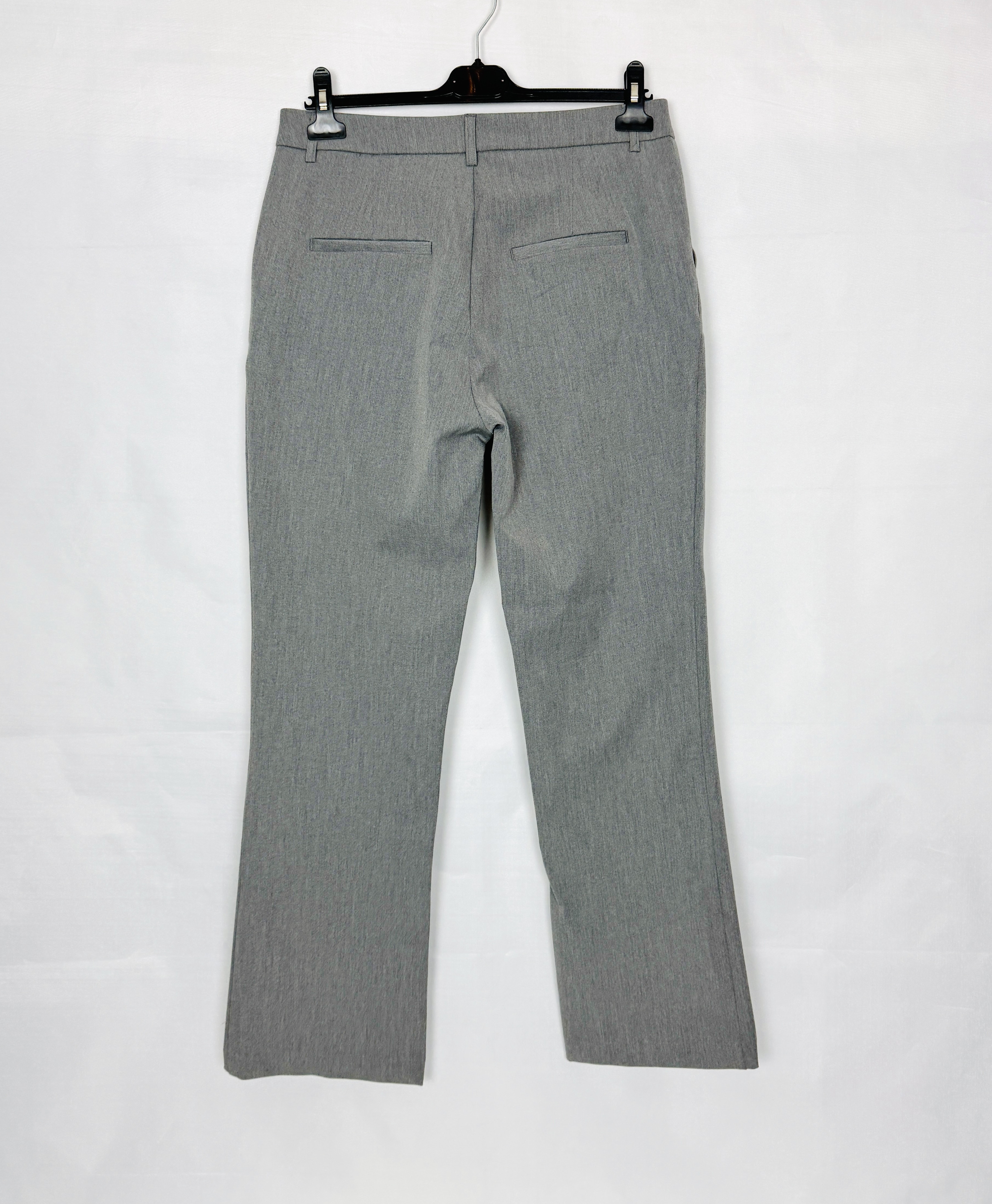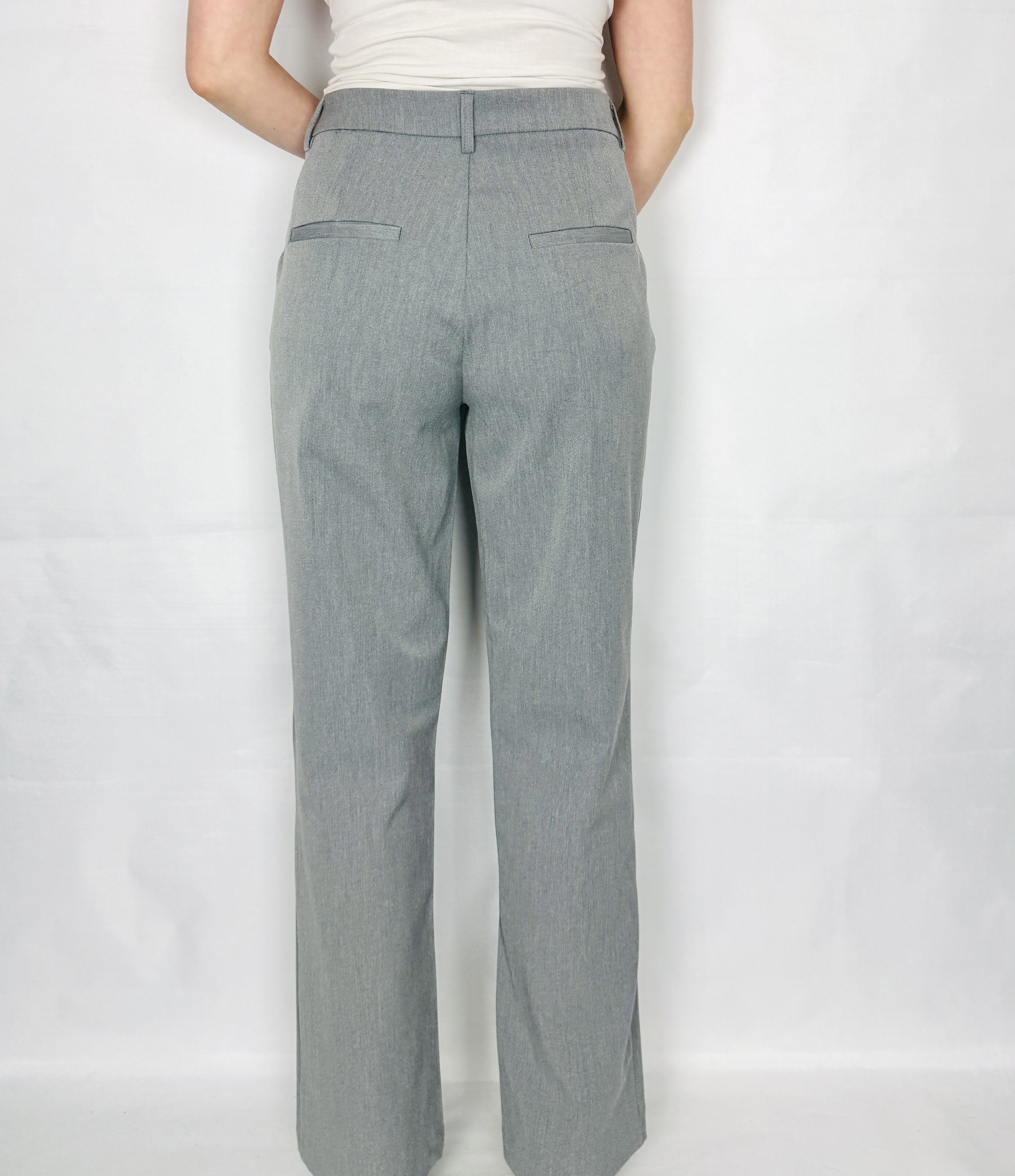 Krój cechuje się wyraźnym, podwyższonym stanem i gładkim pasem z widocznymi szlufkami, co nadaje górnej partii uporządkowanej linii. Przód pozostaje schludny i prosty, z delikatnie zaznaczoną osią środkową, która optycznie wydłuża nogi. Biodra przechodzą w prostą, lekko rozkloszowaną nogawkę, która od kolana subtelnie rozszerza się ku dołowi, tworząc zrównoważoną, klasyczną sylwetkę. Długość sięga stopy, co daje możliwość efektownego eksponowania obuwia i dodaje stylizacji eleganckiej lekkości.