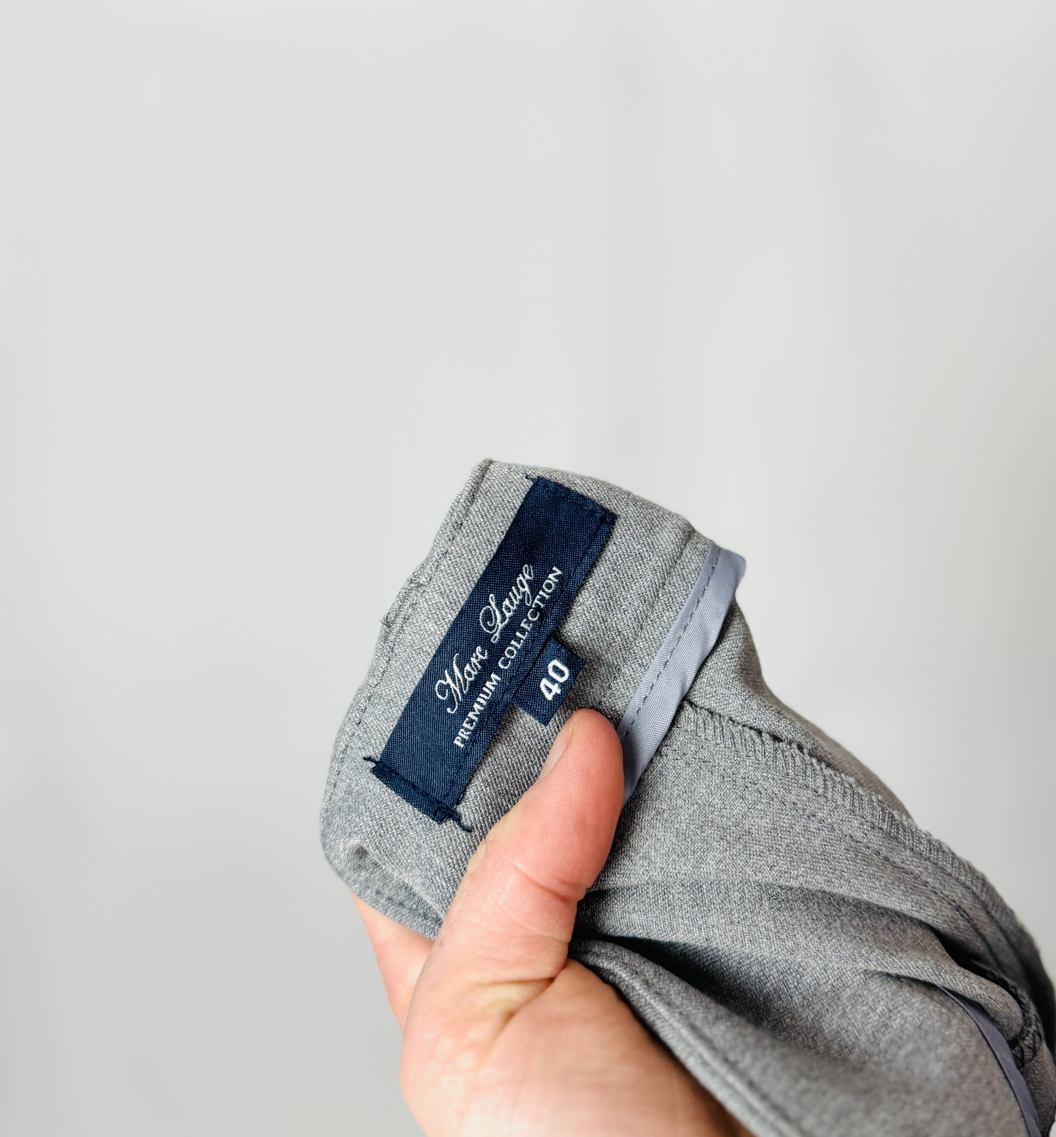 Materiał wygląda na gładki i umiarkowanie strukturalny, o matowym wykończeniu i schludnym drapieżeniu powierzchni, które podkreśla formalny charakter spodni. Tkanina wydaje się mieć przyjemną, nieco mięsistą fakturę, miękko układającą się wzdłuż nogawki i tworząc subtelne fałdki przy zgięciach. Wykończenie sprawia wrażenie kryjącego i schludnego, a sprężystość materiału sugeruje komfort użytkowania przy zachowaniu eleganckiej formy.