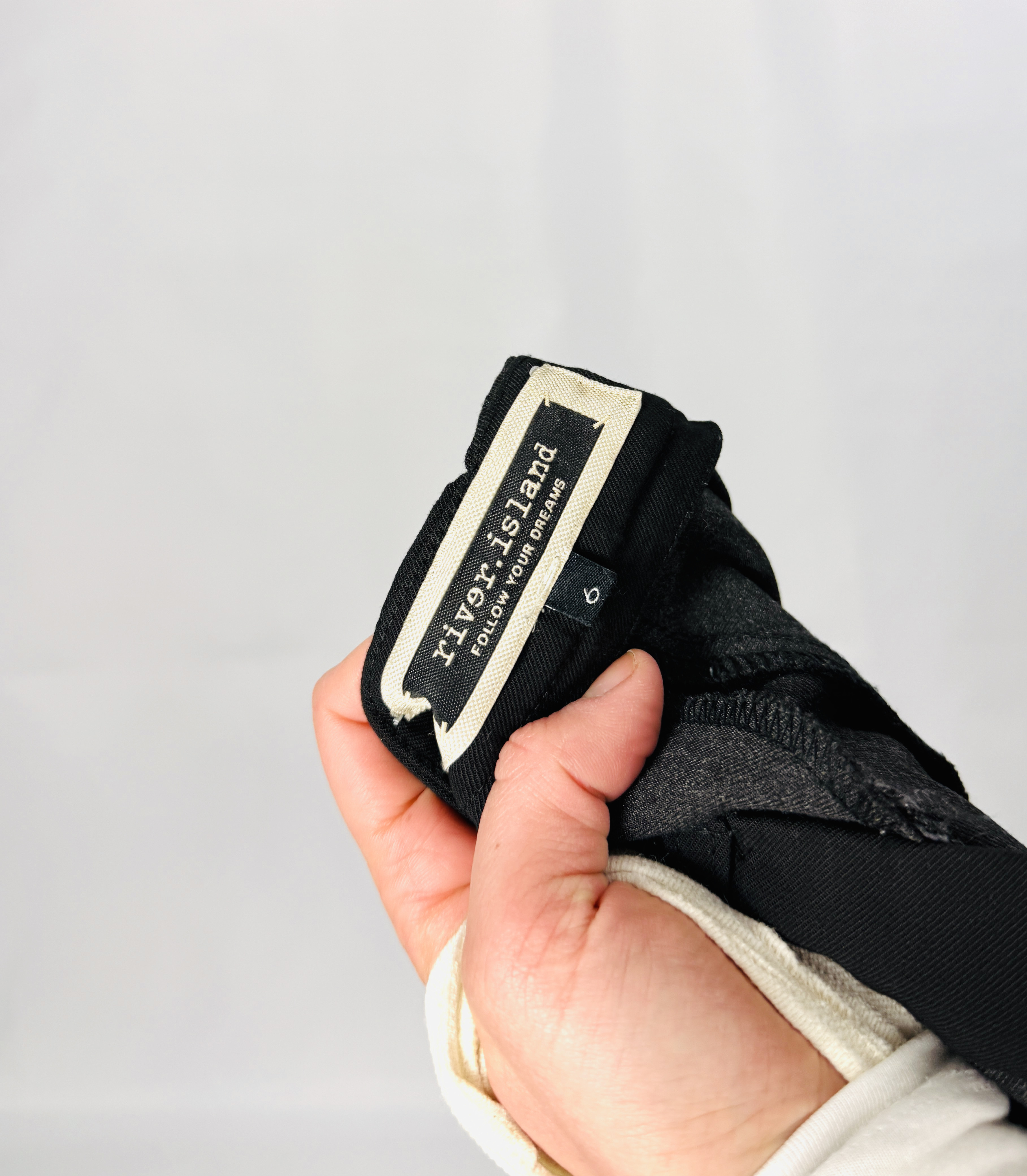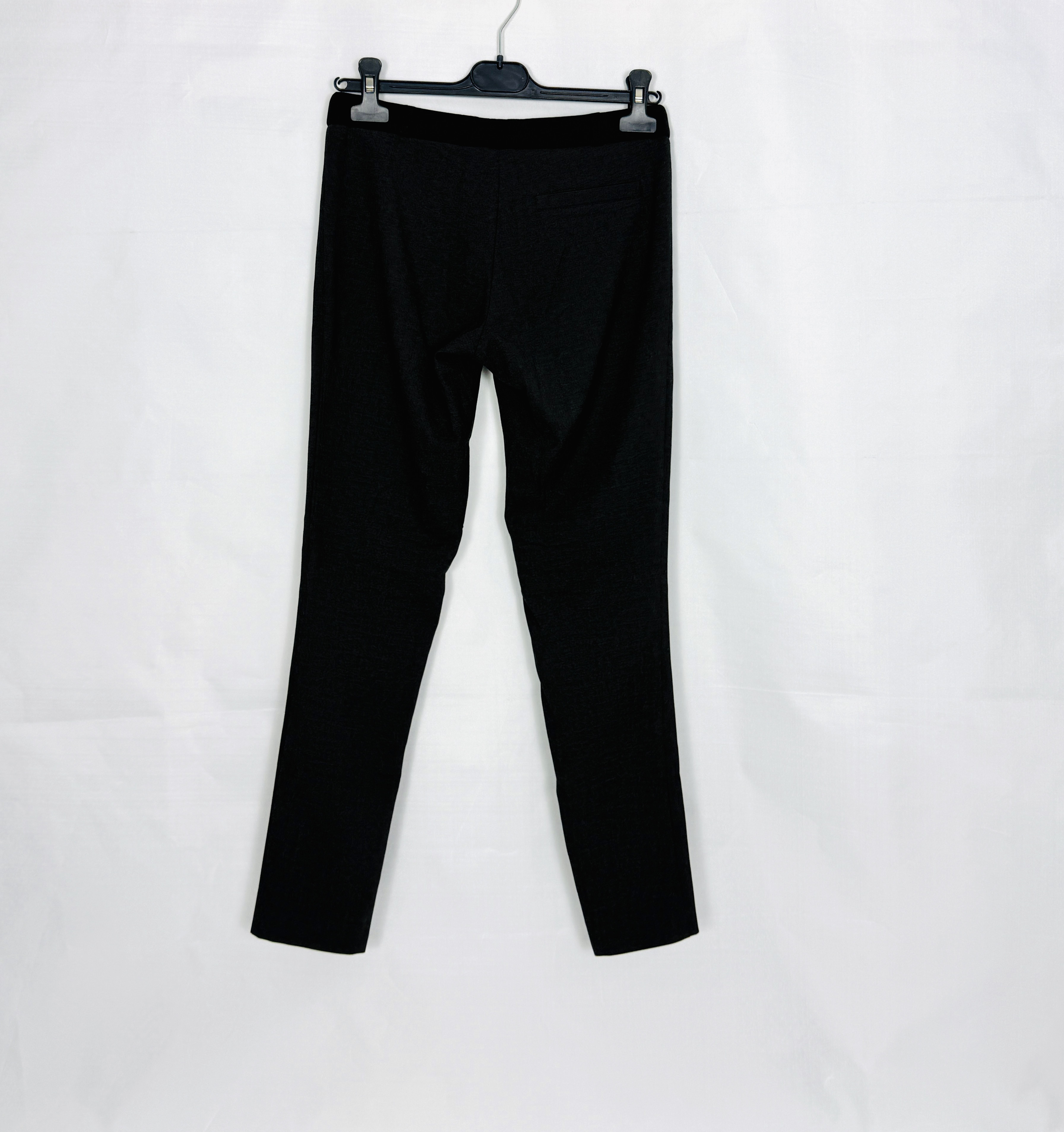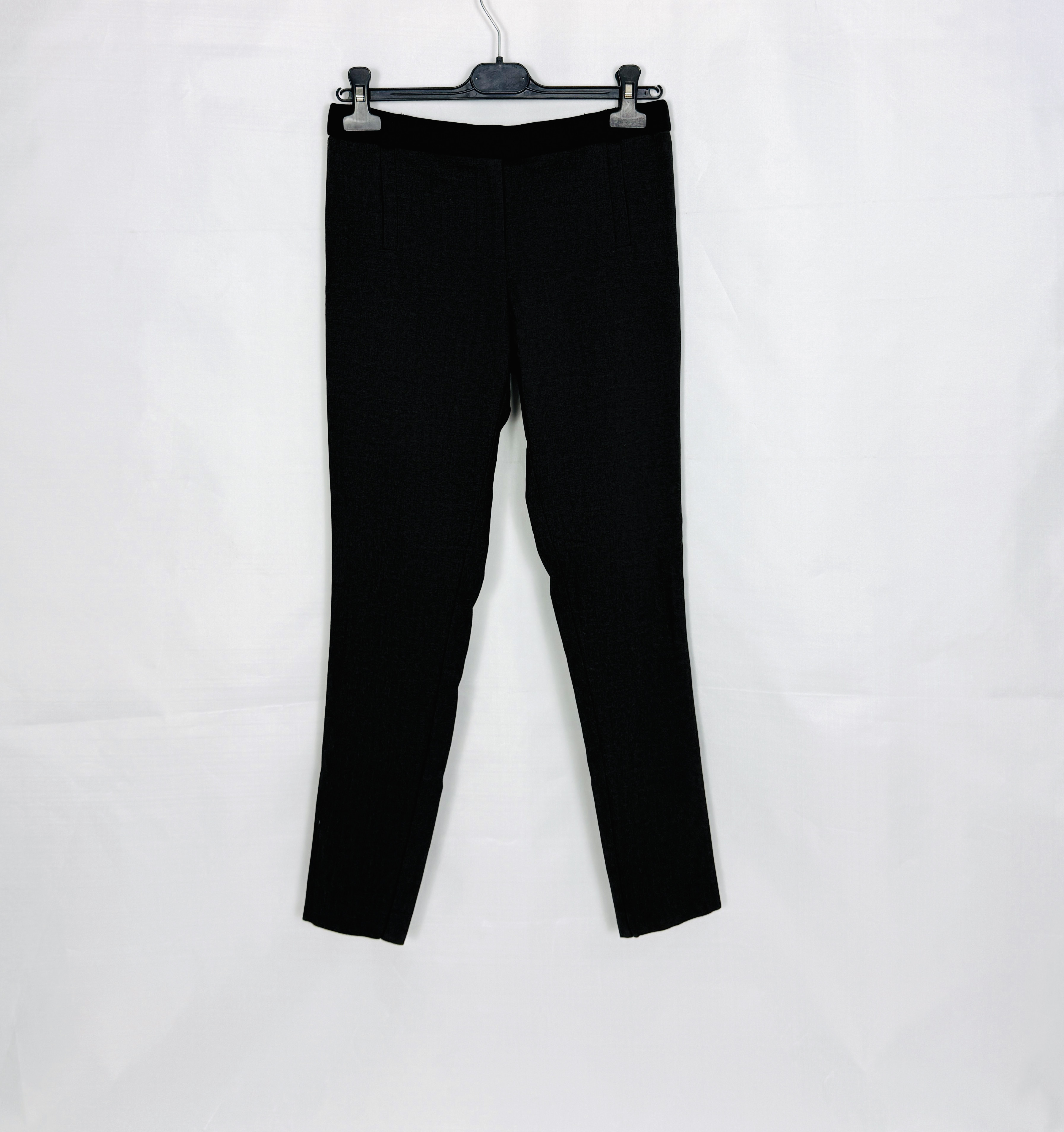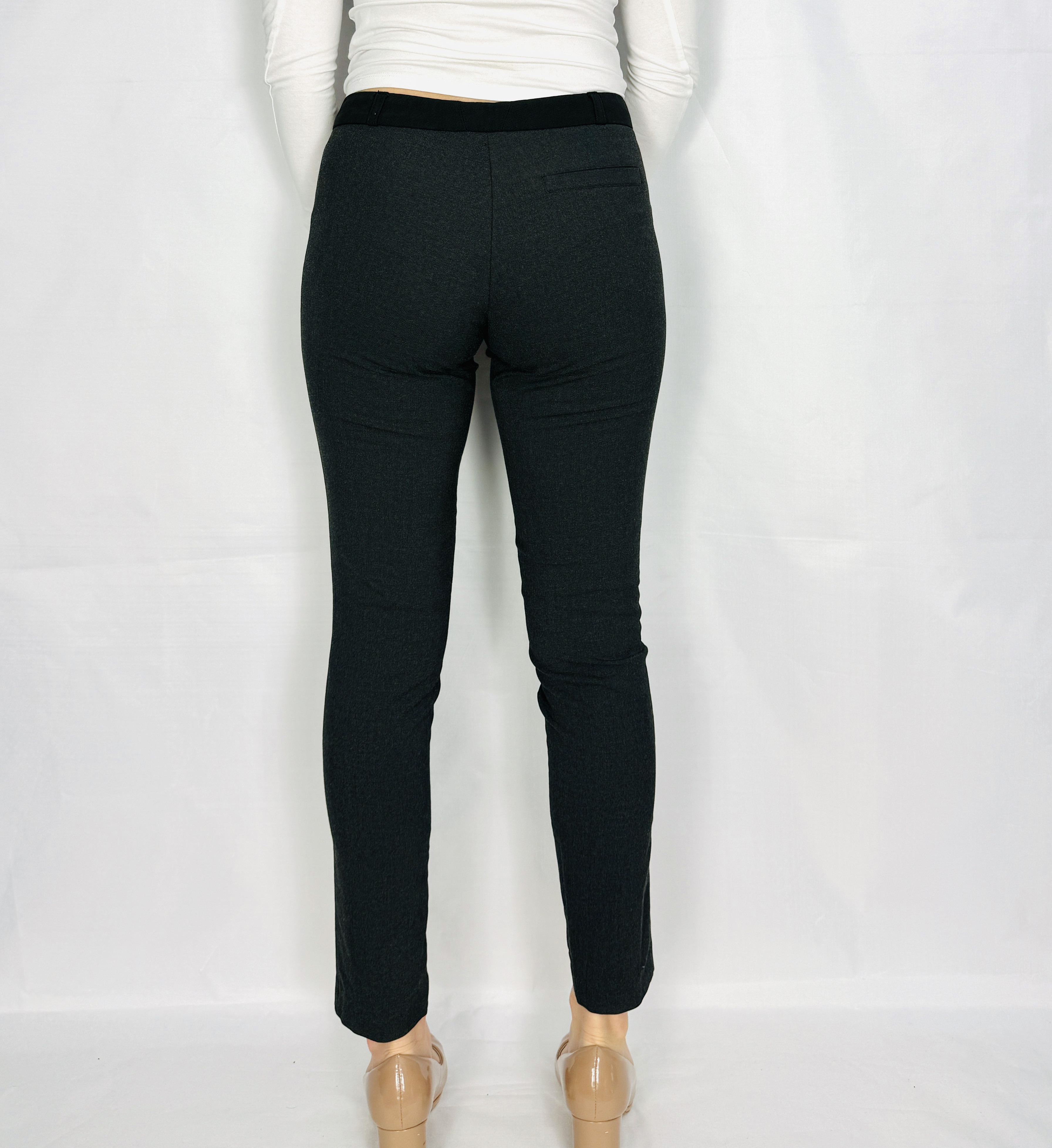 Konstrukcja charakteryzuje się wyraźnie zaznaczoną talią z gładkim, kontrastowym wykończeniem, które porządkuje górną partię sylwetki i optycznie ją podkreśla. Przód prezentuje uporządkowaną płaszczyznę z delikatnymi przeszyciami, a w okolicy bioder widoczne są wąskie, poziome wstawki o stonowanym wykończeniu — dyskretny, ozdobny akcent bez nadmiaru. Nogawki prowadzone są dopasowaną, taliowaną linią: przylegają przez uda, a następnie zwężają się ku dołowi, kończąc się w okolicy kostki, co nadaje sylwetce zgrabnego, nowoczesnego profilu.
