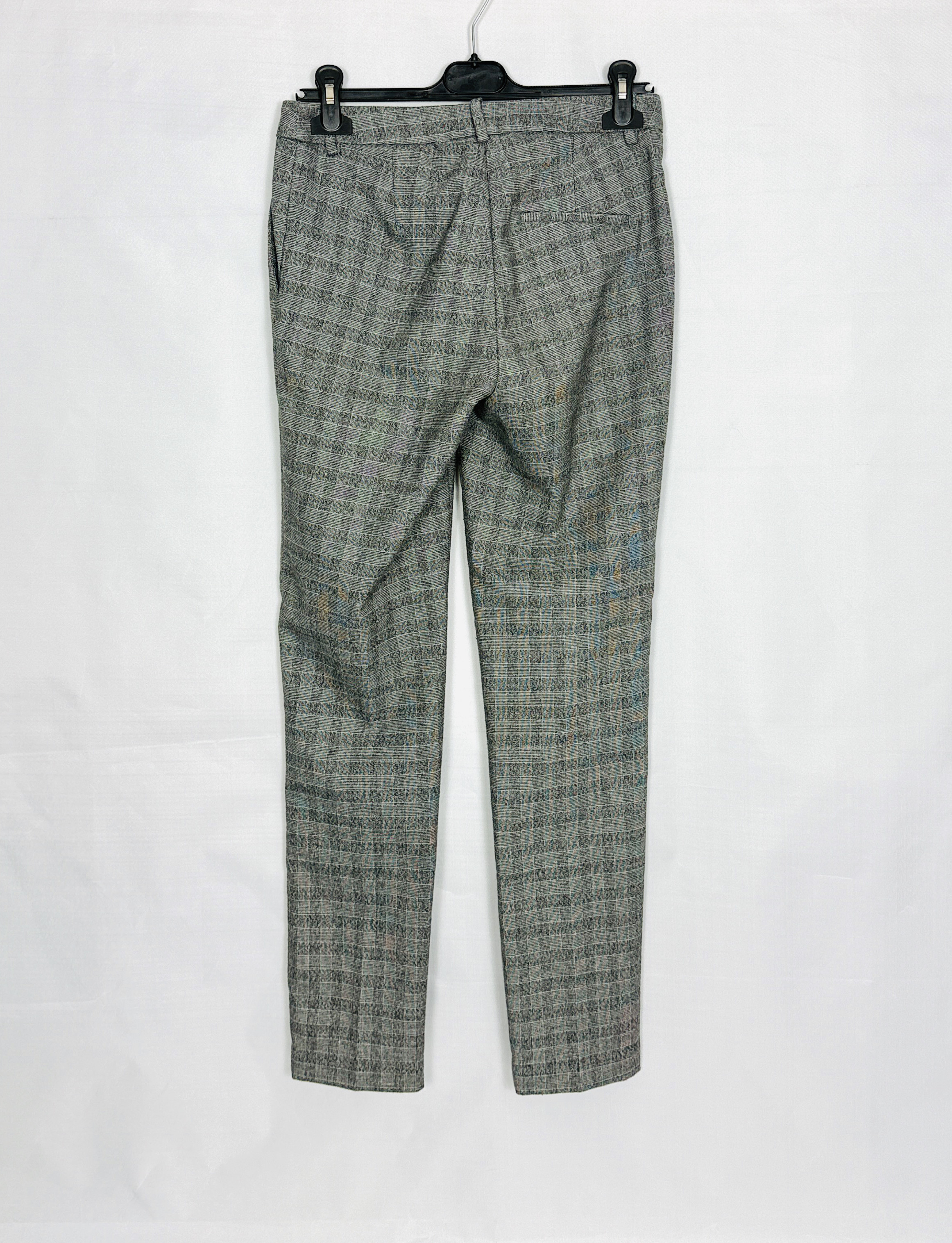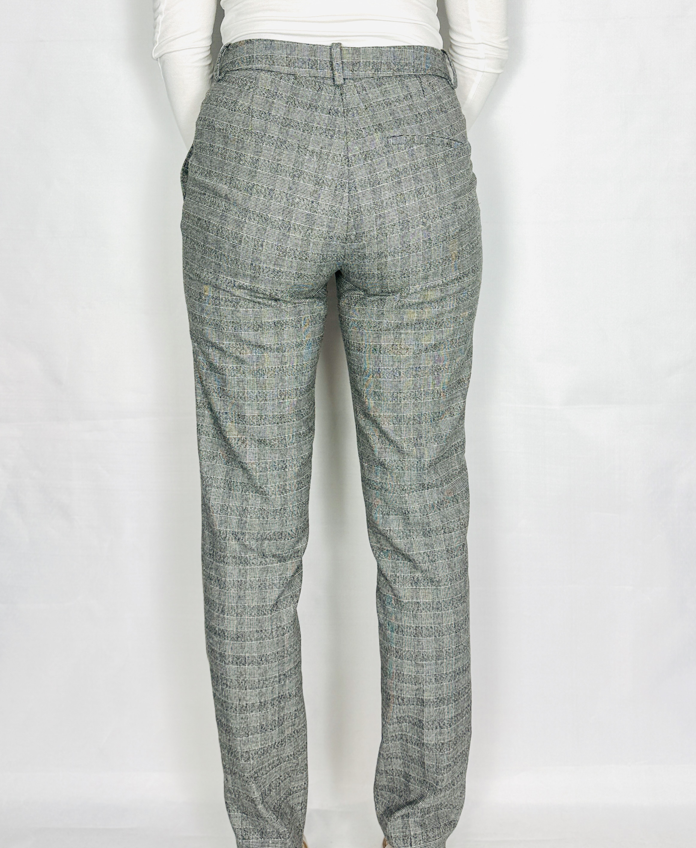Materiał wygląda na uporządkowany i nieco strukturalny, prawdopodobnie o gładkim, matowym wykończeniu; tkanina zdaje się miękko układać w miejscach zgięć, co nadaje formie naturalnego charakteru użytkowania. Drobne zagniecenia przy kolanach i u dołu nogawki dodają autentyczności i wskazują na komfort noszenia, przy jednoczesnym zachowaniu schludnej sylwetki. Kontrast między strukturą kratki a prostotą kroju tworzy efekt dyskretnej wielowymiarowości.