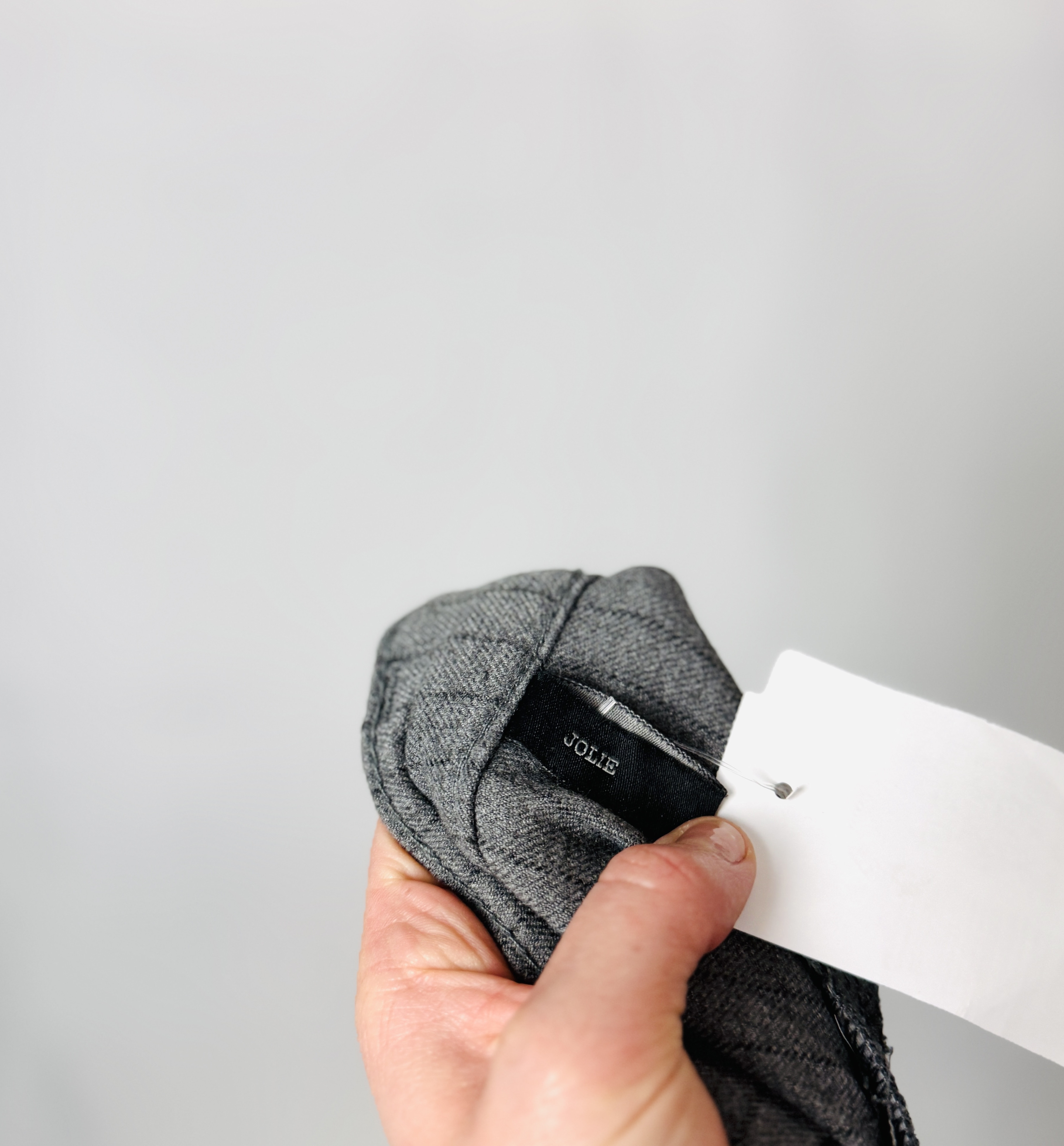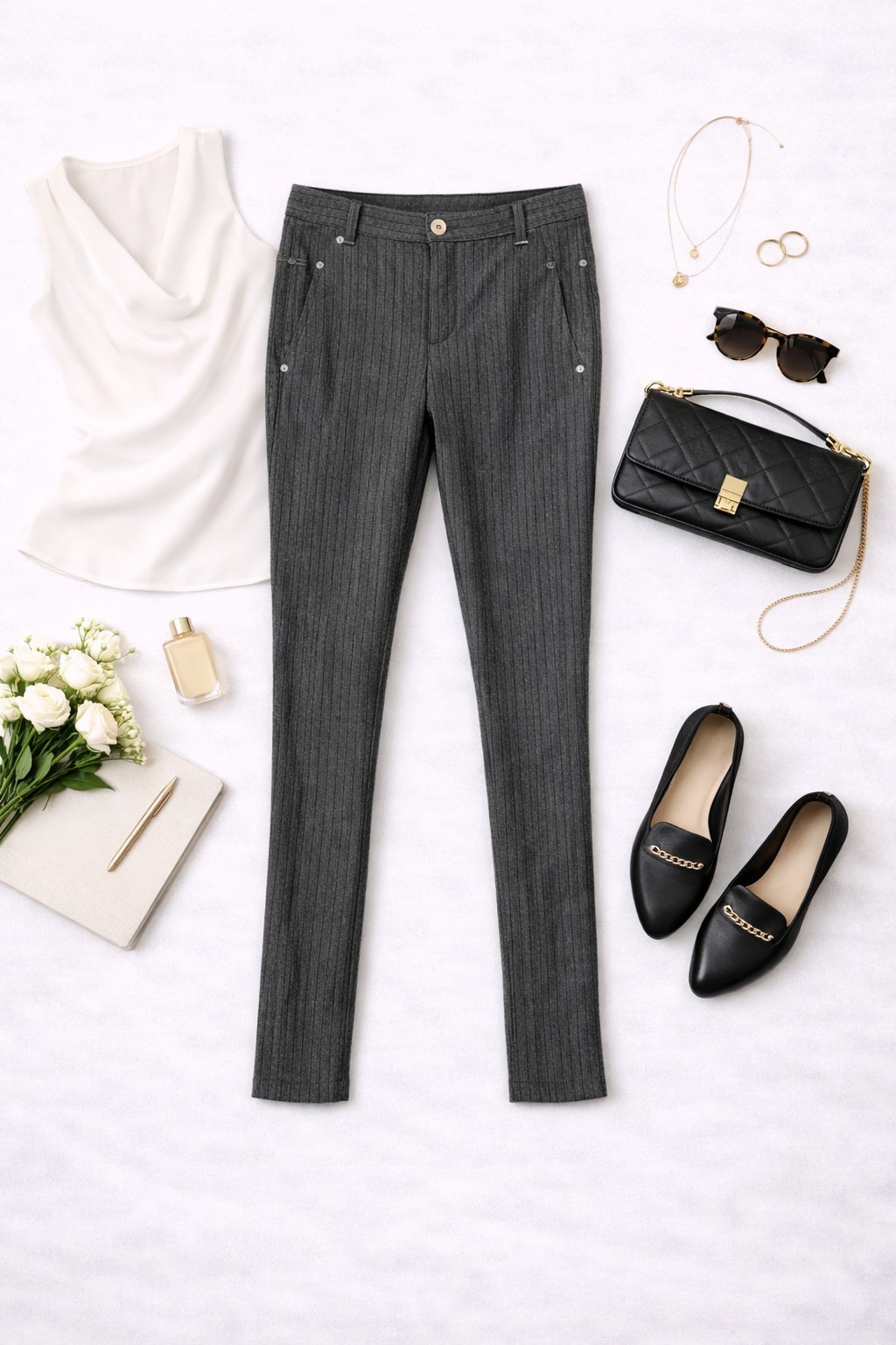 W stylizacjach spodnie sprawdzą się świetnie zarówno w biurze, jak i poza nim: zestaw z gładką koszulą i marynarką dla eleganckiego, profesjonalnego looku; na spotkanie wybierz cienki sweter w kremie lub beżu i loafersy; na wieczór połącz z dopasowanym topem i szpilkami, by dodać stylizacji wyrafinowania. Szare paski harmonizują z bielą, kremem, czernią oraz akcentami w kolorze bordo, butelkowej zieleni czy camel, co daje wiele możliwości tworzenia stonowanych lub bardziej wyrazistych zestawów.