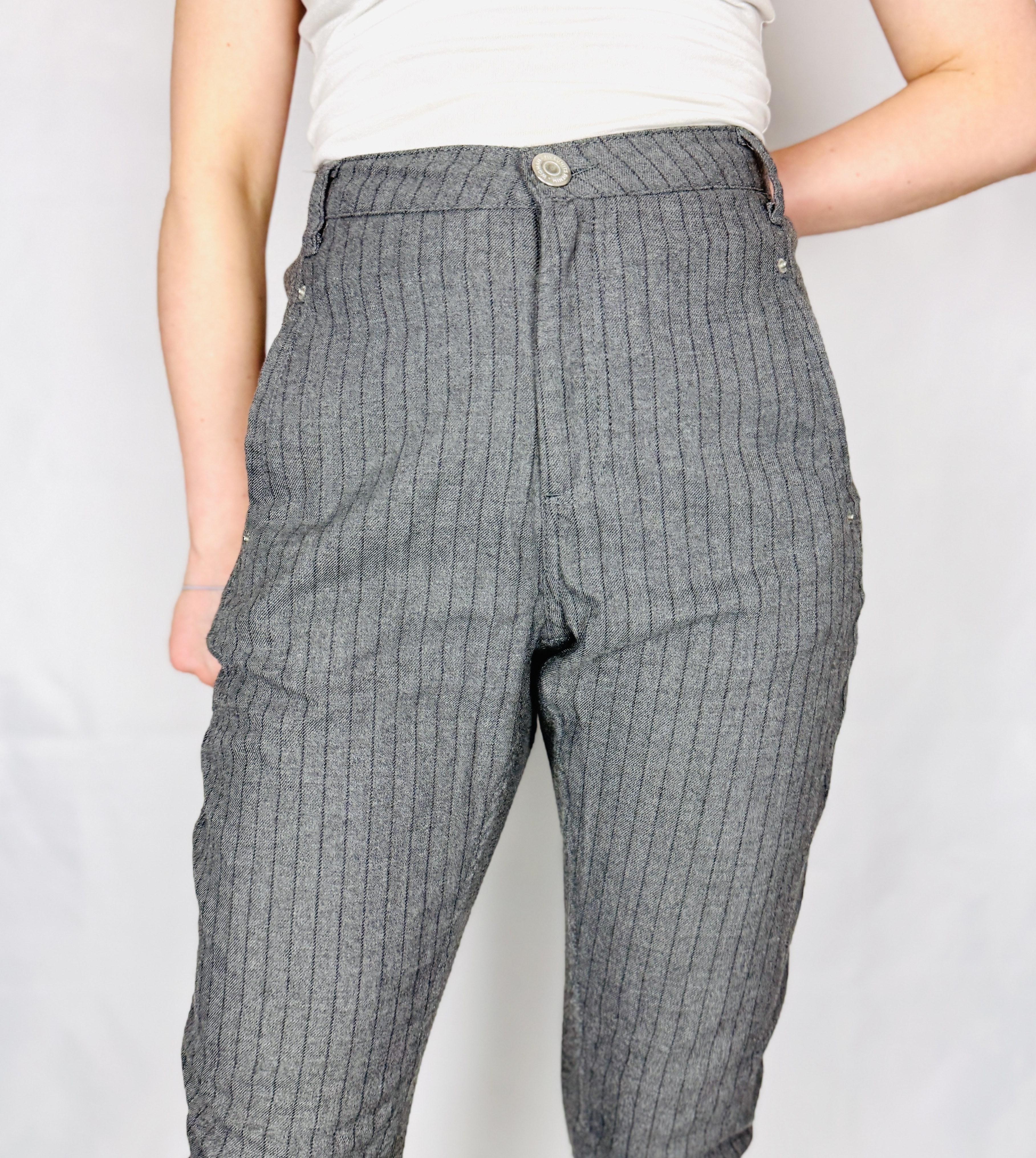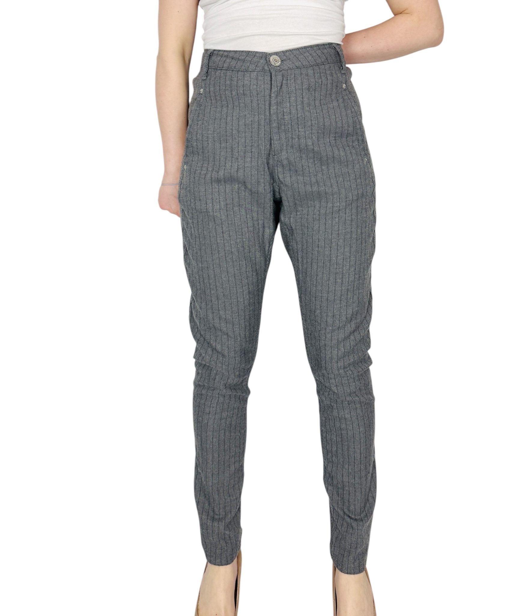 To elegancka i kobieca propozycja, która łączy klasyczny wzór pasków z delikatnie współczesnym, uporządkowanym krojem. Subtelna, pionowa linia pasków nadaje spodniom uporządkowaną rytmikę i lekko retro charakter, a wysoki stan dodaje modelowi wyrafinowania — całość emanuje spokojną, kobiecą pewnością siebie, idealną zarówno do biura, jak i bardziej eleganckich, codziennych zestawów.