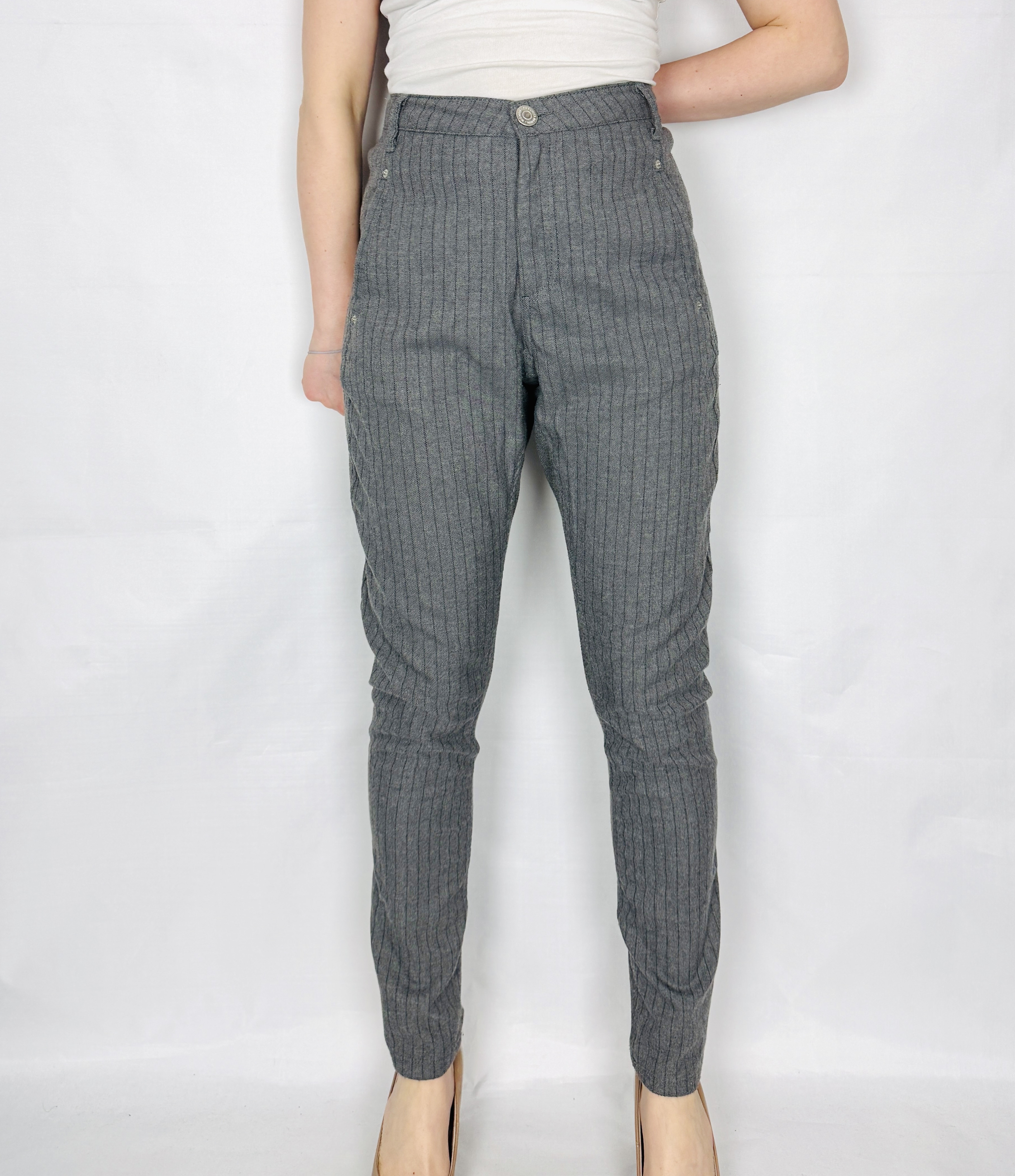 Fason wyróżnia się podwyższonym stanem z widocznym zapięciem na guzik i szlufkami, które porządkują górną partię. Przód jest gładki i prosty, bez zbędnych ozdób, co pozwala wzorowi grać pierwsze skrzypce; nogawki prowadzone są w dopasowaną, smukłą linię ku kostce, tworząc efekt wysmuklenia. Subtelne pionowe paski optycznie wydłużają sylwetkę, a lekko miękkie fałdki w okolicy kolan i bioder podkreślają naturalny ruch tkaniny, nadając spodniom przyjemnego, dopracowanego wyrazu.