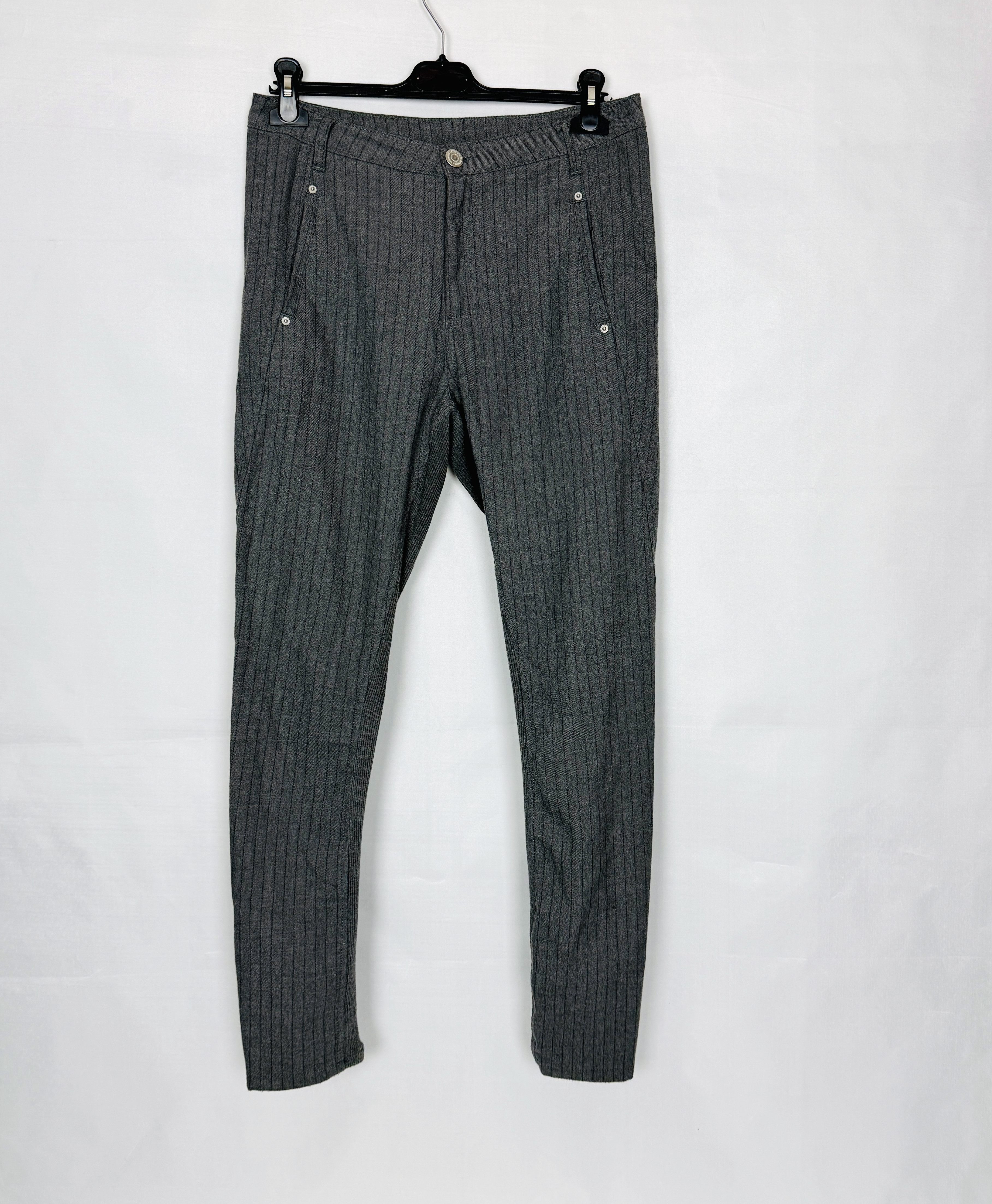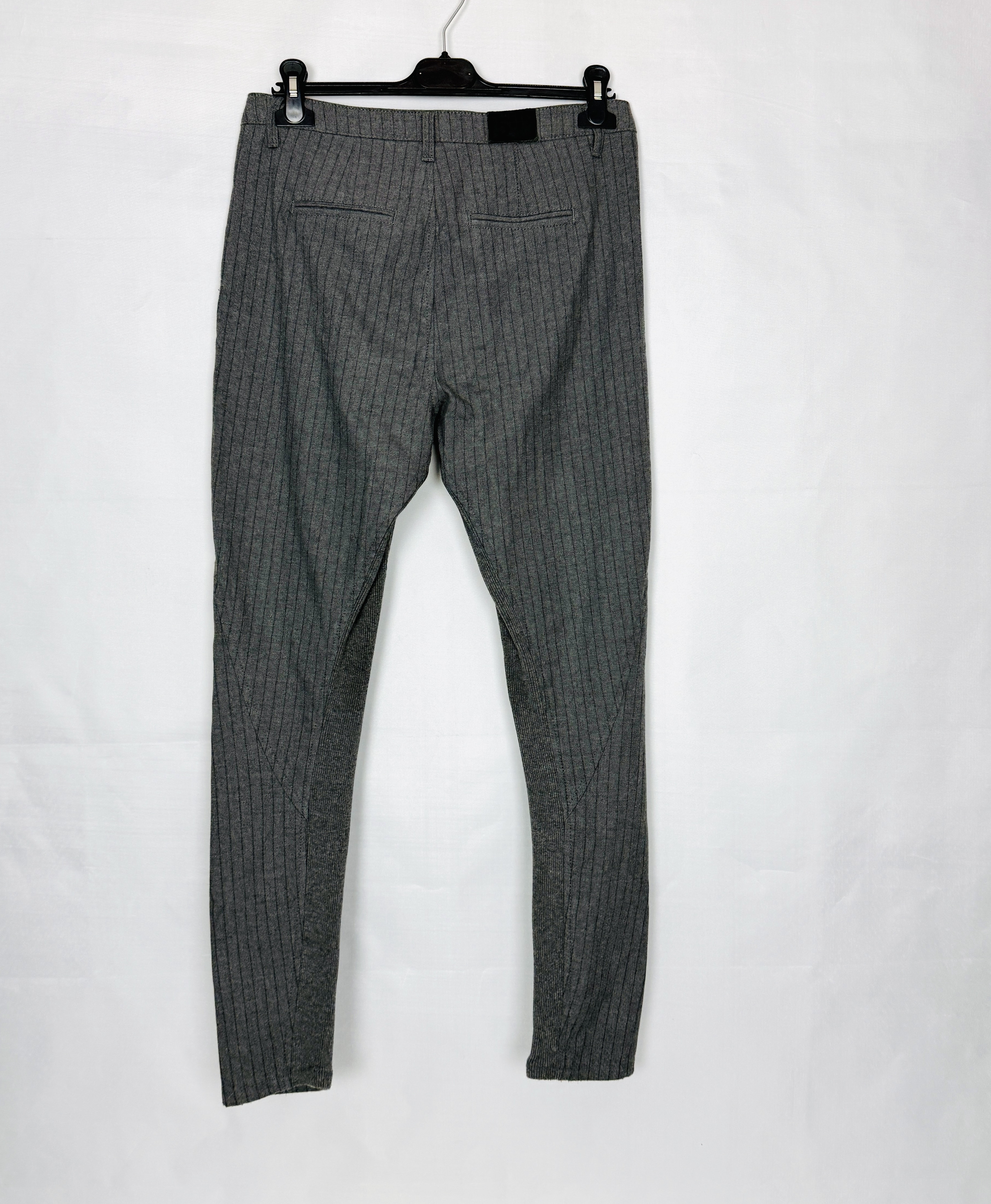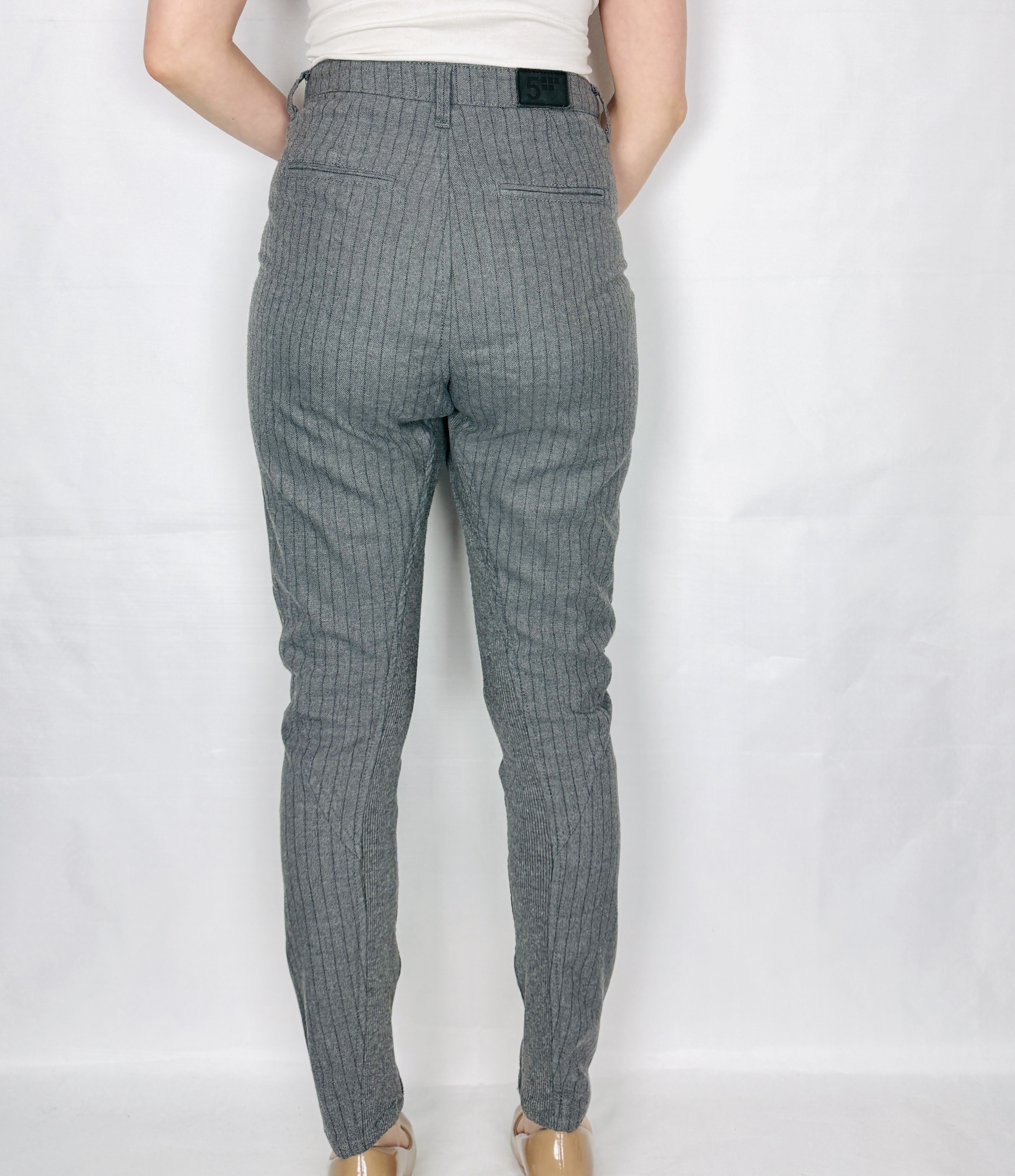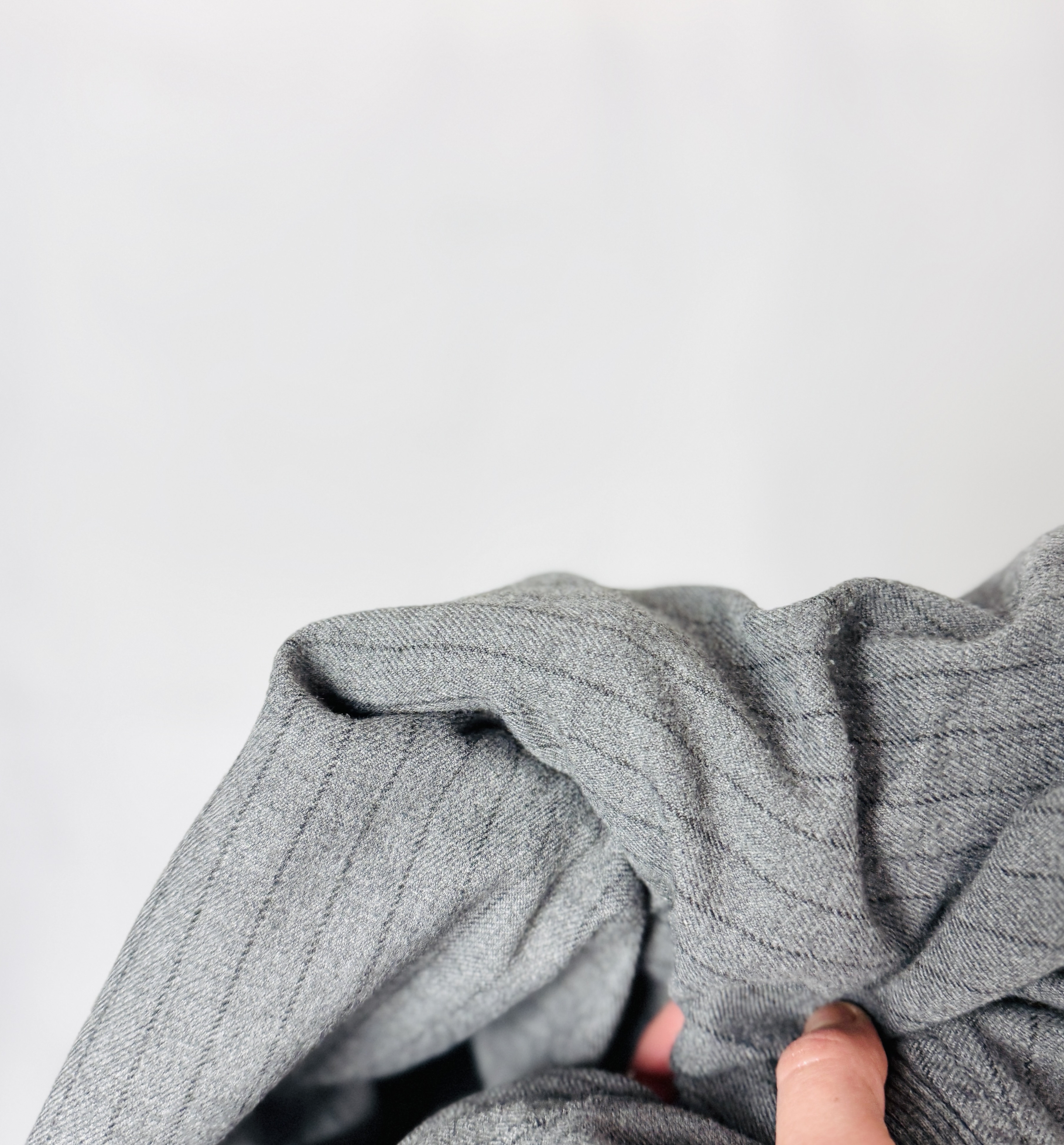 Materiał prezentuje się jako gładki i nieco strukturalny, z umiarkowaną elastycznością, która zapewnia komfort bez utraty formy. Powierzchnia ma stonowane, matowe wykończenie, a pionowy deseń dodaje tkaninie wyraźnej rytmiki i elegancji. Spodnie układają się miękko w miejscach zgięć, co potwierdza ich praktyczność w codziennym użytkowaniu — trzymają porządną linię, ale nie wyglądają sztywno.