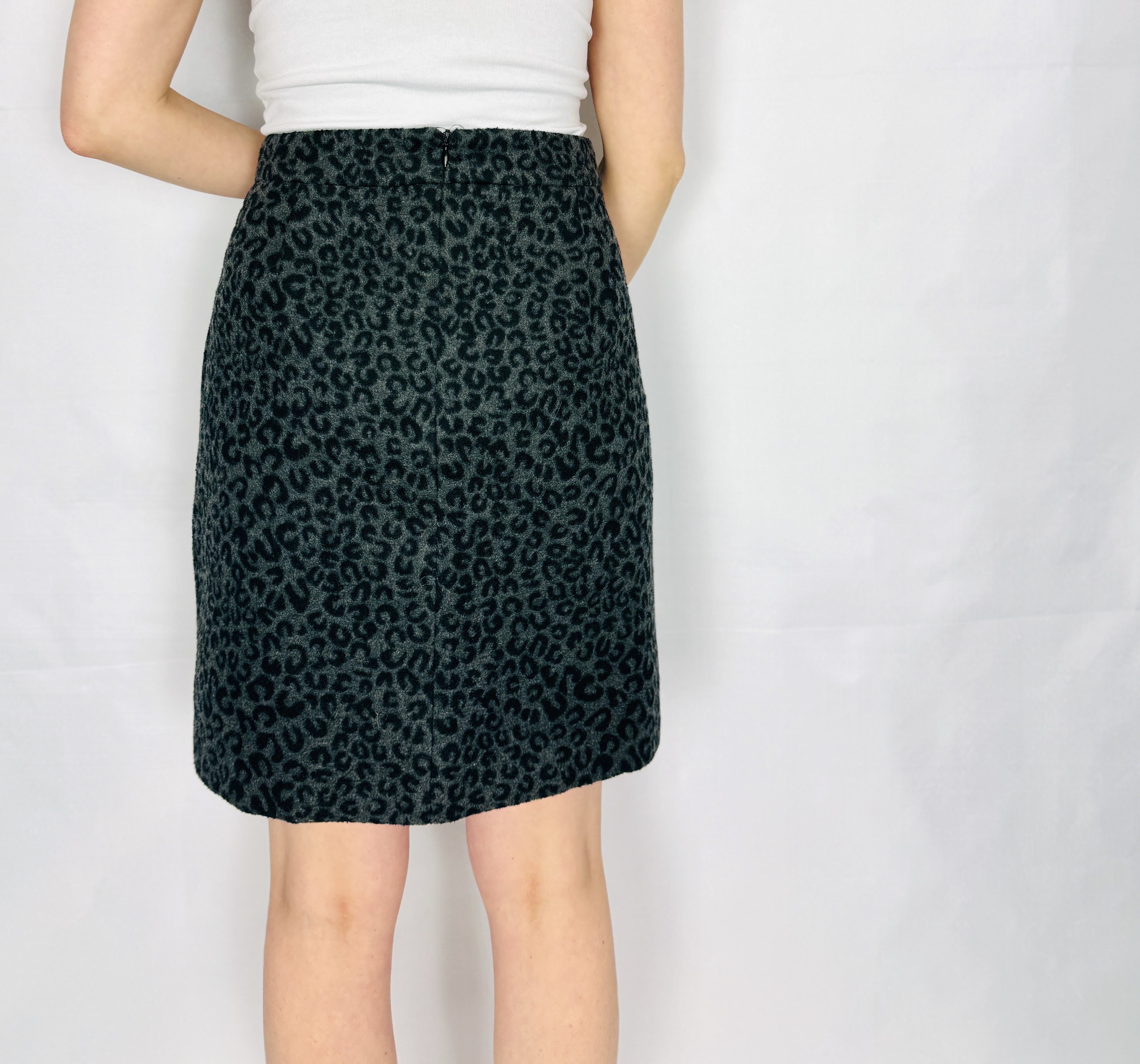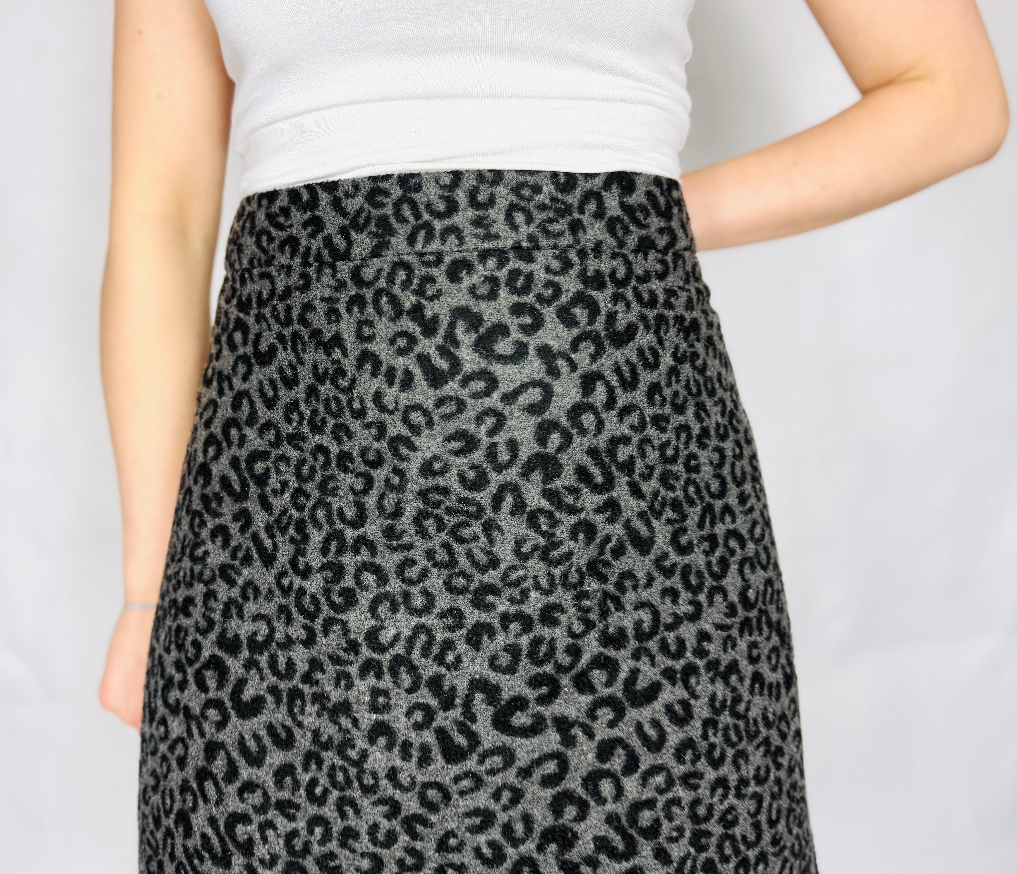 Ta spódnica to elegancka i jednocześnie odważna interpretacja zwierzęcego motywu — subtelna, szaro‑czarna paleta sprawia, że cętki nabierają wyrafinowanego, niemal tonującego charakteru, zamiast krzyczeć o uwagę. Jej nastrój jest zmysłowy i spokojny zarazem: klasyczna forma spotyka się tu z dekoracyjnym wzorem, dzięki czemu całość wygląda szykownie, ale także bardzo współcześnie. To propozycja dla kobiet, które chcą wprowadzić do garderoby wyrazisty akcent, zachowując przy tym stonowaną elegancję.
