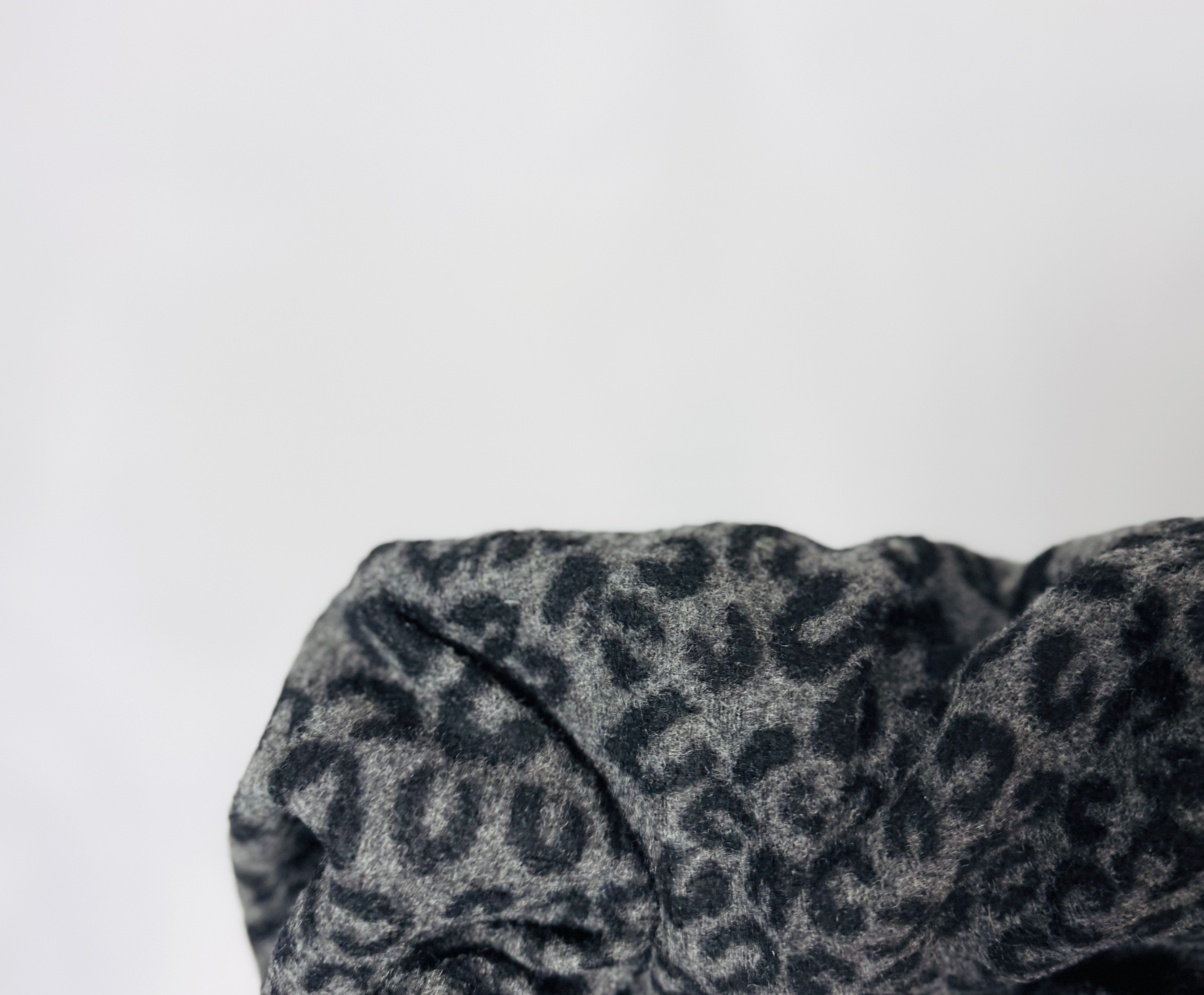 Materiał prezentuje się jako nieco strukturalny i lekko mięsisty, o przyjemnej fakturze; czarne cętki mają odcień i gęstość, które sprawiają wrażenie delikatnego, aksamitnego wykończenia na tle szarego tła. Tkanina trzyma formę, ale towarzyszy ruchowi, tworząc subtelne układania i miękkie fałdowania podczas chodzenia, co dodaje całości naturalnego, kobiecego dynamizmu. Powierzchnia ma wyraźny charakter tekstury, który sprawia, że wzór wygląda ciekawiej niż zwykły nadruk.