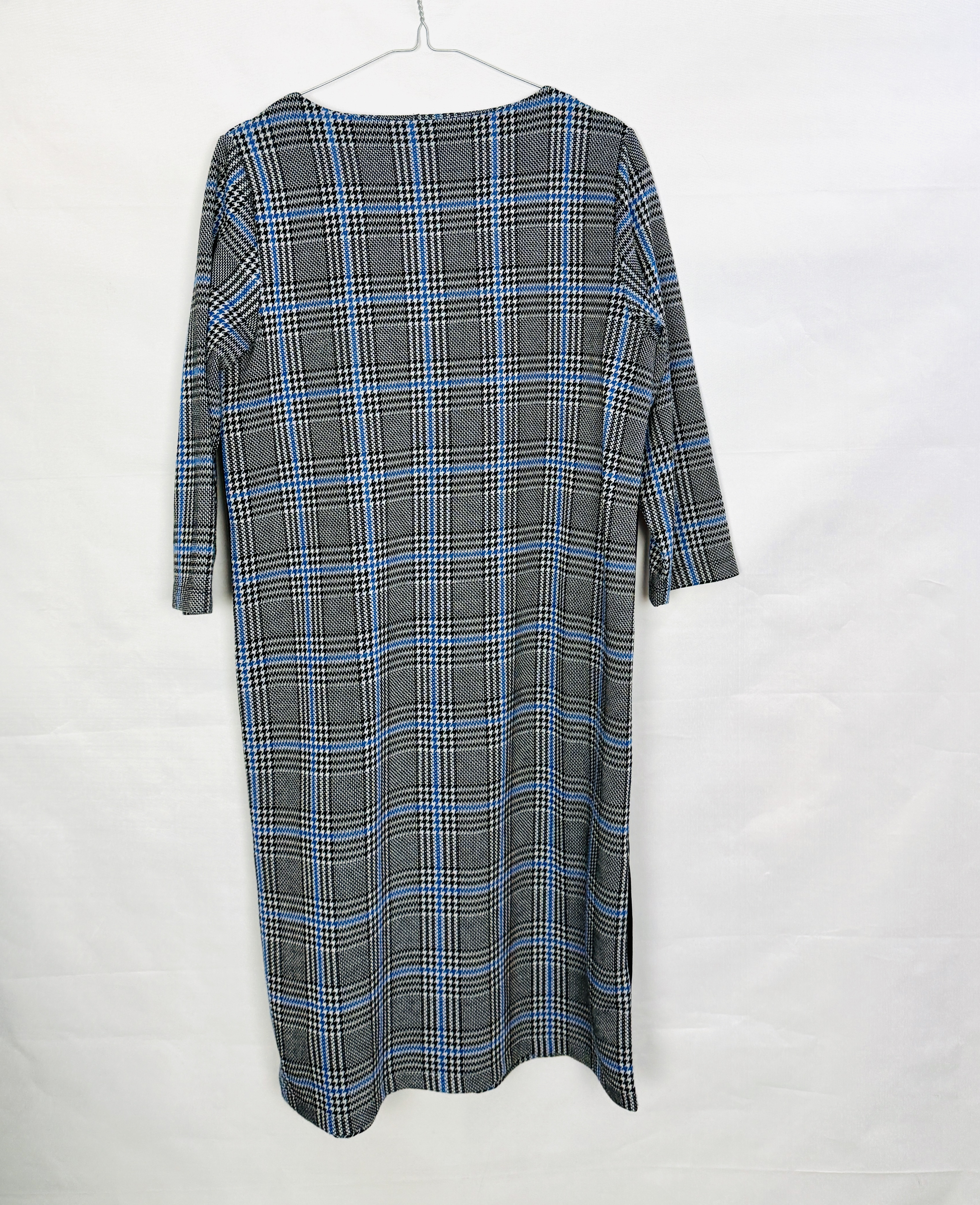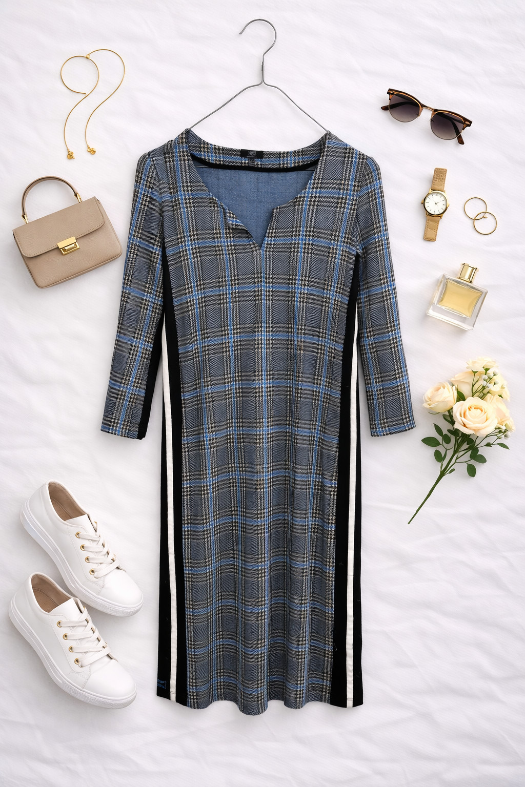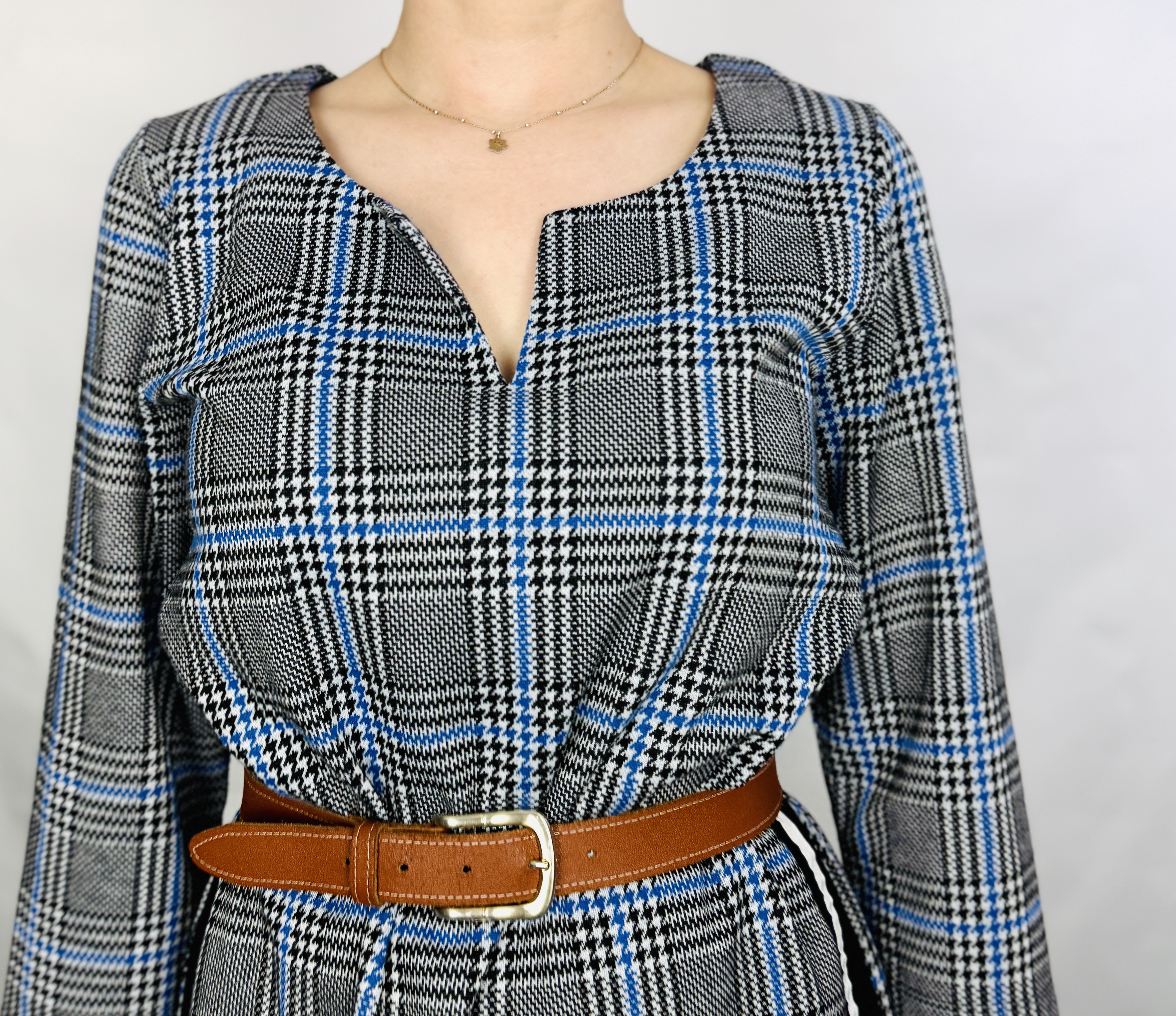 Ta sukienka to spojenie klasycznej elegancji z nowoczesnym rytmem wzoru — drobna krata w odcieniach szaro i czerni przepleciona subtelnym akcentem niebieskiego nadaje projektowi szykownego, lekko retro charakteru, jednocześnie zachowując świeżość i miejską elegancję. Fason wypada uporządkowanie i kobieco: stonowana paleta barw sprawia, że kreacja ma uniwersalny, a zarazem charakterystyczny wyraz — to model, który daje poczucie pewności siebie i dobrego smaku bez zbędnej ostentacji.