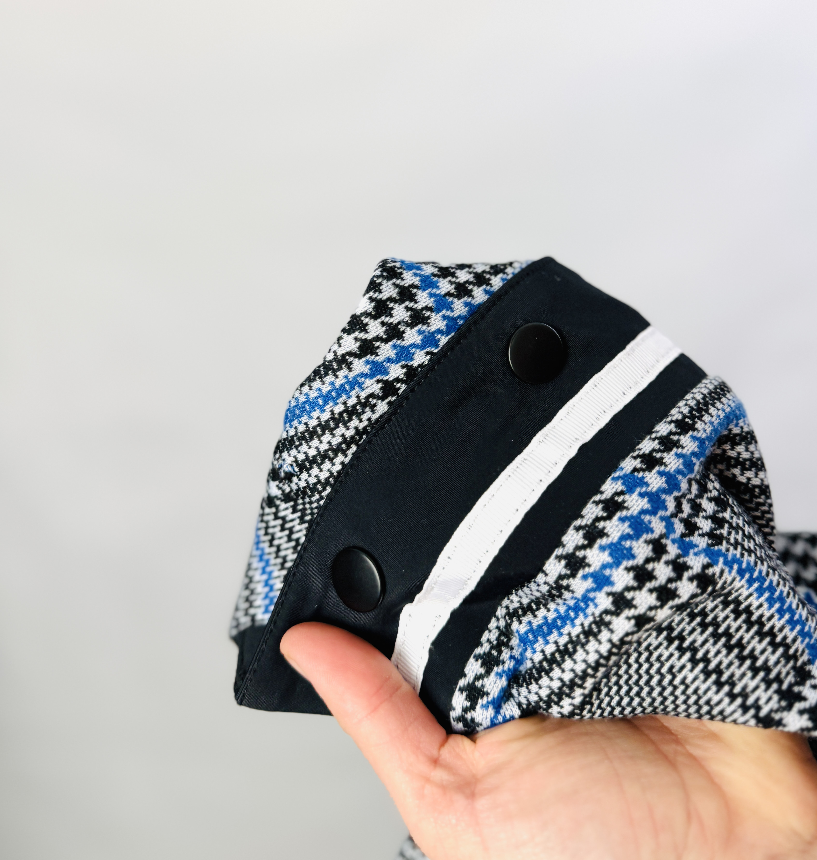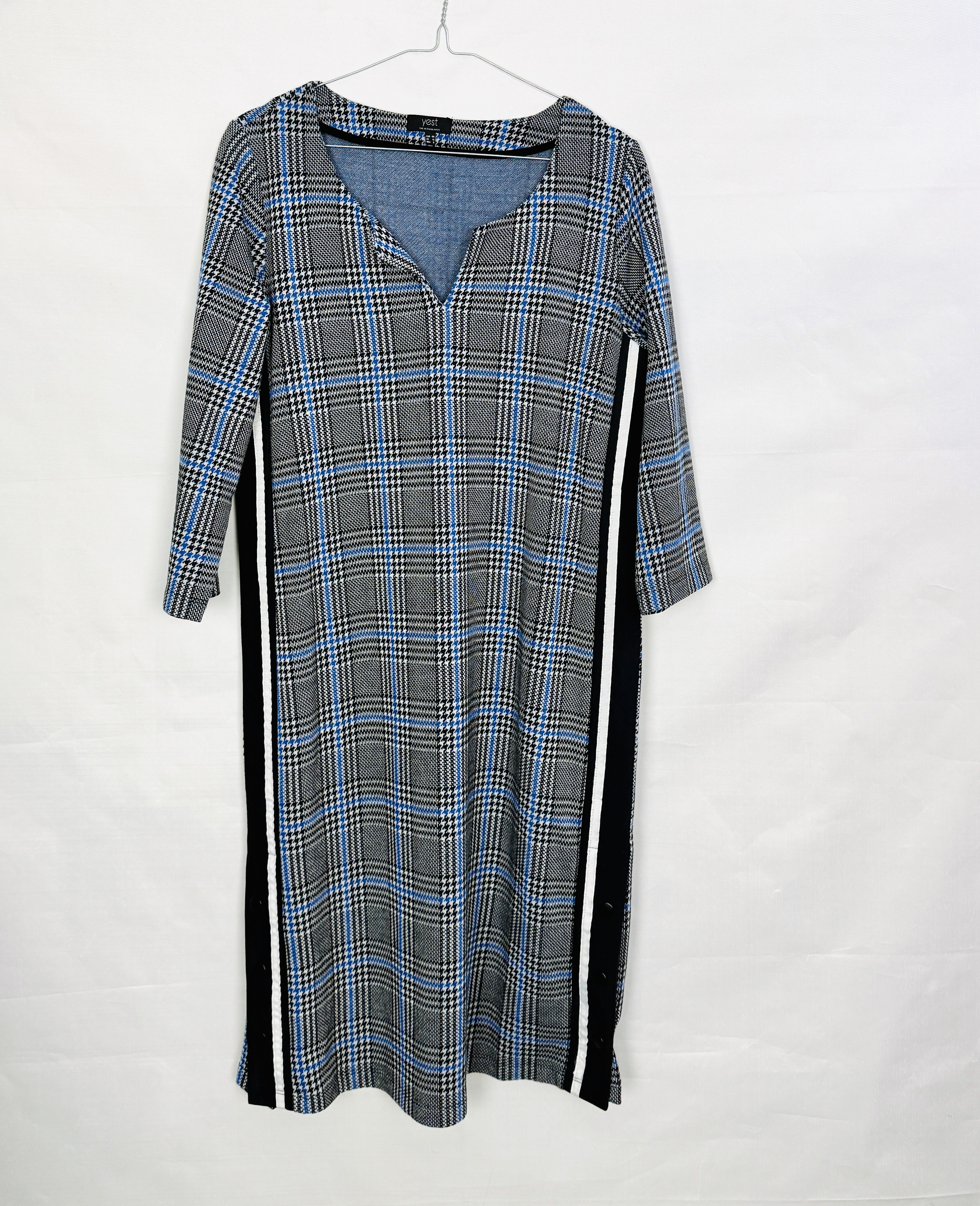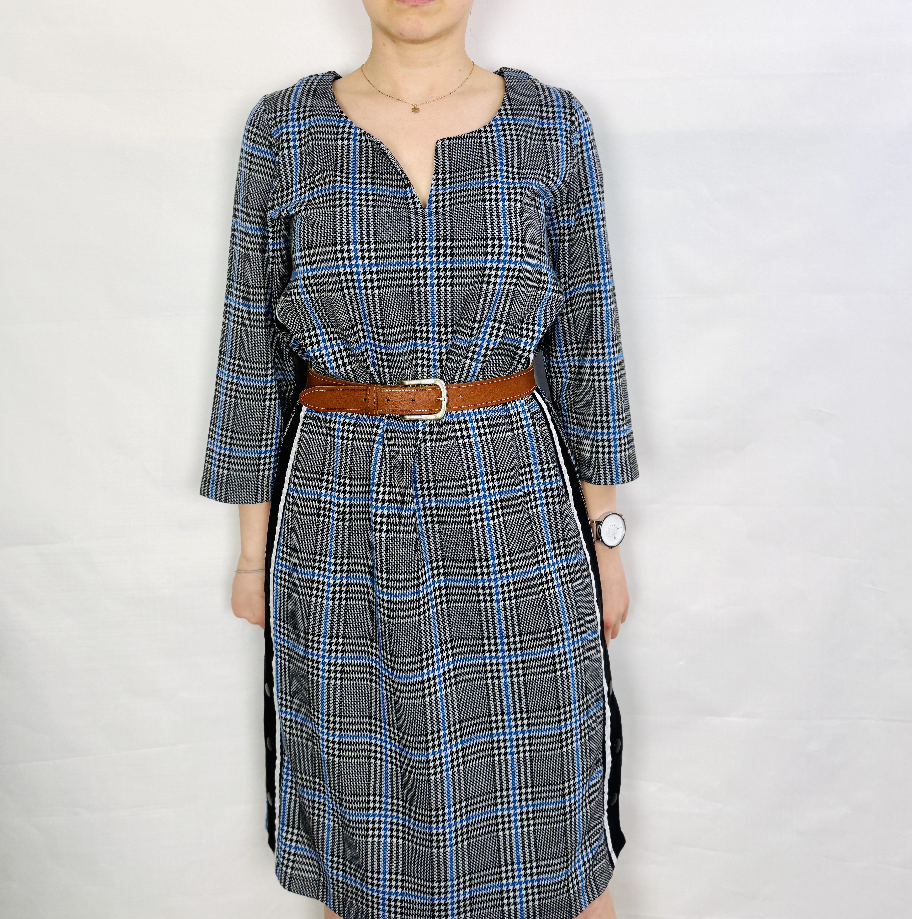 Ta sukienka to spojenie klasycznej elegancji z nowoczesnym rytmem wzoru — drobna krata w odcieniach szaro i czerni przepleciona subtelnym akcentem niebieskiego nadaje projektowi szykownego, lekko retro charakteru, jednocześnie zachowując świeżość i miejską elegancję. Fason wypada uporządkowanie i kobieco: stonowana paleta barw sprawia, że kreacja ma uniwersalny, a zarazem charakterystyczny wyraz — to model, który daje poczucie pewności siebie i dobrego smaku bez zbędnej ostentacji.