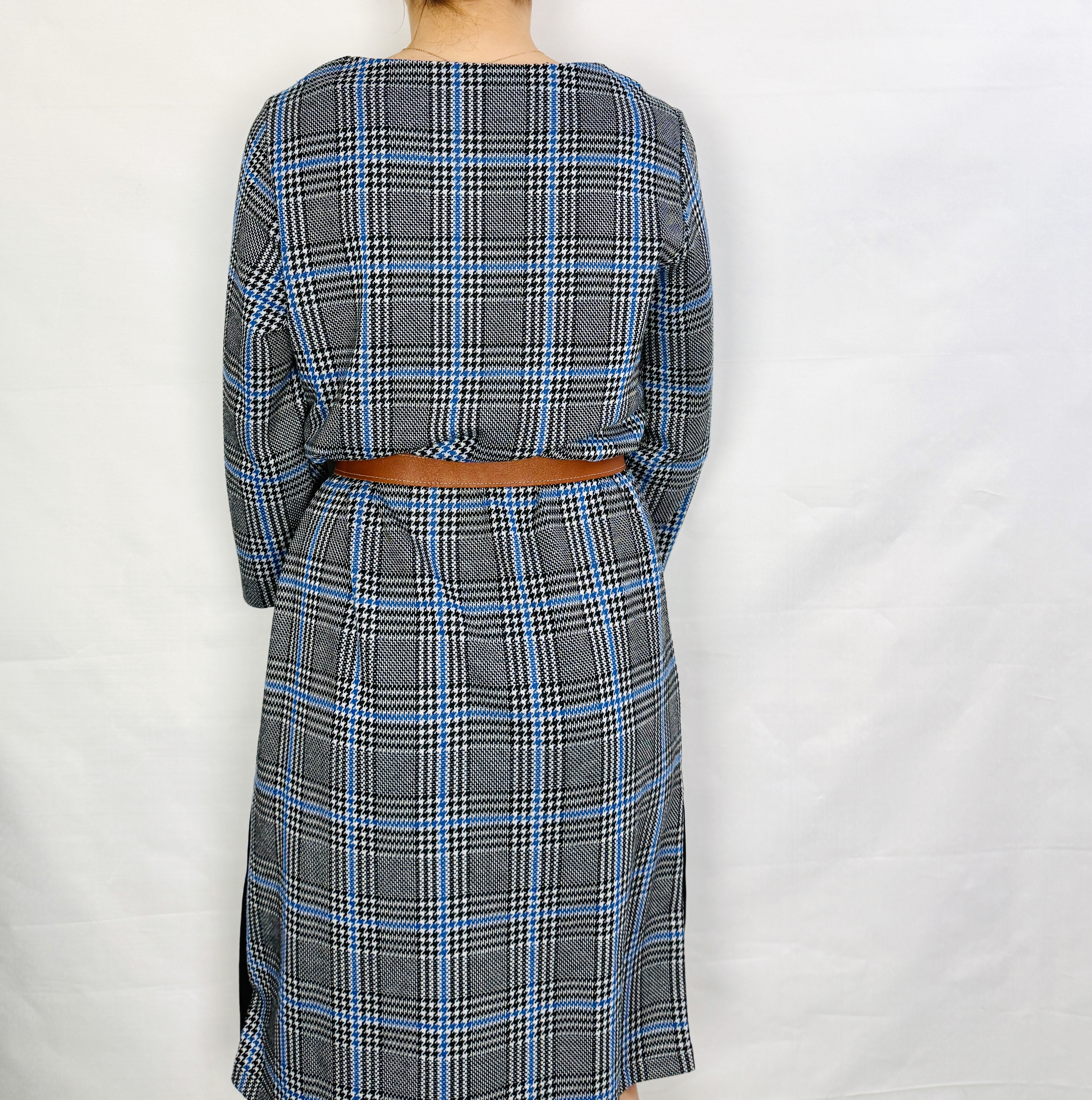 Dół sukienki ma prostą, lekko prosto opadającą linię o długości sięgającej do kolan, która nadaje całości wyważonego, kobiecego wyrazu. Materiał prezentuje się jako strukturalny, nieco grubszy splot o gładkim, uporządkowanym wykończeniu — tkanina trzyma formę, delikatnie otula sylwetkę i tworzy subtelne fałdy przy ruchu, co dodaje projektowi uroku i komfortu noszenia. Regularność kratki oraz czytelność geometrycznego wzoru podkreślają schludność kroju, a jednocześnie nadają mu dekoracyjnego charakteru bez przesady.