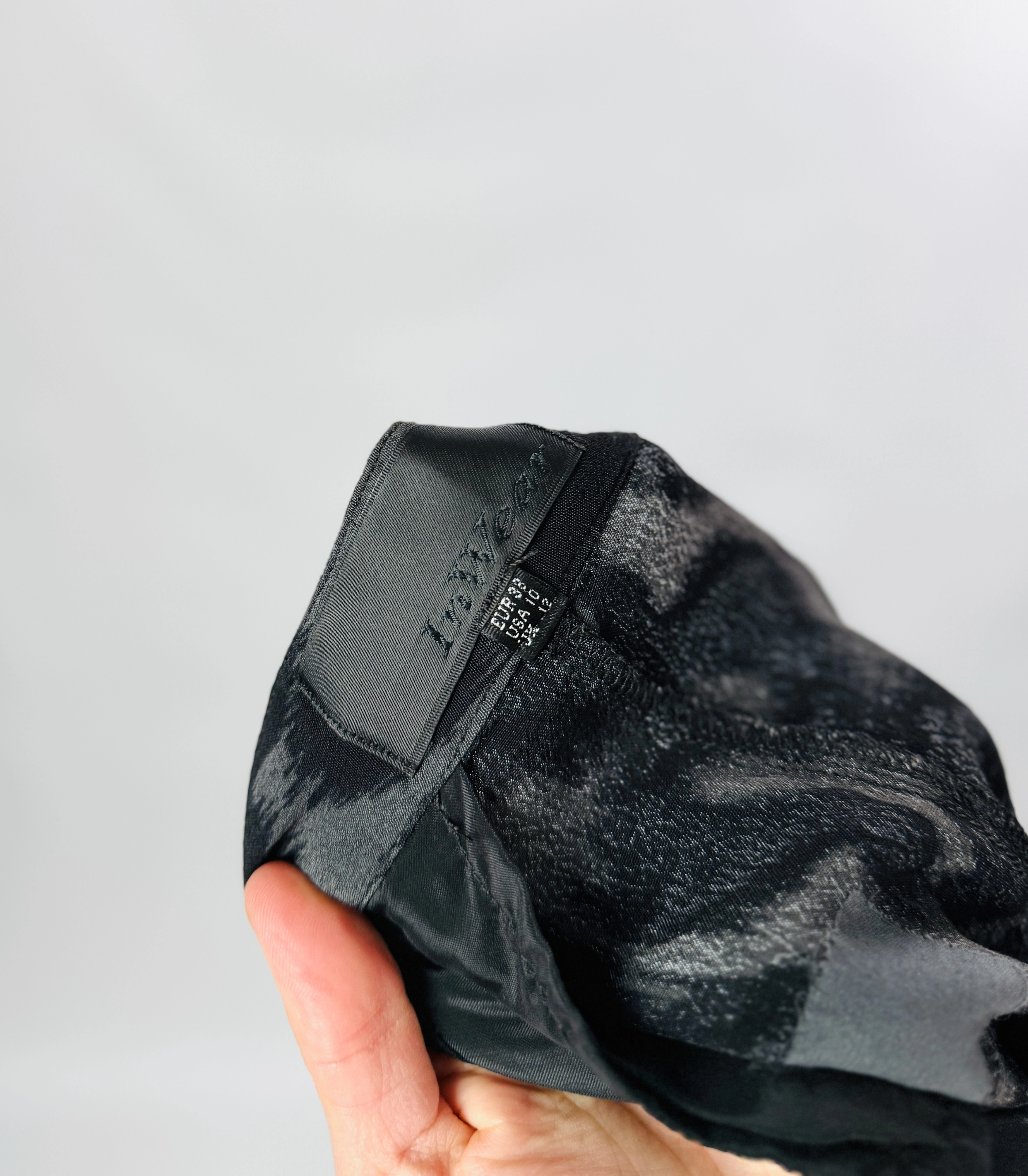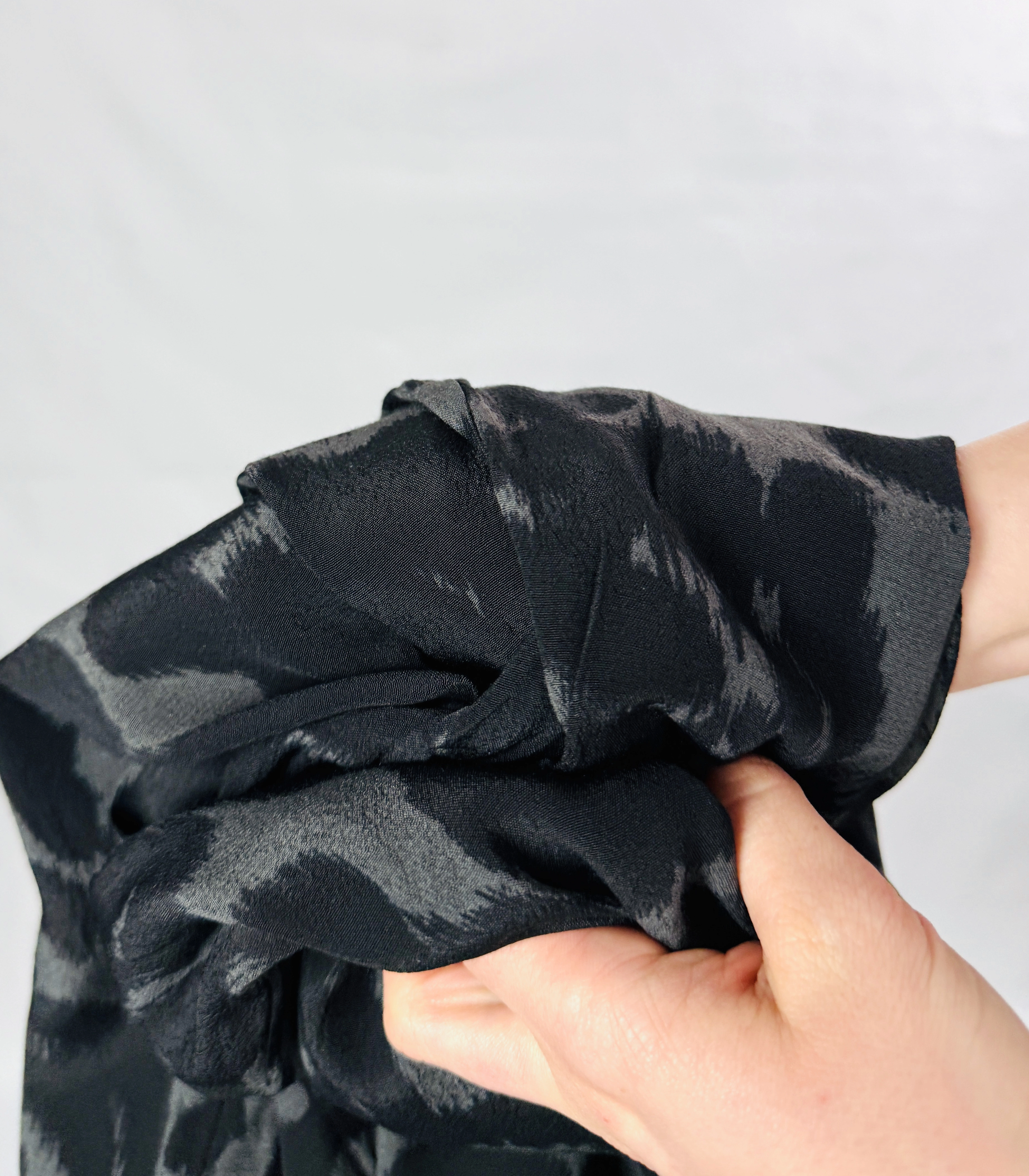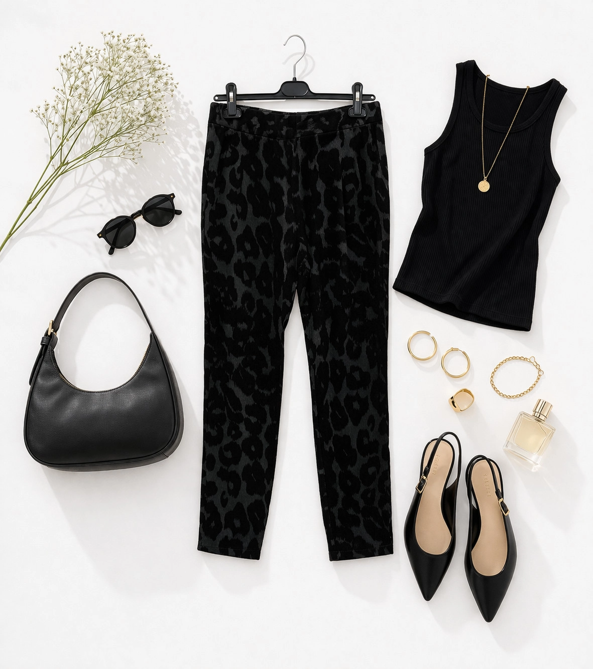 Wysoki stan spodni optycznie wydłuża nogi i podkreśla talię, co sprzyja wysmukleniu sylwetki i zbalansowaniu proporcji, szczególnie u kobiet o figurze klepsydry i prostokąta. Szaro czarny wzór dodaje całości wyrazistości i charakteru, a jednocześnie pozostaje na tyle subtelny, by nie przytłaczać minimalistycznej formy spodni.