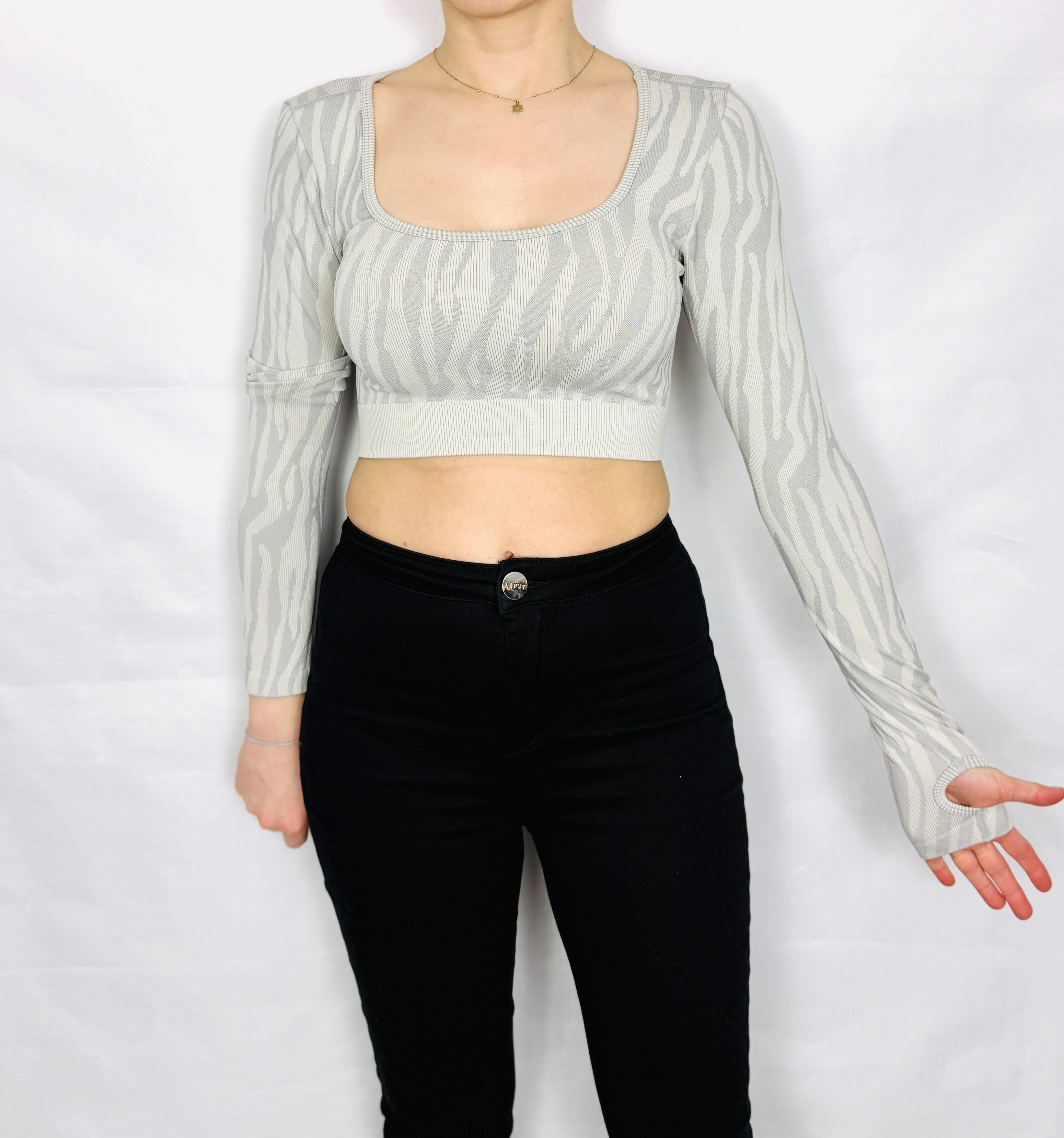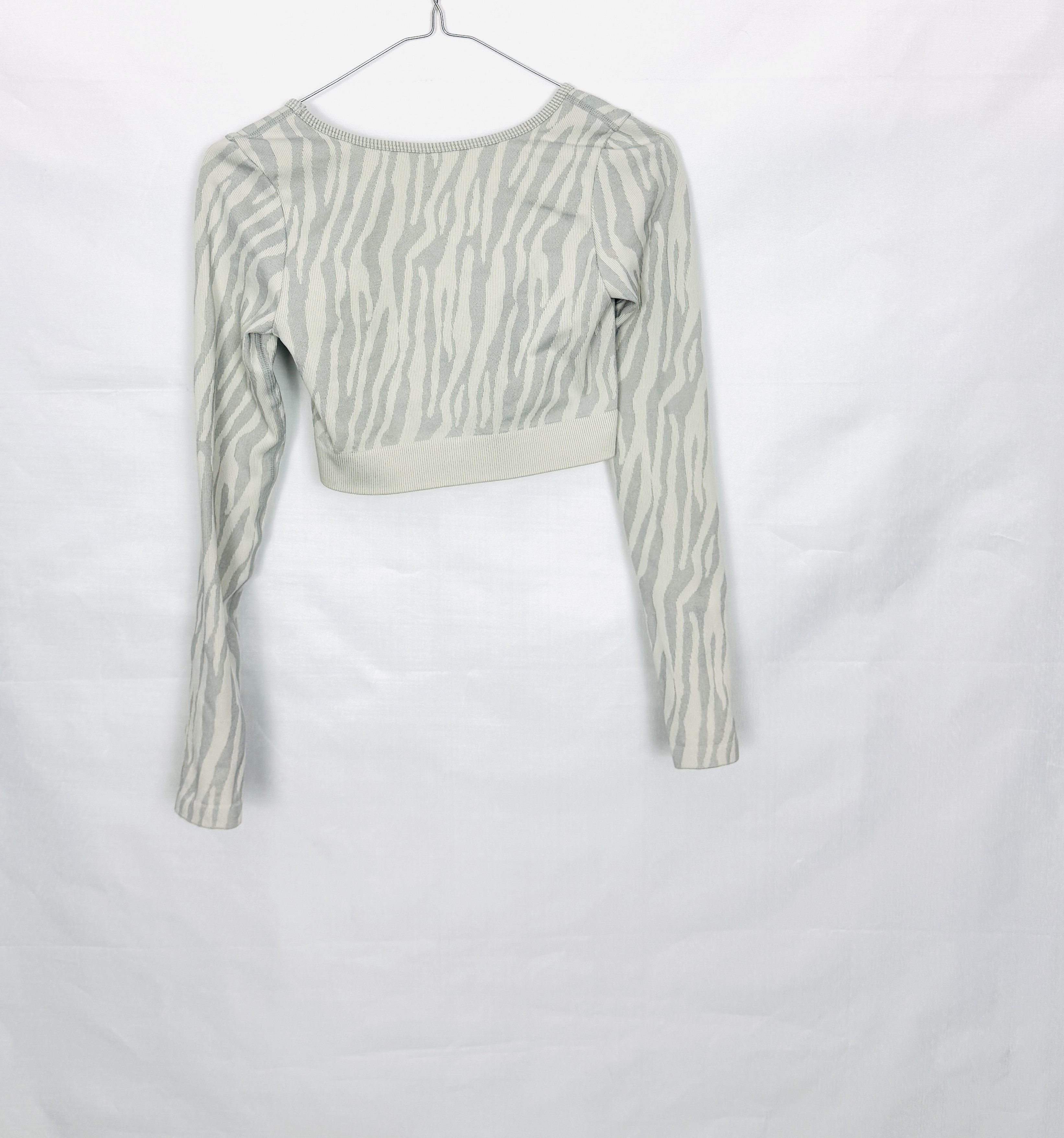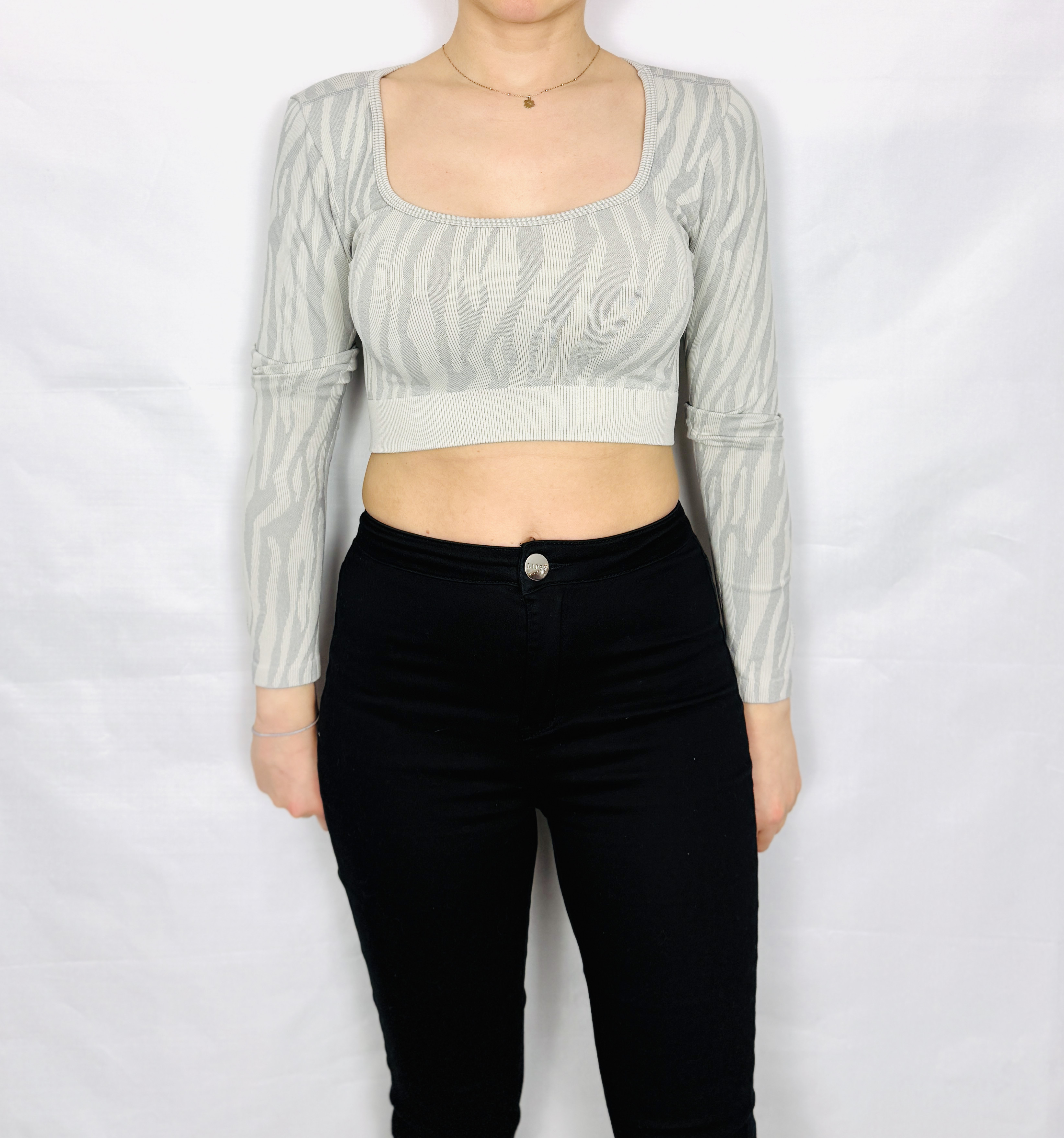 Ten crop top to delikatne połączenie sportowego luzu i subtelnej kobiecości — jasnoszarawy odcień z subtelnym, zebra‑like wzorem nadaje mu lekkiego, nowoczesnego charakteru, który jest jednocześnie bardzo kobiecy i stylowy. Krótka forma i wyraźnie zaznaczona linia pod biustem tworzą świeży, energetyczny nastrój, idealny dla osób poszukujących modnego akcentu do codziennych i swobodniejszych stylizacji.