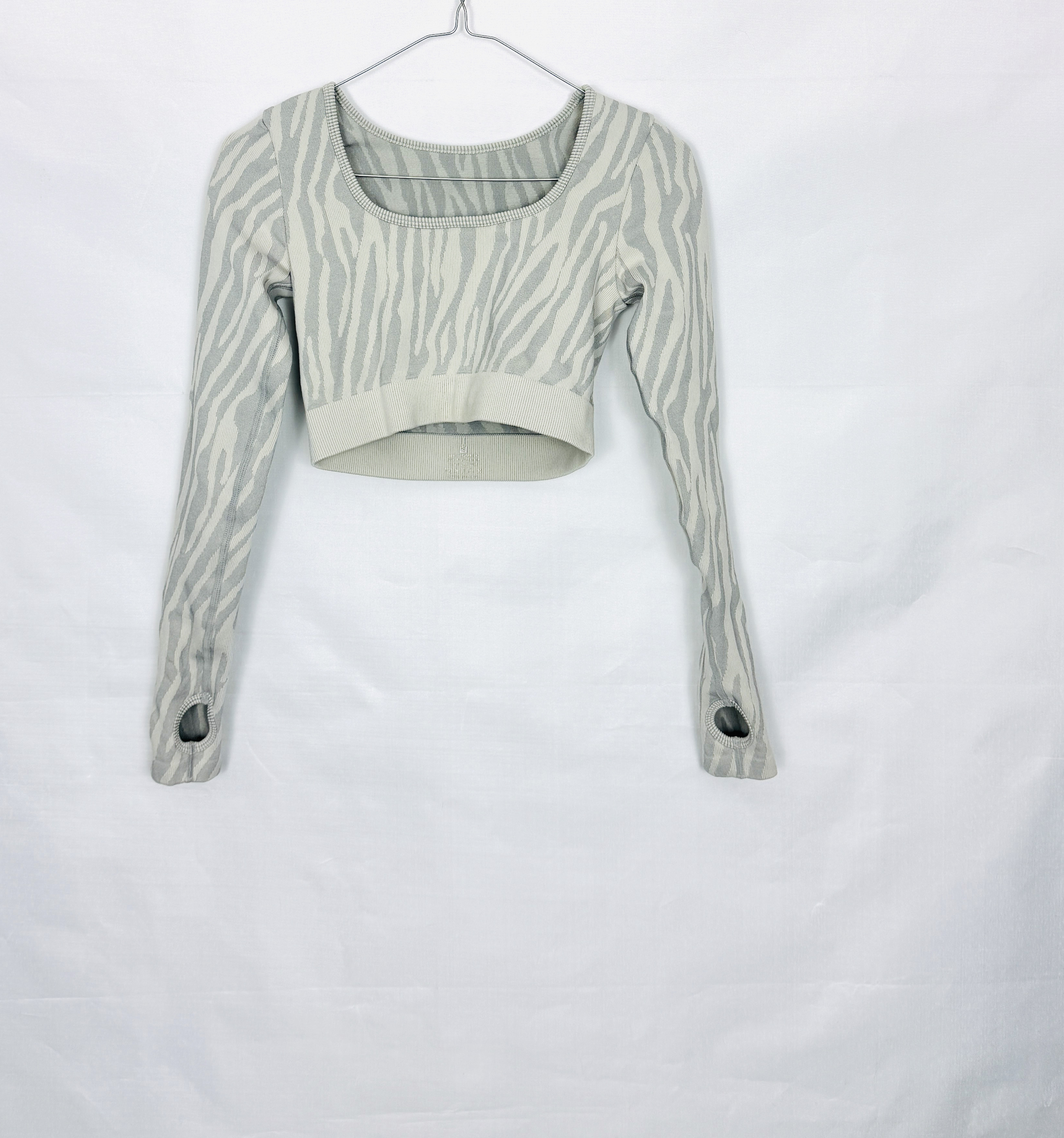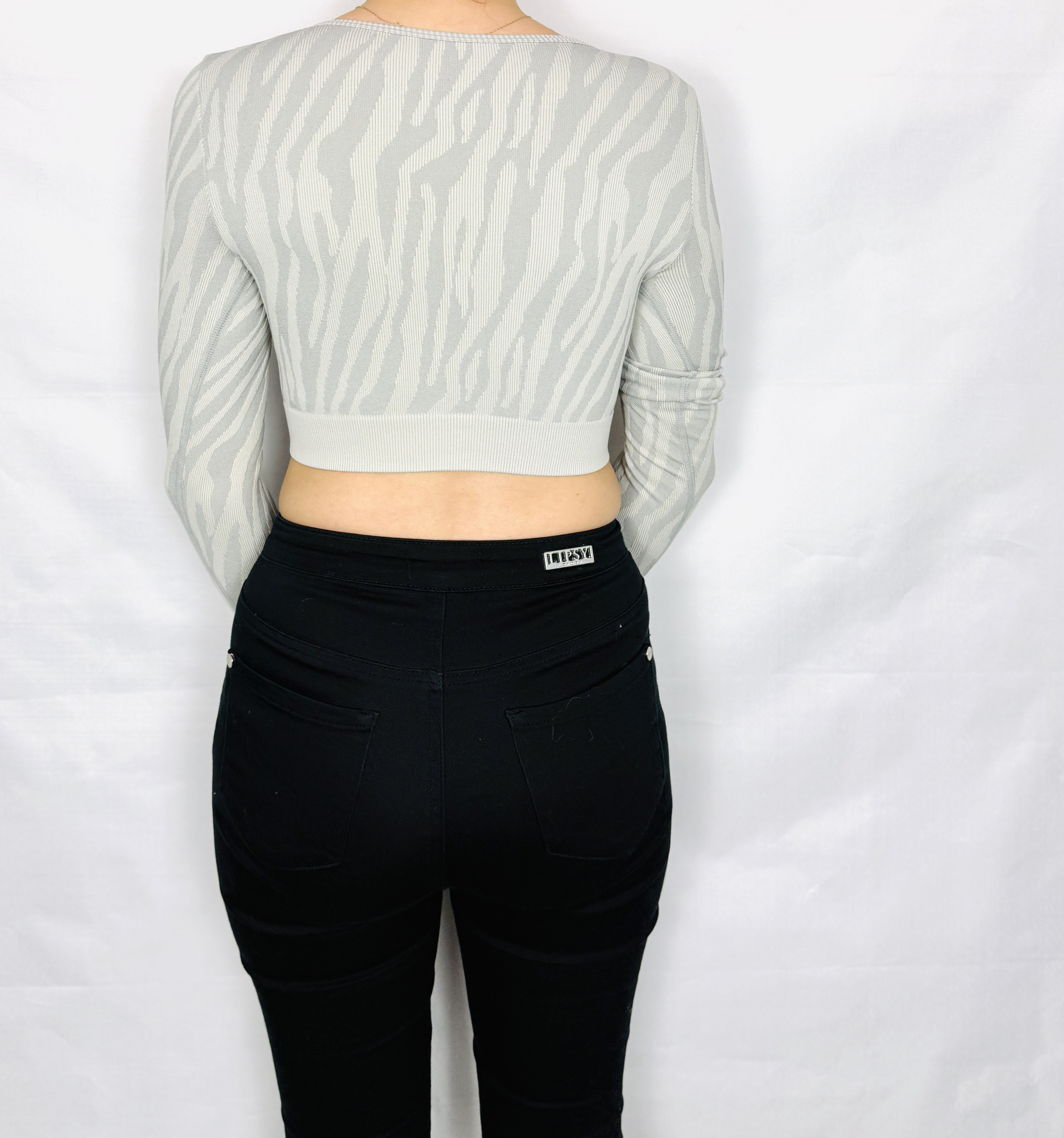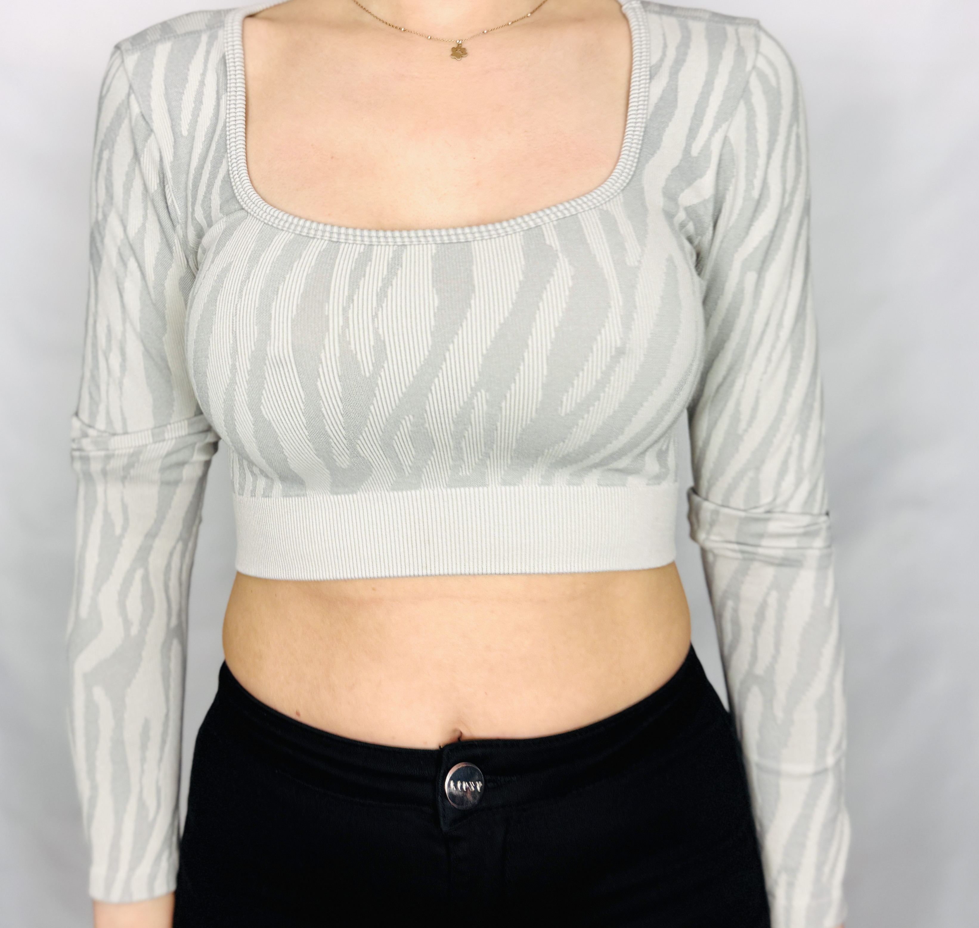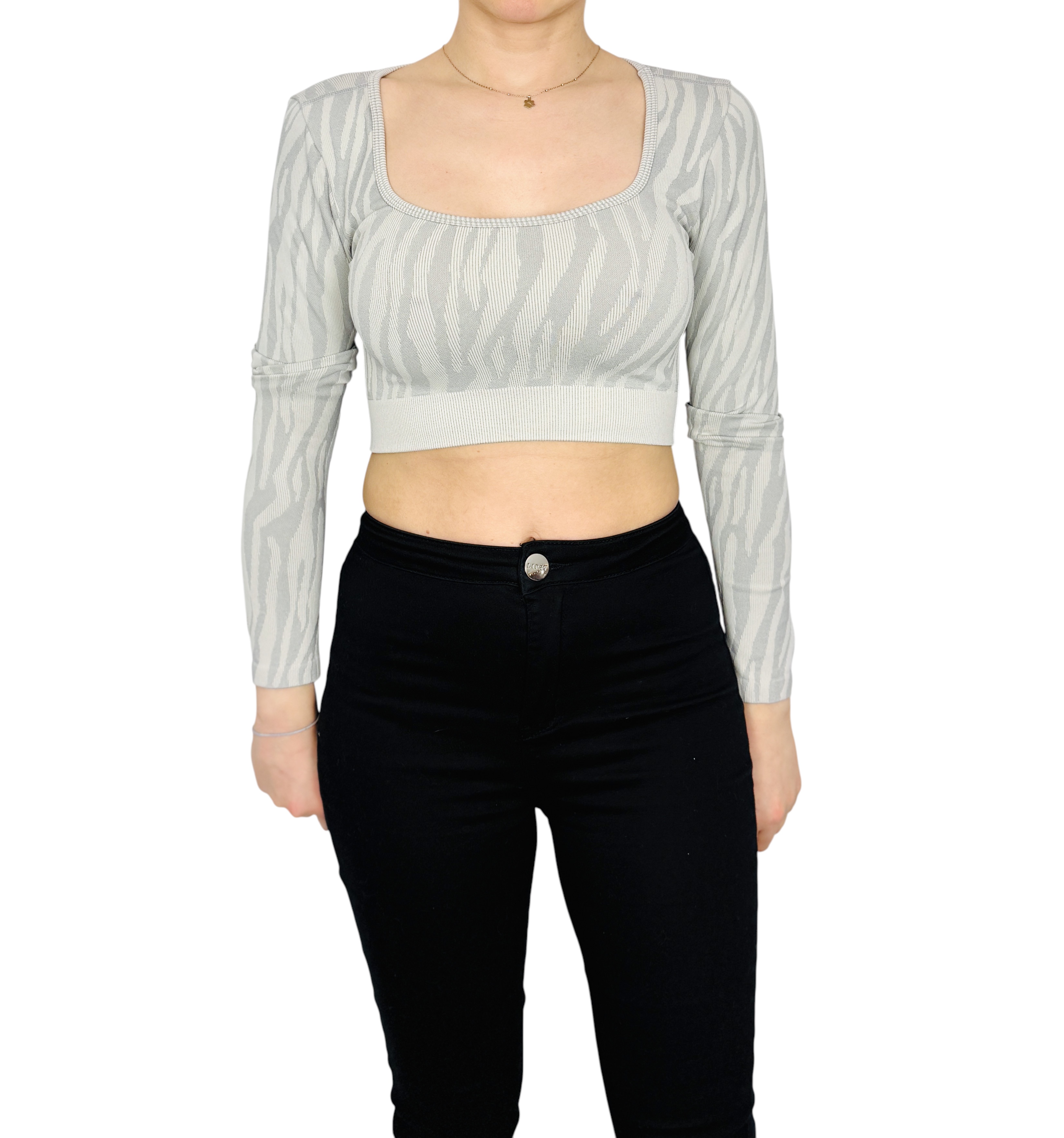 Ten crop top to delikatne połączenie sportowego luzu i subtelnej kobiecości — jasnoszarawy odcień z subtelnym, zebra‑like wzorem nadaje mu lekkiego, nowoczesnego charakteru, który jest jednocześnie bardzo kobiecy i stylowy. Krótka forma i wyraźnie zaznaczona linia pod biustem tworzą świeży, energetyczny nastrój, idealny dla osób poszukujących modnego akcentu do codziennych i swobodniejszych stylizacji.