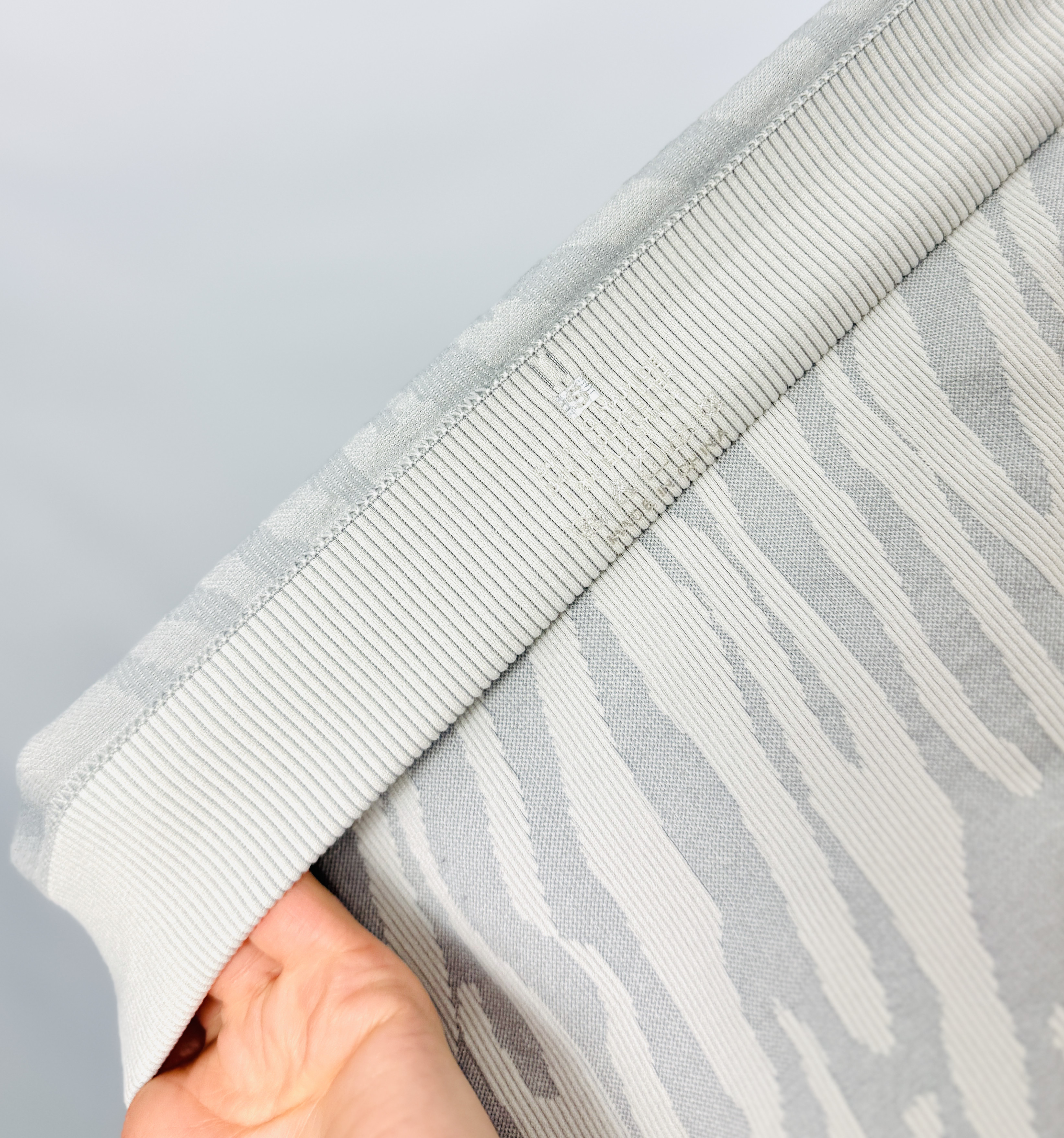 Powierzchnia tkaniny prezentuje się jako gładko prążkowana i delikatnie elastyczna — materiał wygląda na miękko dopasowujący się do ciała, bez nadmiernego połysku, co podkreśla jego codzienny, a zarazem uporządkowany charakter. Subtelna struktura splotu nadaje powierzchni przyjemną fakturę, która pięknie współgra z rytmem wzoru; dzięki temu top zachowuje schludny, wysmakowany wygląd, mimo sportowego rodowodu. Wykończenie brzegu pod biustem jest sprężyste i stabilne, co zapewnia komfort noszenia i ładne utrzymanie formy.