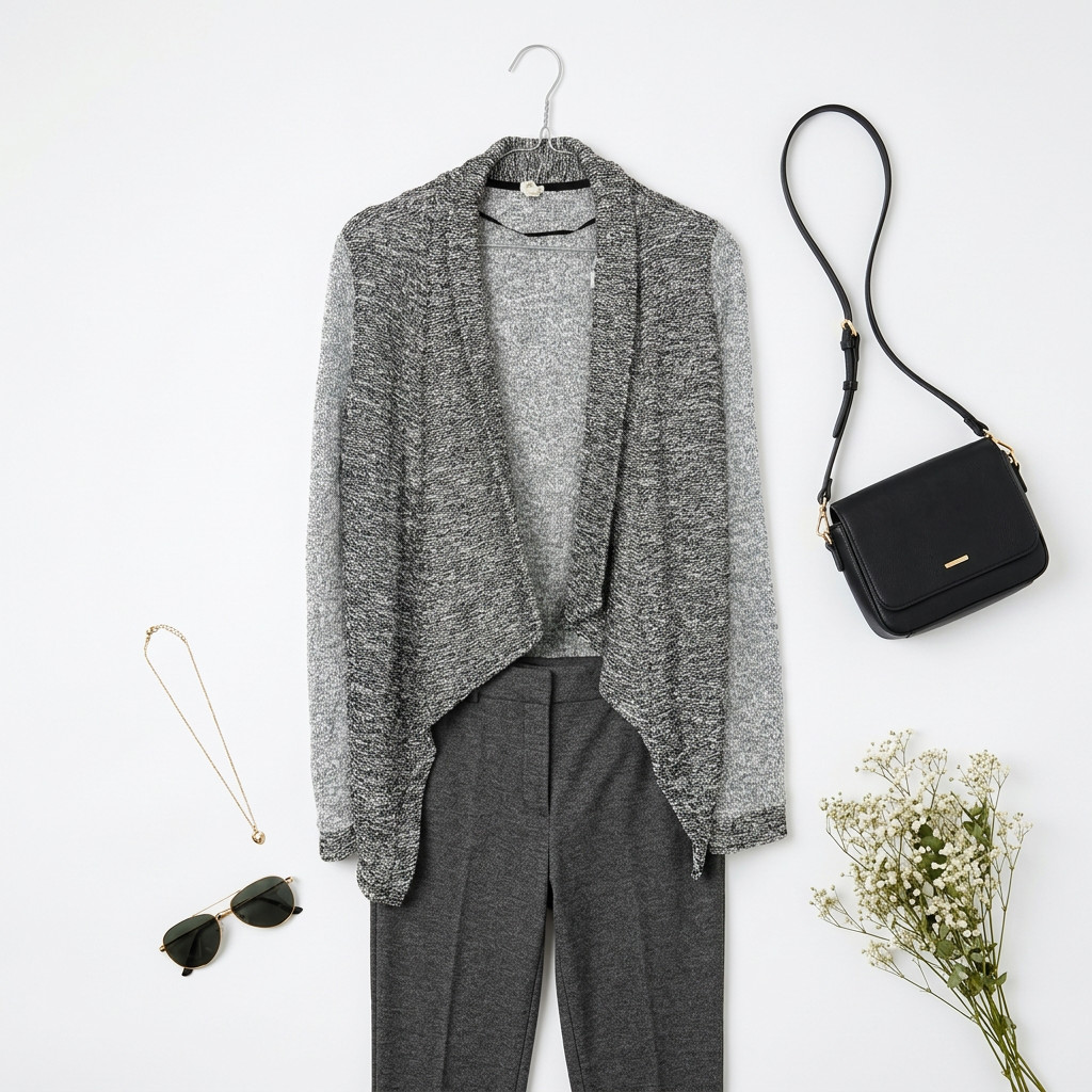 W stylizacjach żakiet jest niezwykle uniwersalny: na co dzień zestaw go z białym topem i ciemnym denimem oraz wygodnymi sneakersami lub botkami dla miejskiego, przytulnego looku; do pracy noś z wąskimi cygaretkami i loafersami lub niskimi czółenkami, tworząc schludny, lecz przyjemny zestaw; na wieczór połącz z dopasowaną sukienką lub gładkimi spodniami i subtelnymi obcasami, aby podkreślić lekkość drapowania. Szarość melanżu pięknie komponuje się z bielą, czernią, granatem, a także z ciepłymi beżami lub przygaszonym bordem, co pozwala tworzyć zarówno stonowane, jak i bardziej wyraziste połączenia.