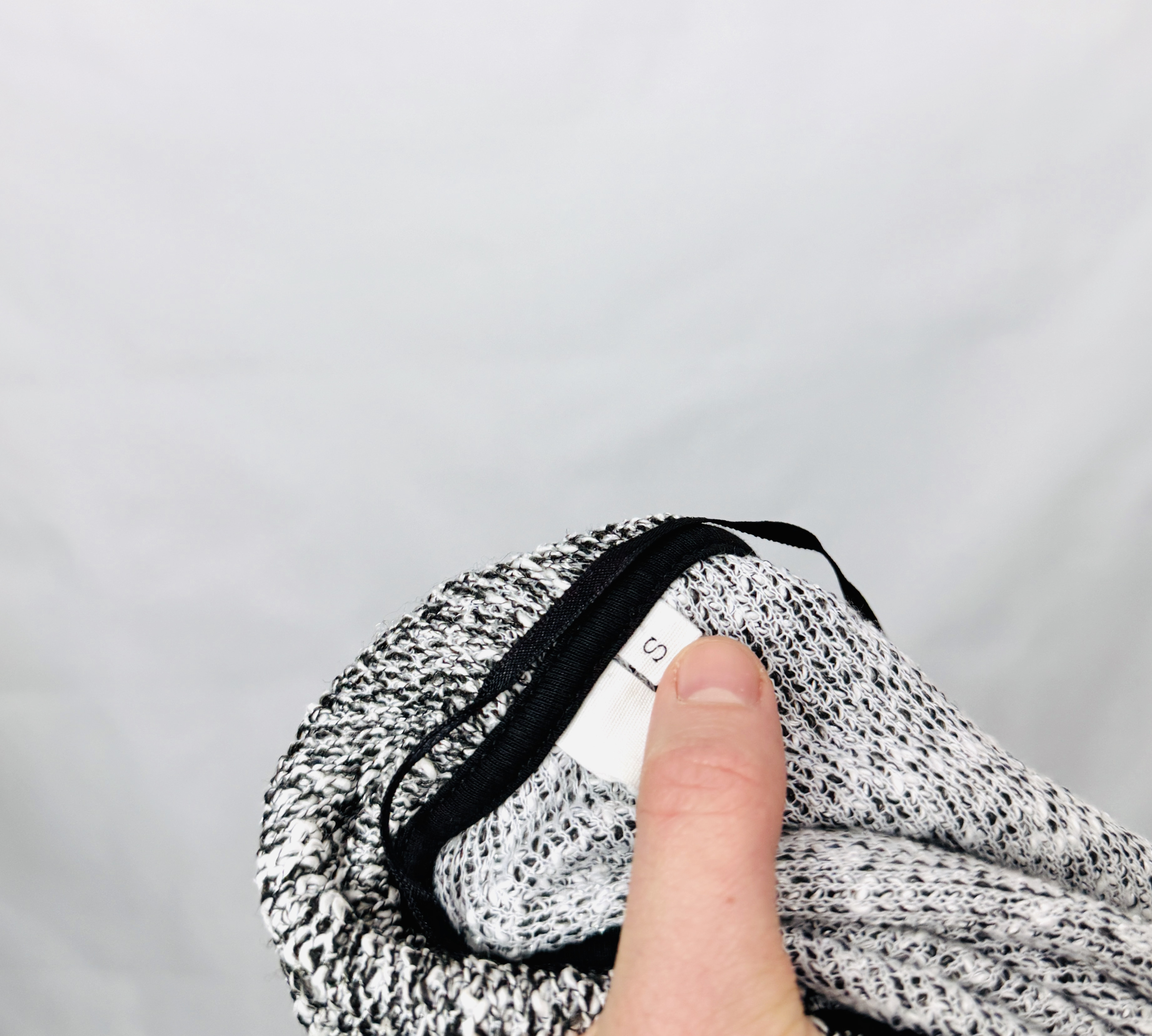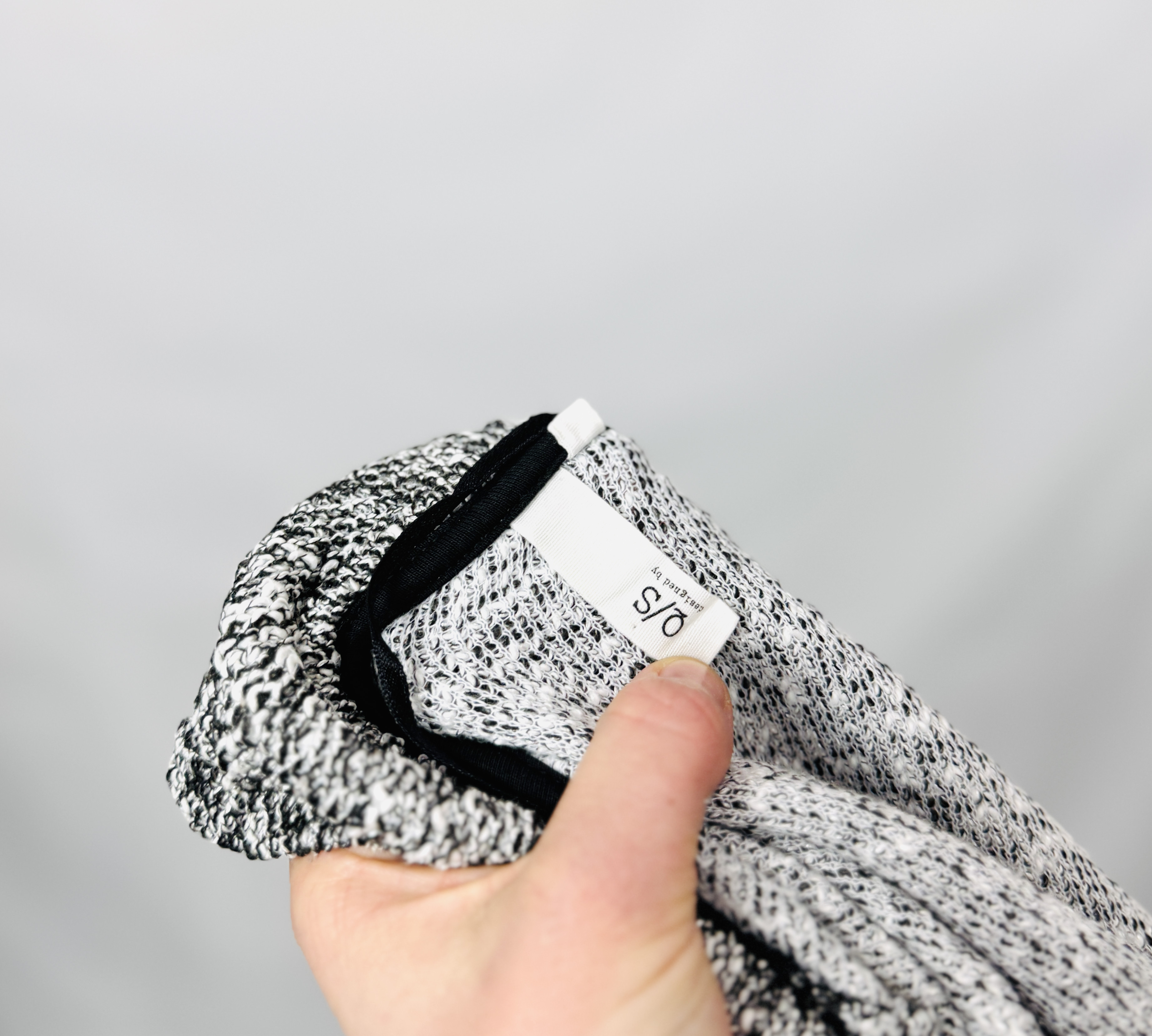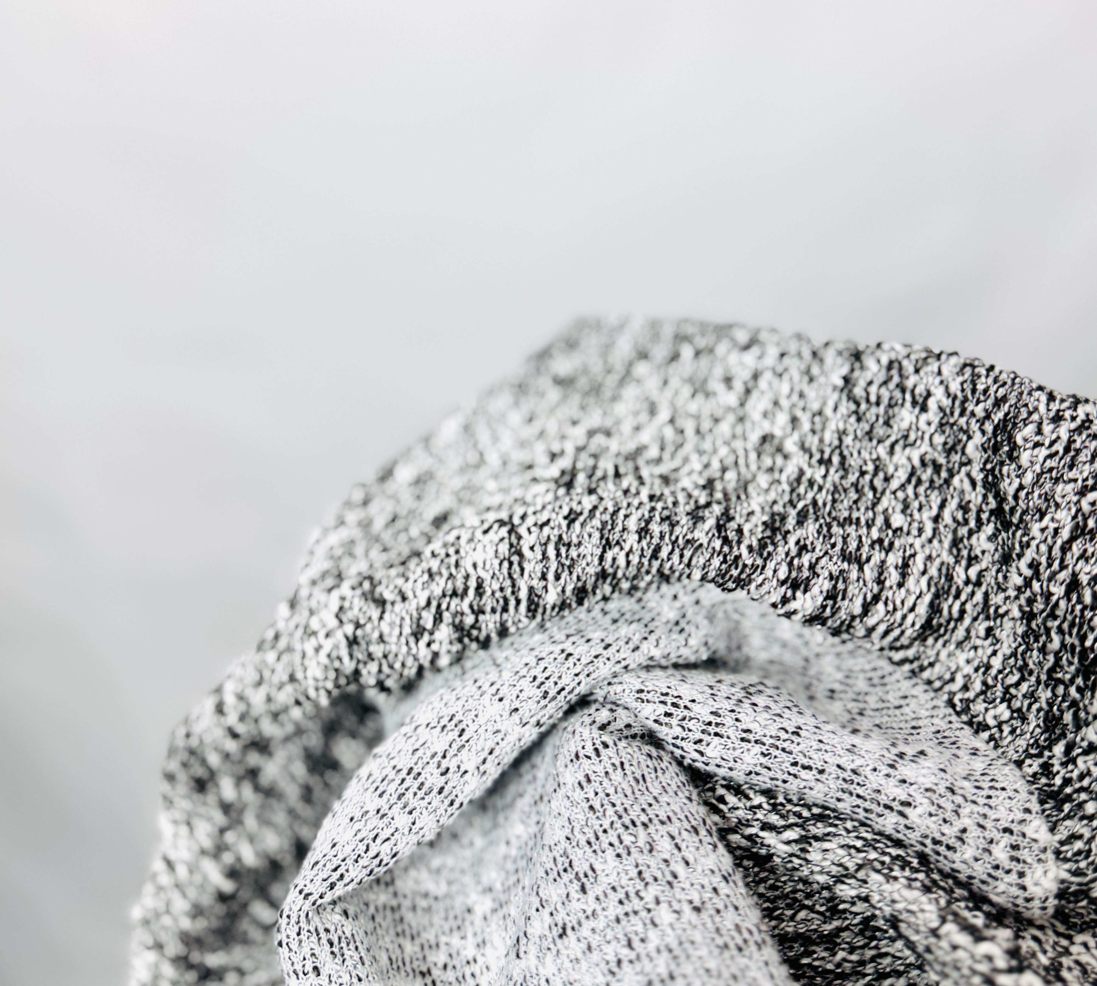 Materiał prezentuje się jako miękko układający się, średniej grubości splot o przyjemnej fakturze — nieco grubszy i otulający, ale na tyle elastyczny, by tworzyć ładne fałdy i naturalne drapowania. Dzięki temu żakiet nie traci formy, a jednocześnie pracuje przy ruchu, nadając stylizacjom miękkości i harmonii. Melanżowy wzór optycznie łagodzi linię i wprowadza subtelną dynamikę, która sprawia, że element ten jest ciekawym akcentem garderoby, nie konkurując przy tym z innymi częściami stroju.
