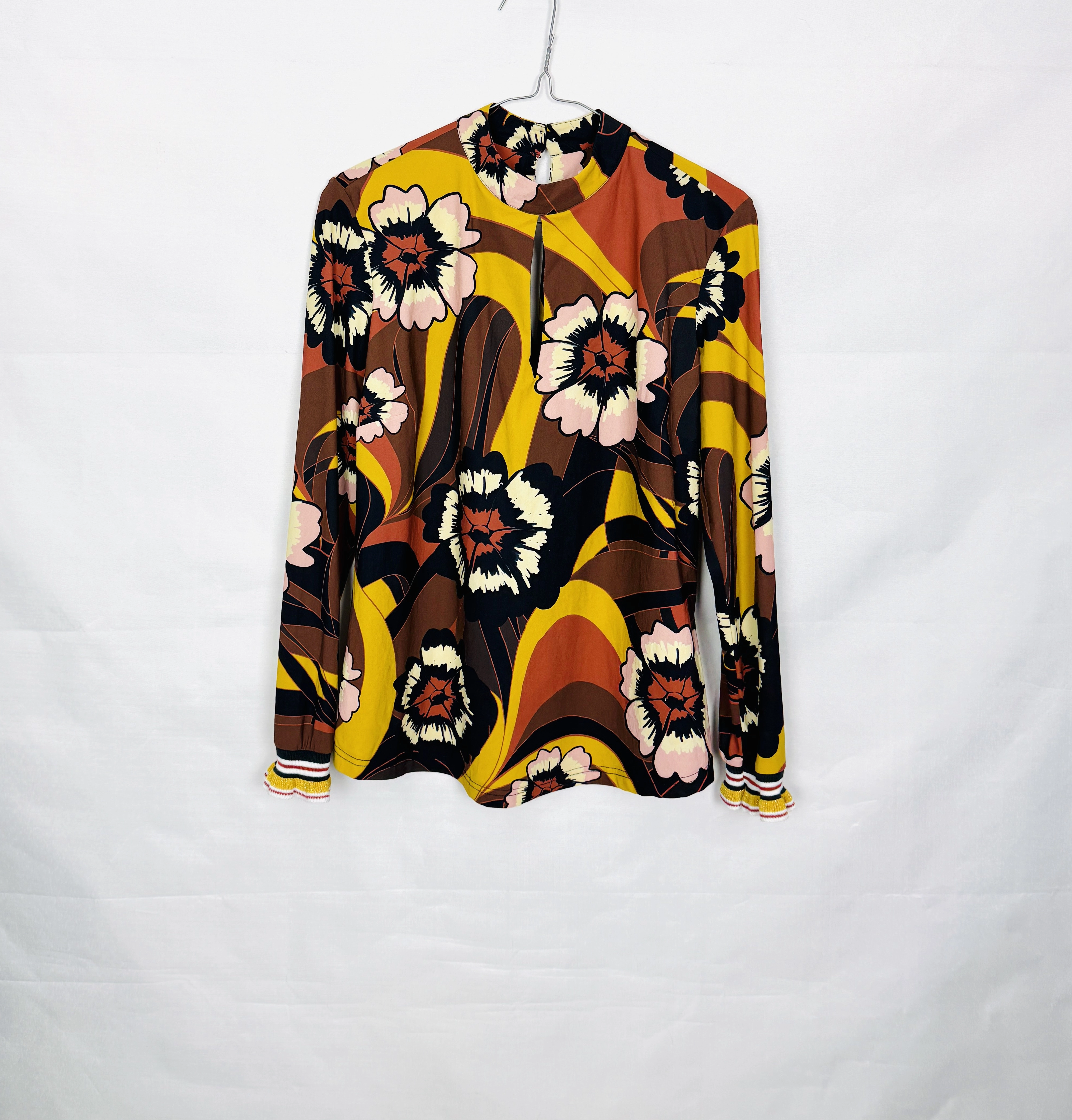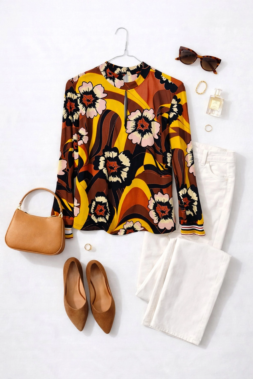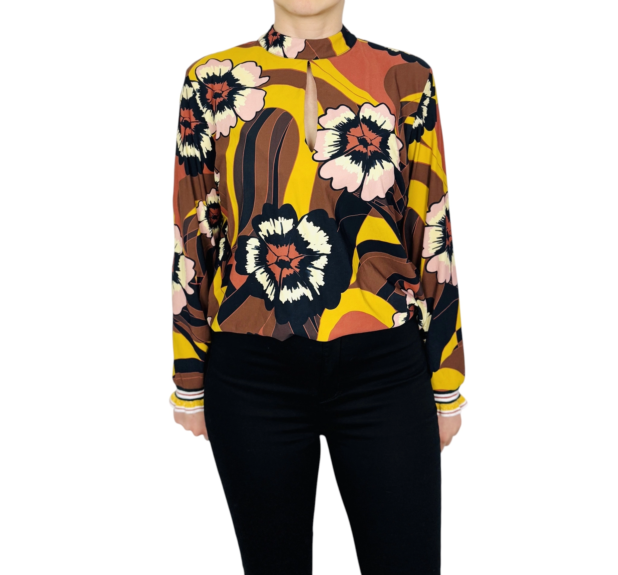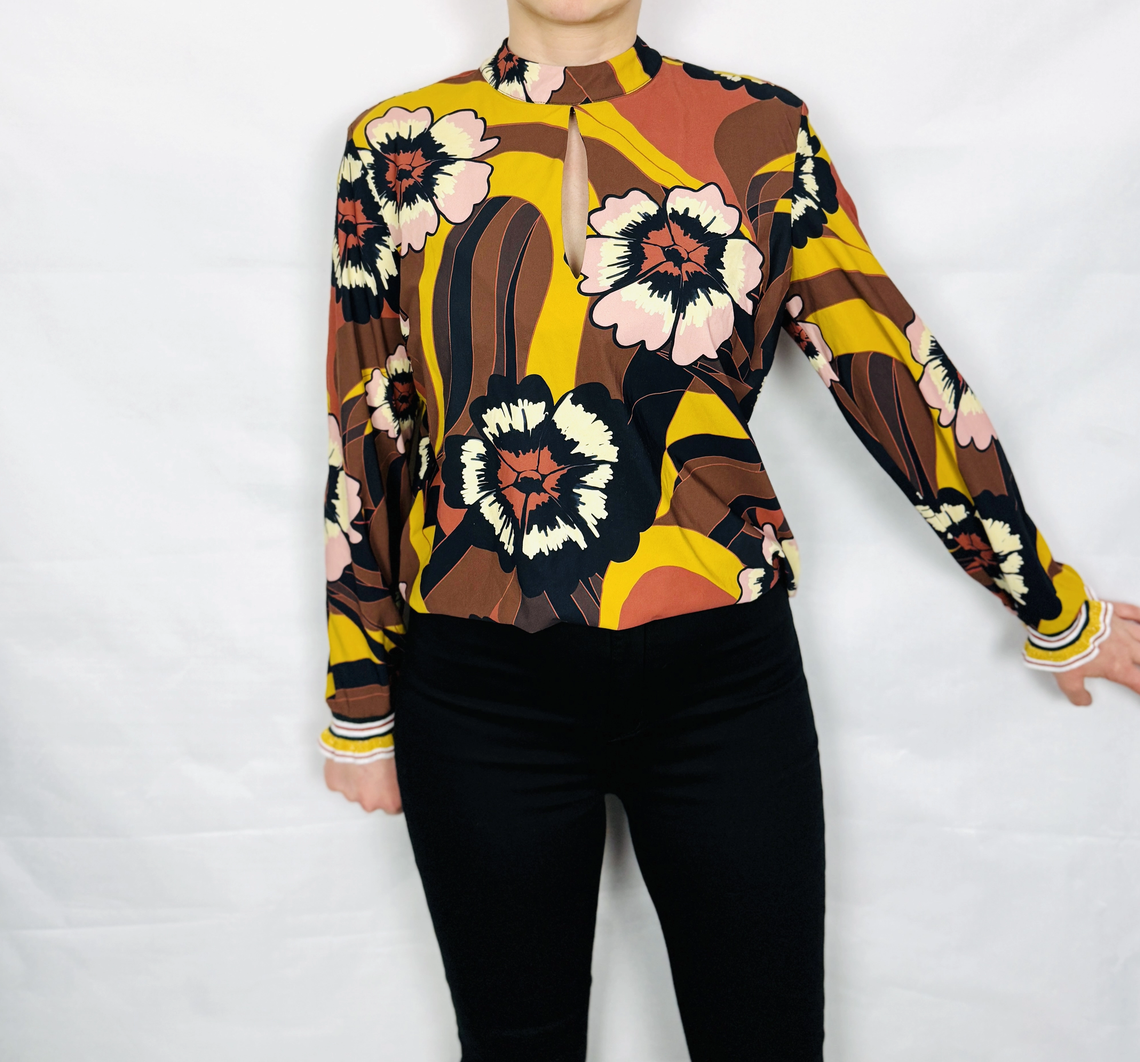 Ta bluzka to fascynująca podróż do estetyki lat siedemdziesiątych, podana w niezwykle nowoczesnym i kobiecym wydaniu. Ekspresyjny wzór w duże, malarskie kwiaty oraz nastrojowe, faliste linie tworzą kompozycję pełną energii i artystycznego wyrazu. Paleta barw oparta na głębokim brązie, słonecznym żółtym, przygaszonym pomarańczu i akcentach różu nadaje całości wyjątkowej głębi i retro charakteru. To ubranie, które od razu przyciąga uwagę i staje się centralnym punktem każdej stylizacji, emanując pewnością siebie i niebanalnym podejściem do mody, idealne dla kobiet ceniących wyraziste, nasycone motywy.
