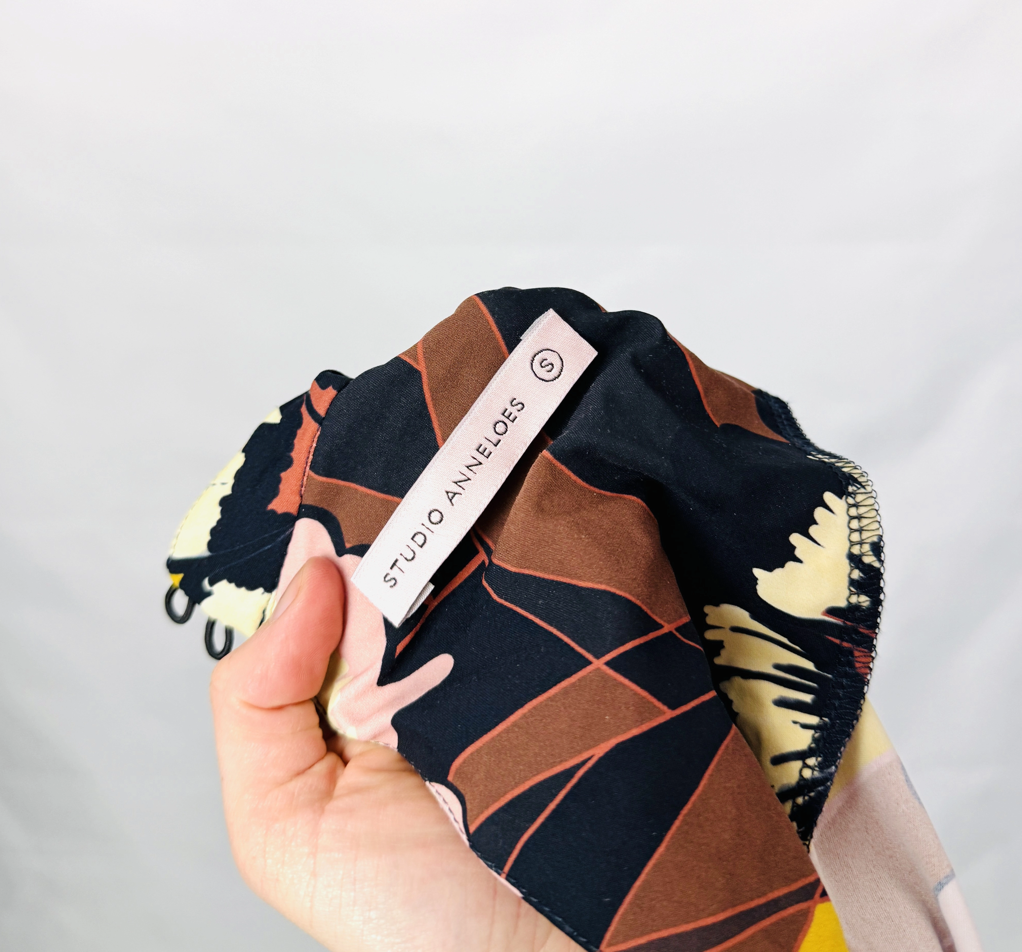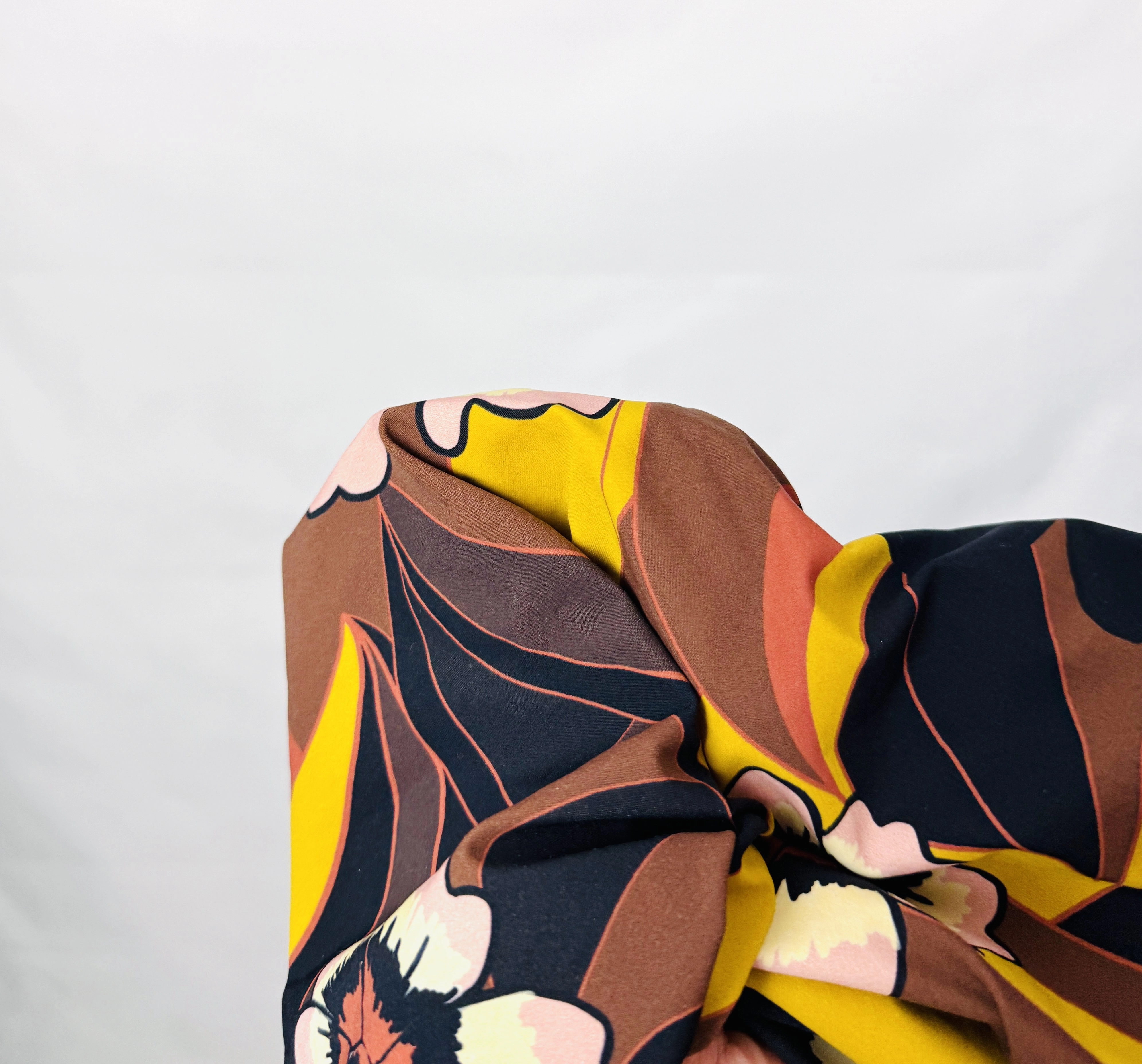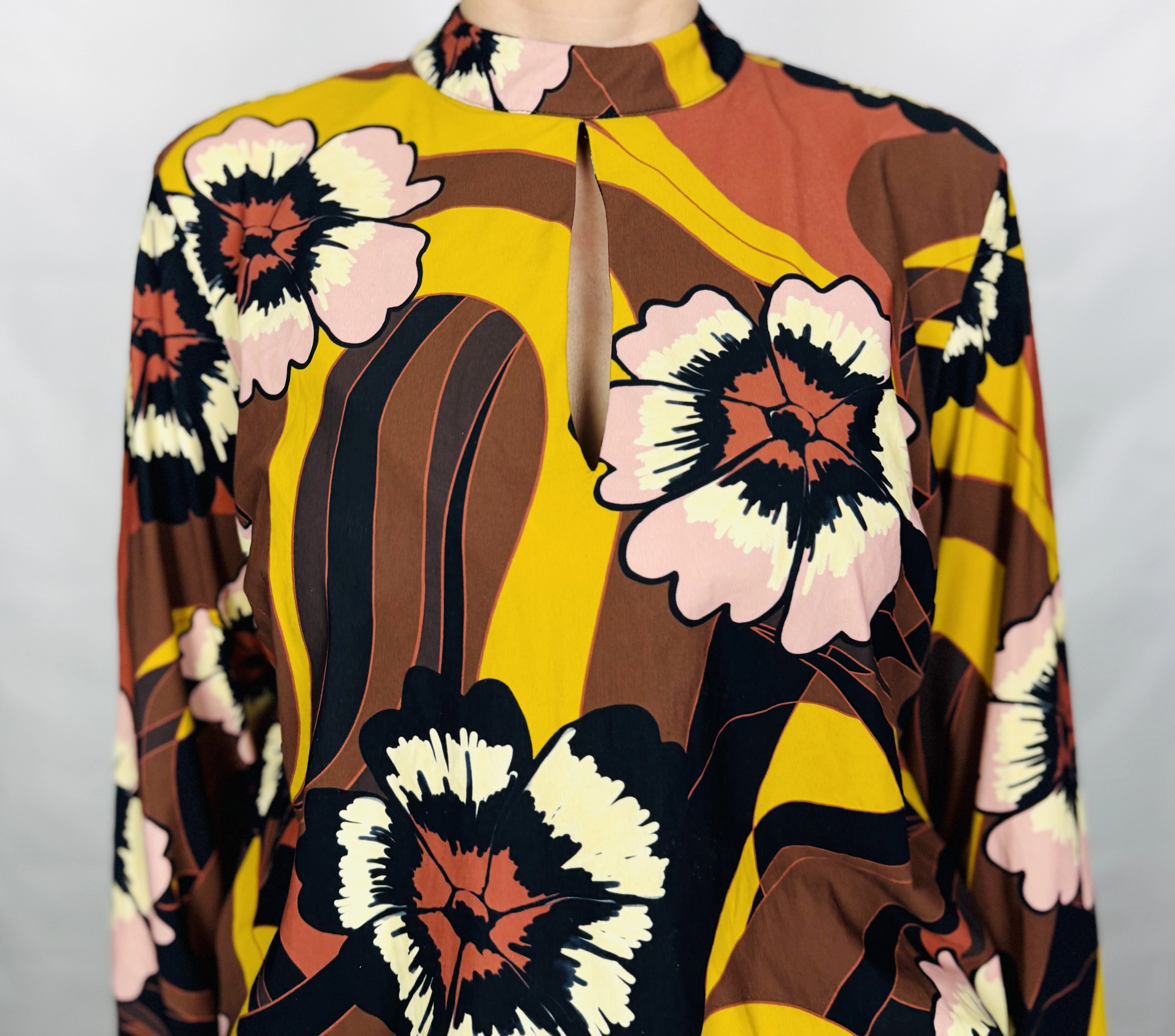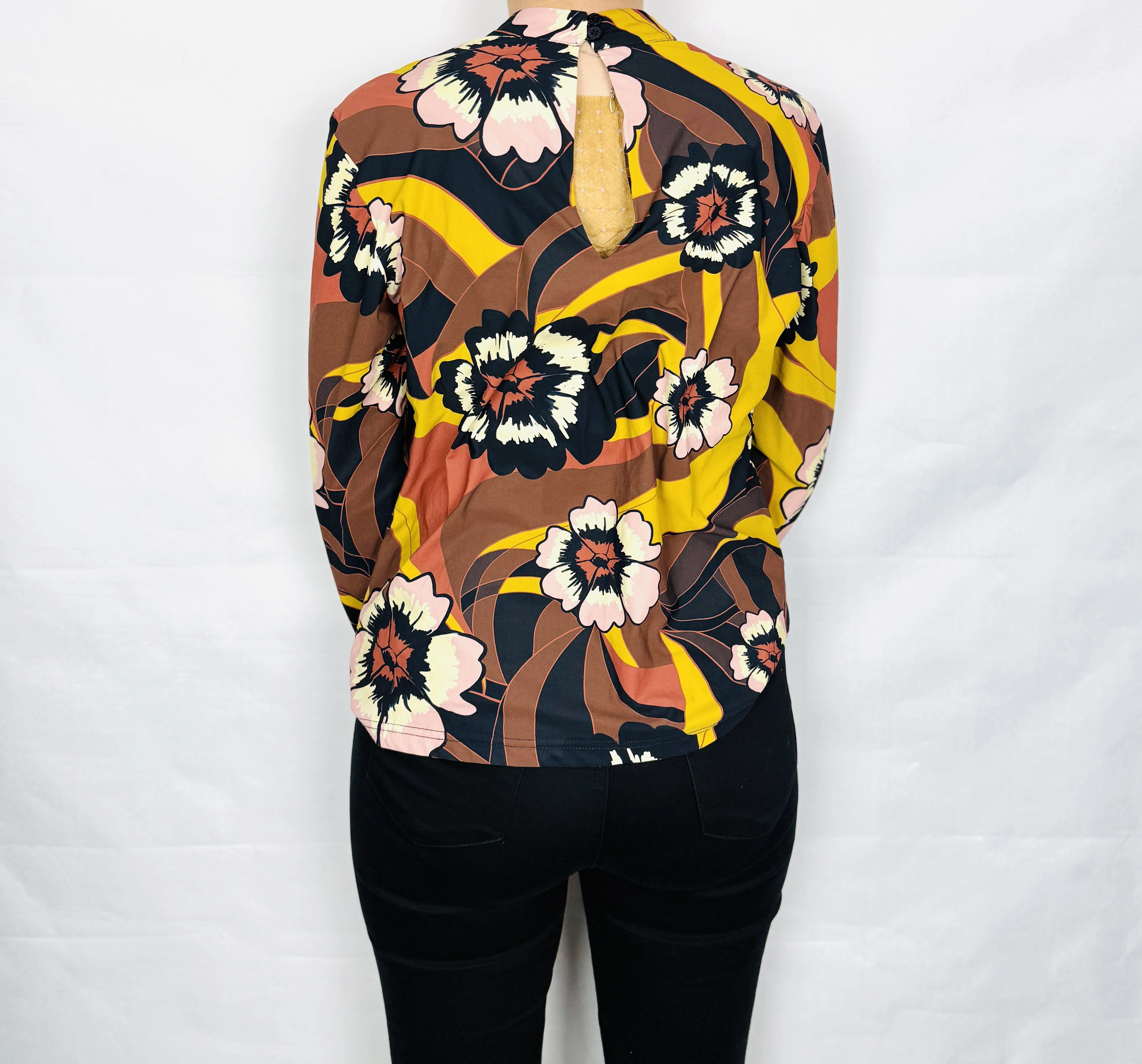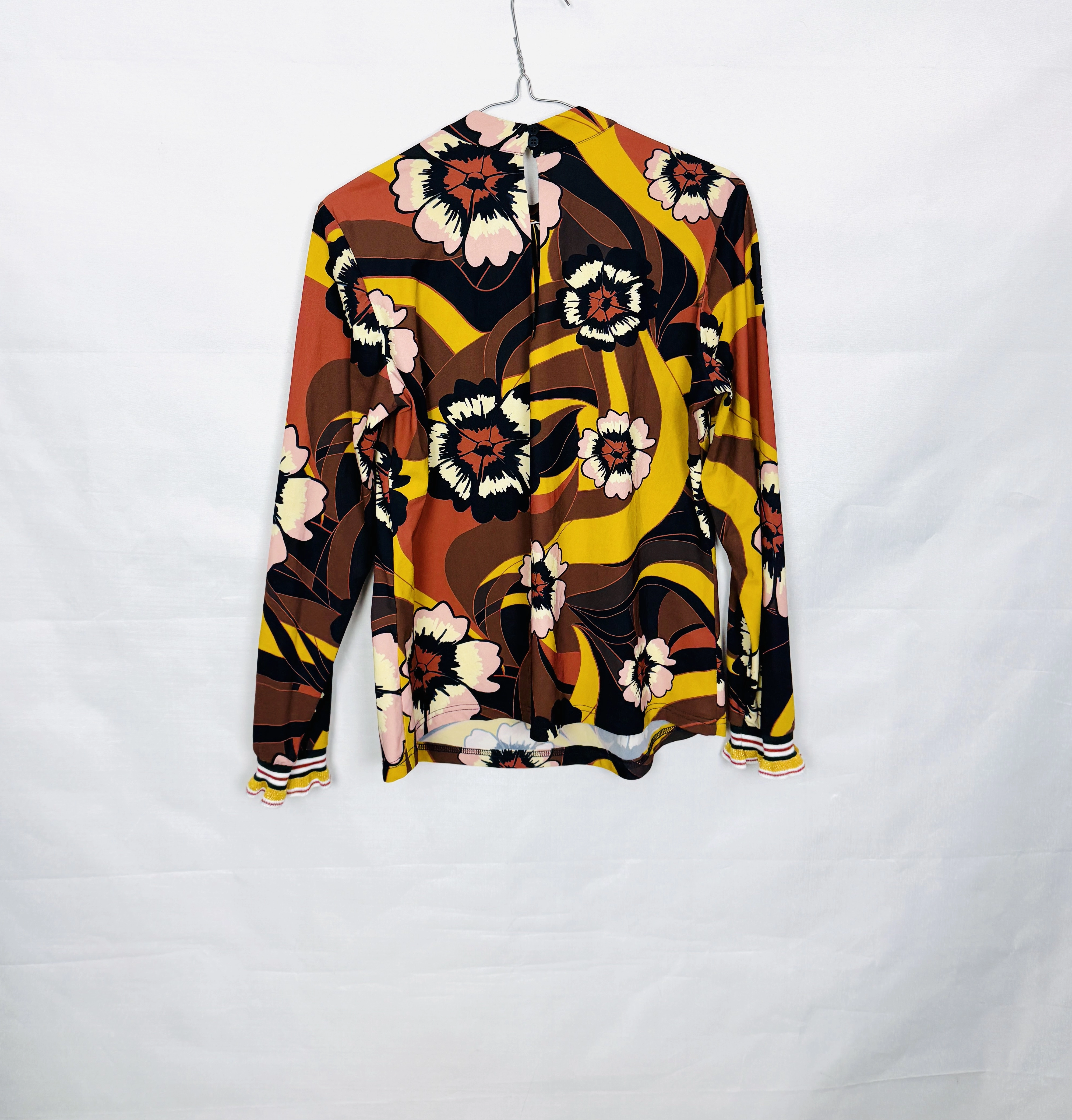Ta bluzka to fascynująca podróż do estetyki lat siedemdziesiątych, podana w niezwykle nowoczesnym i kobiecym wydaniu. Ekspresyjny wzór w duże, malarskie kwiaty oraz nastrojowe, faliste linie tworzą kompozycję pełną energii i artystycznego wyrazu. Paleta barw oparta na głębokim brązie, słonecznym żółtym, przygaszonym pomarańczu i akcentach różu nadaje całości wyjątkowej głębi i retro charakteru. To ubranie, które od razu przyciąga uwagę i staje się centralnym punktem każdej stylizacji, emanując pewnością siebie i niebanalnym podejściem do mody, idealne dla kobiet ceniących wyraziste, nasycone motywy.