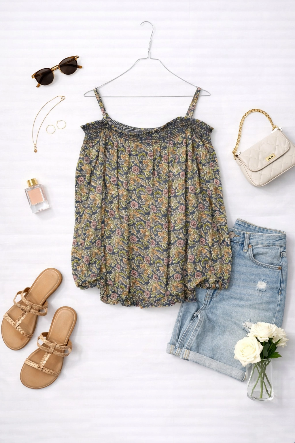 Luźny krój sprawia, że bluzka skutecznie maskuje okolice talii i brzucha, jednocześnie zachowując lekkość i proporcje sylwetki. Odsłonięte ramiona przyciągają uwagę do górnej części ciała, co pozwala optycznie zbalansować sylwetkę, szczególnie w przypadku szerszych bioder. Delikatna objętość rękawów oraz marszczenie przy dekolcie dodają sylwetce kobiecego kształtu i miękkości.