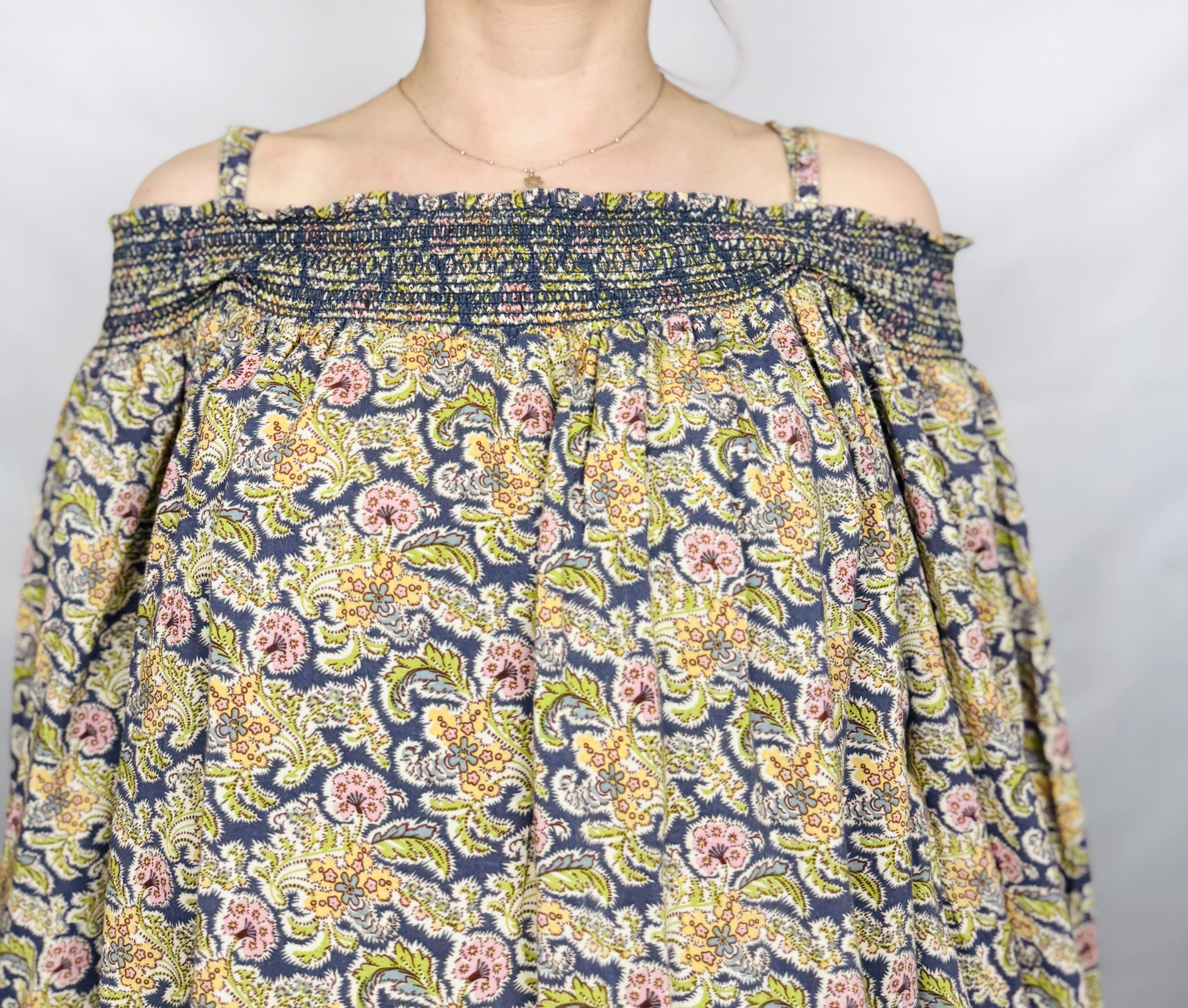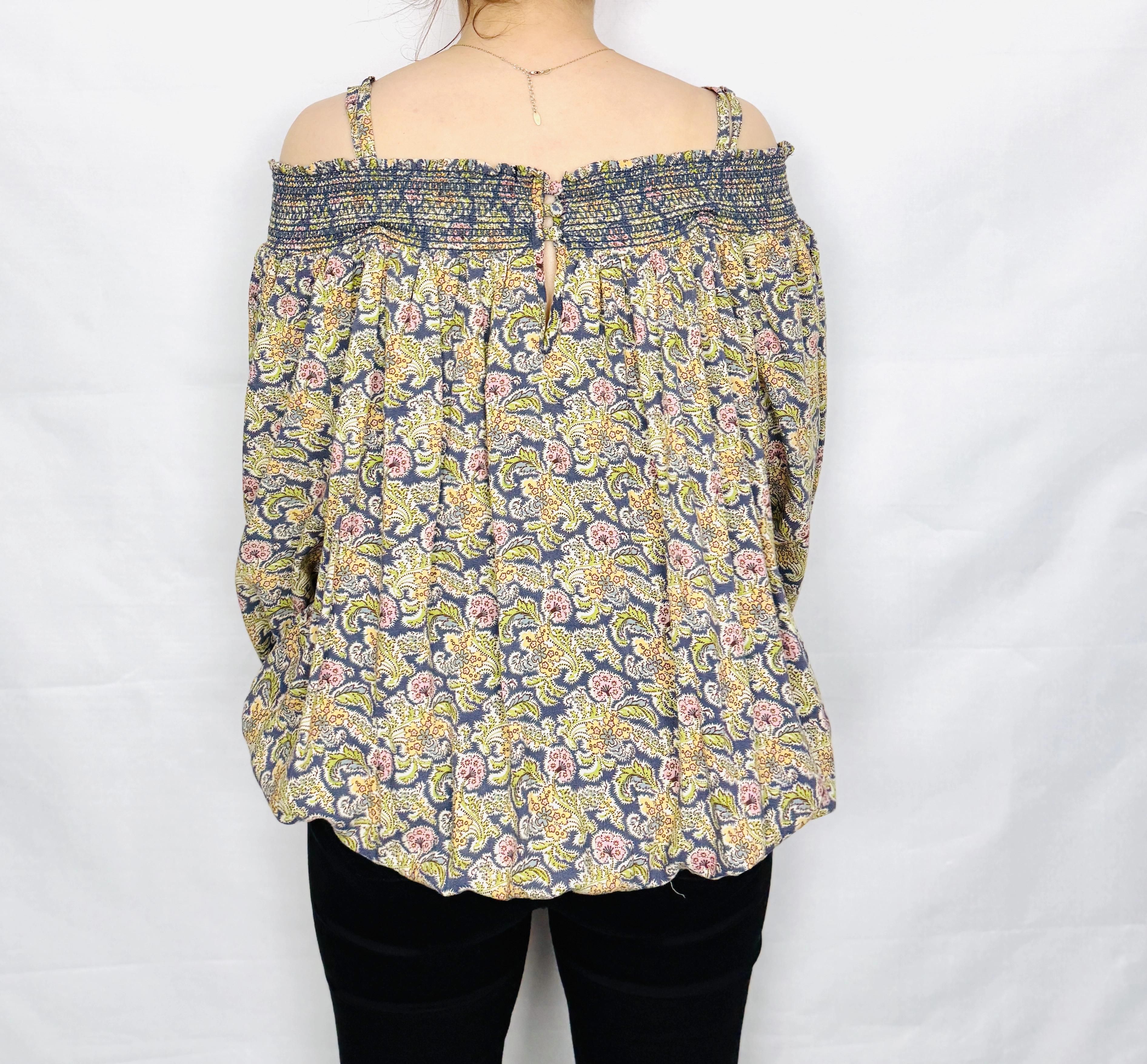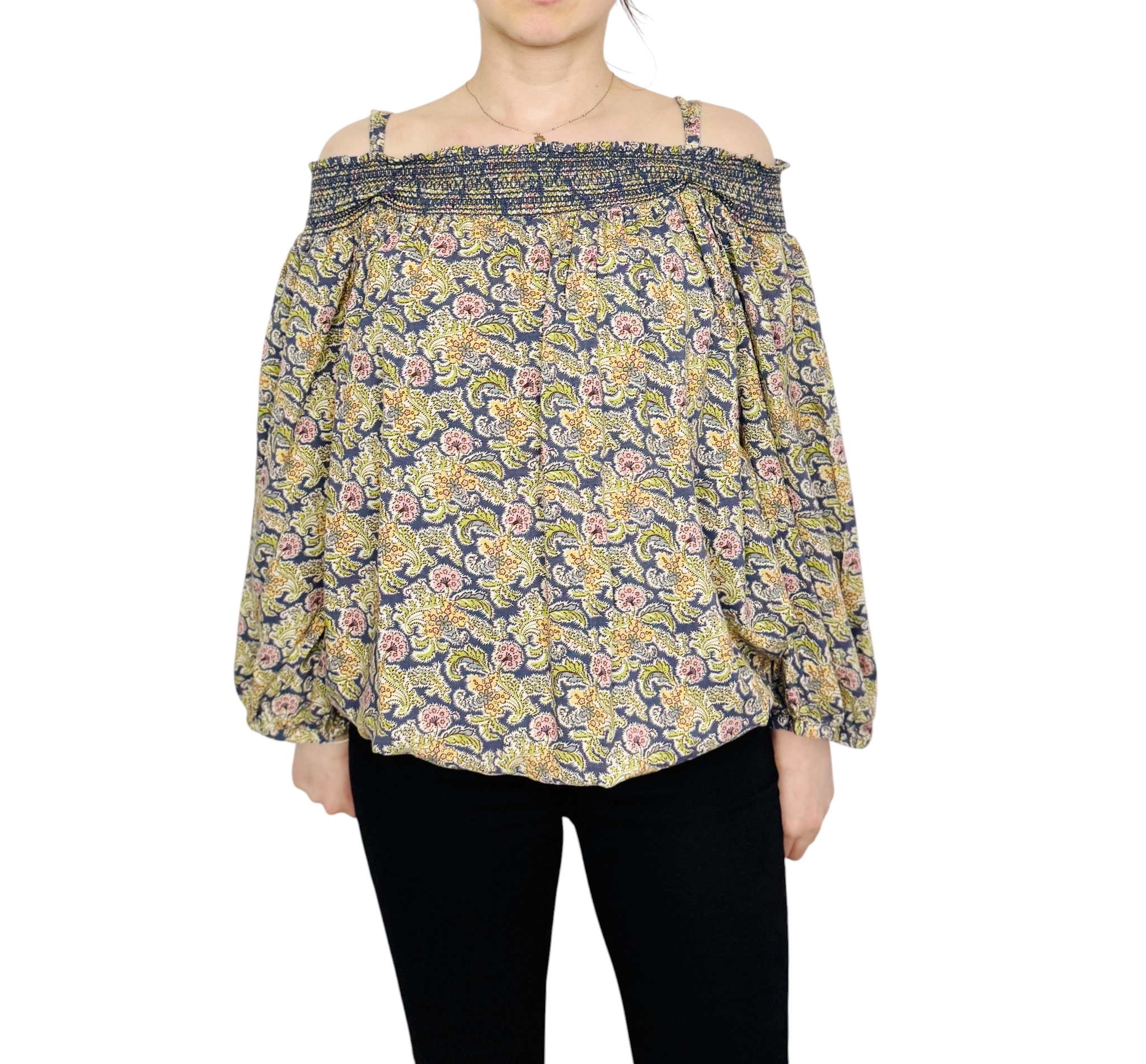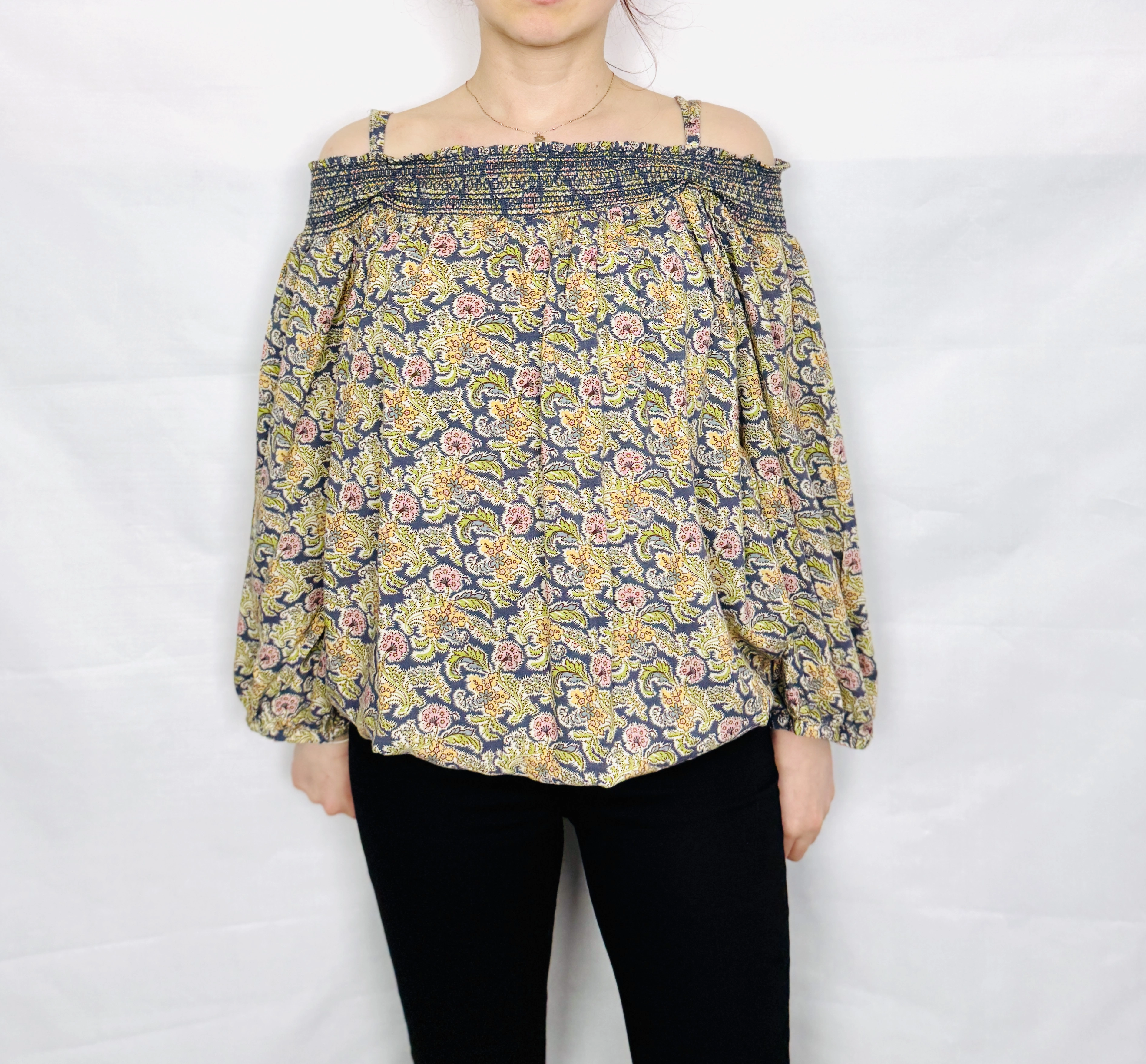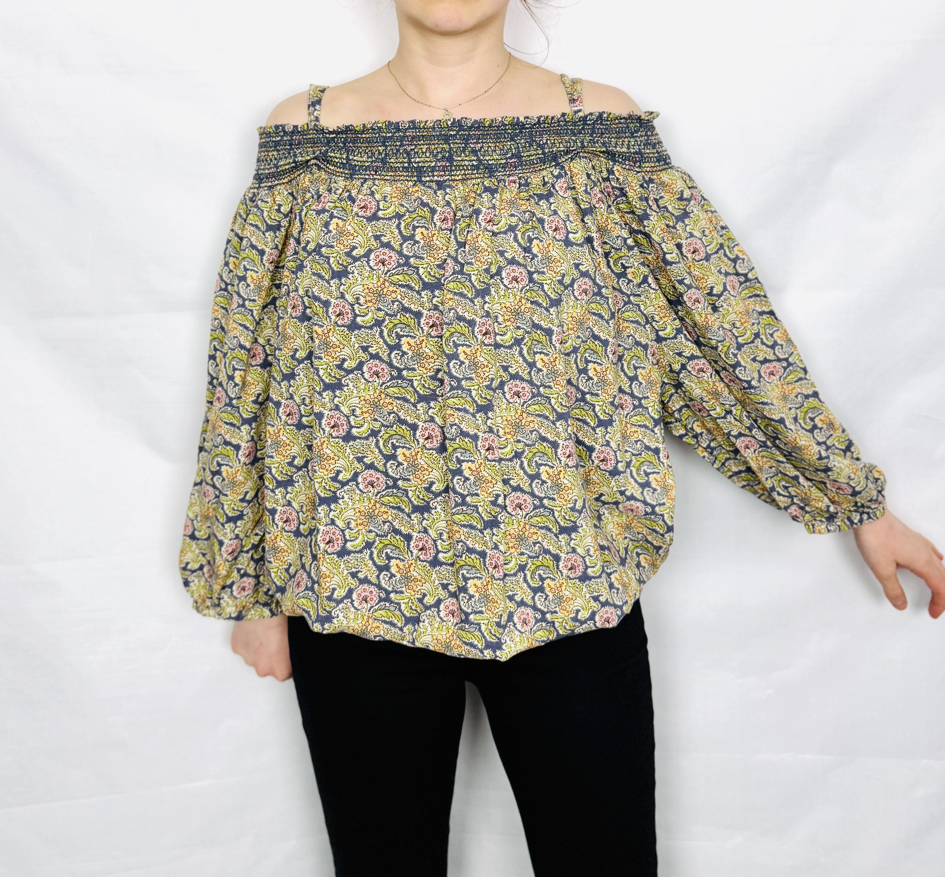 Fason bluzki jest luźny i komfortowy, z wyraźnie zaznaczoną górą w formie elastycznego marszczenia, które stabilnie utrzymuje całość na ramionach. Dekolt typu hiszpanka został dodatkowo uzupełniony cienkimi ramiączkami, co stanowi ciekawy, praktyczny akcent i zapewnia większe poczucie pewności podczas noszenia. Długie rękawy mają lekko bufiastą formę i zakończone są delikatnym ściągaczem, co nadaje im miękkości i subtelnej objętości. Materiał jest lekki, zwiewny i delikatnie fakturowany, dzięki czemu pięknie układa się na sylwetce i porusza się wraz z nią. Dół bluzki pozostaje swobodny, co podkreśla jej niezobowiązujący charakter.