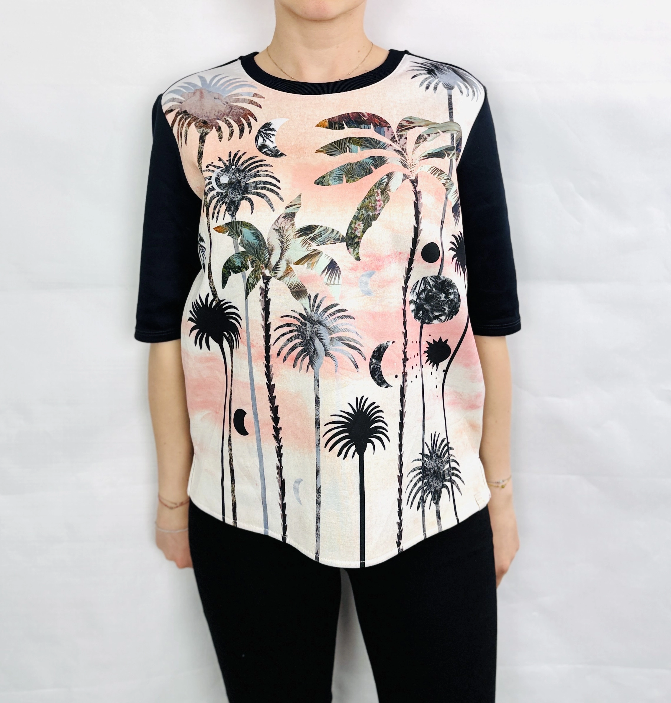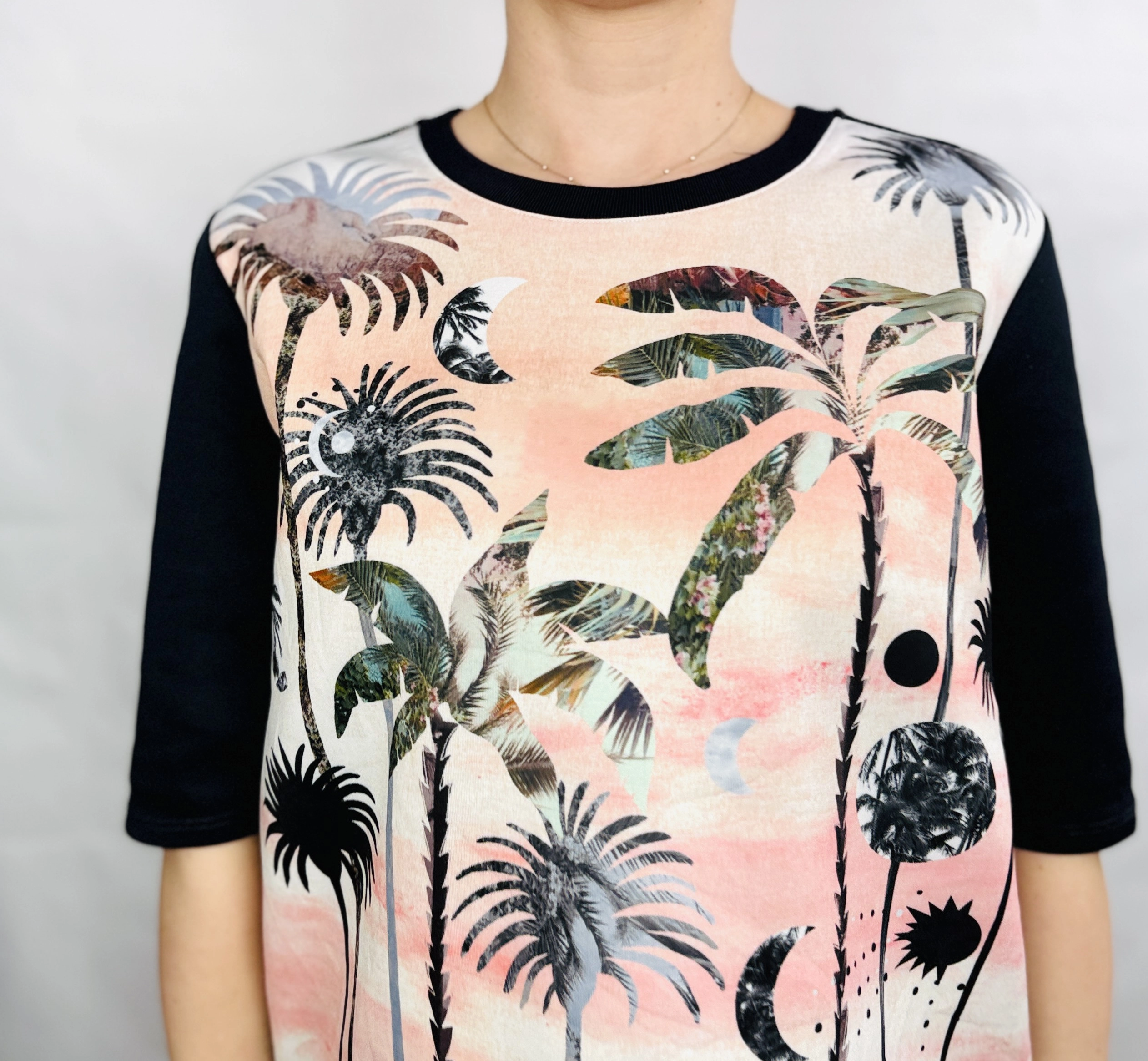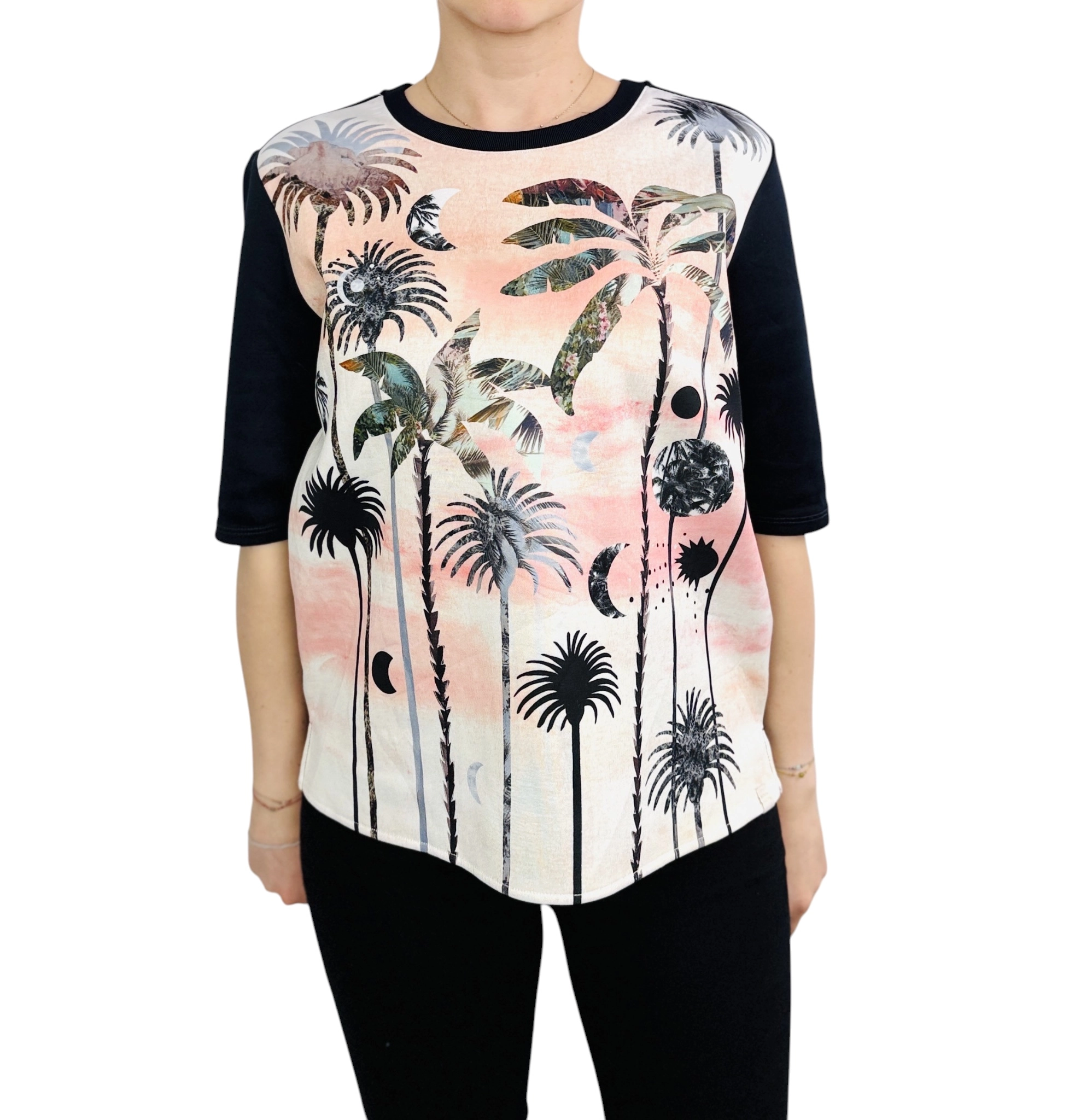 Ta wzorzysta bluzka to doskonałe połączenie artystycznej ekspresji i codziennej wygody, które pozwala wyróżnić się z tłumu i dodać stylizacji niepowtarzalnego charakteru. Przód bluzki zdobi unikalny, malarski motyw palm i księżyców, utrzymany w delikatnej, pastelowej tonacji różu, beżu i szarości, który przywodzi na myśl letnie wieczory i egzotyczne krajobrazy. Kontrastujące, jednolite czarne rękawy i tył podkreślają oryginalność fasonu, tworząc harmonijną całość pełną świeżości i nowoczesnego stylu.