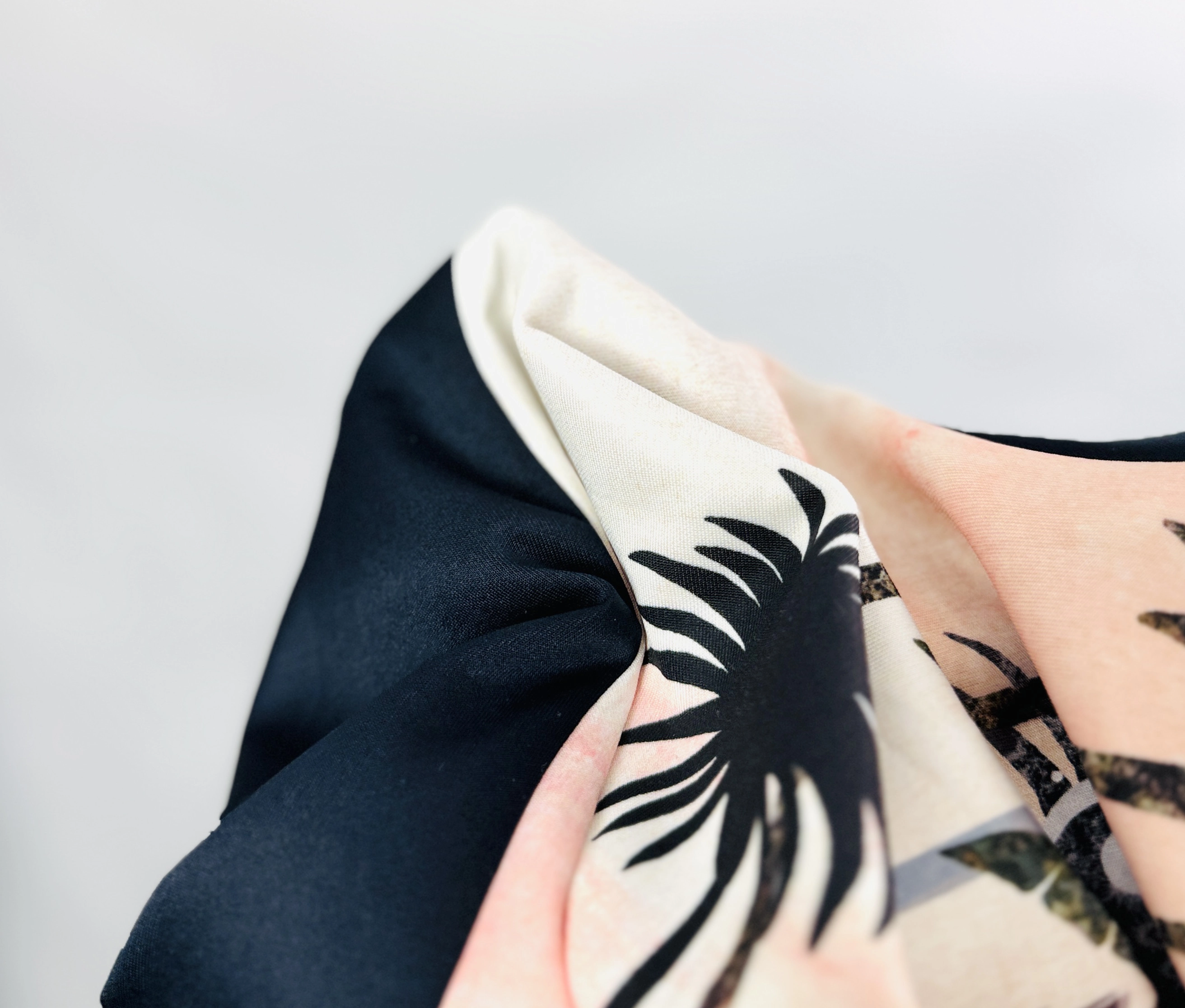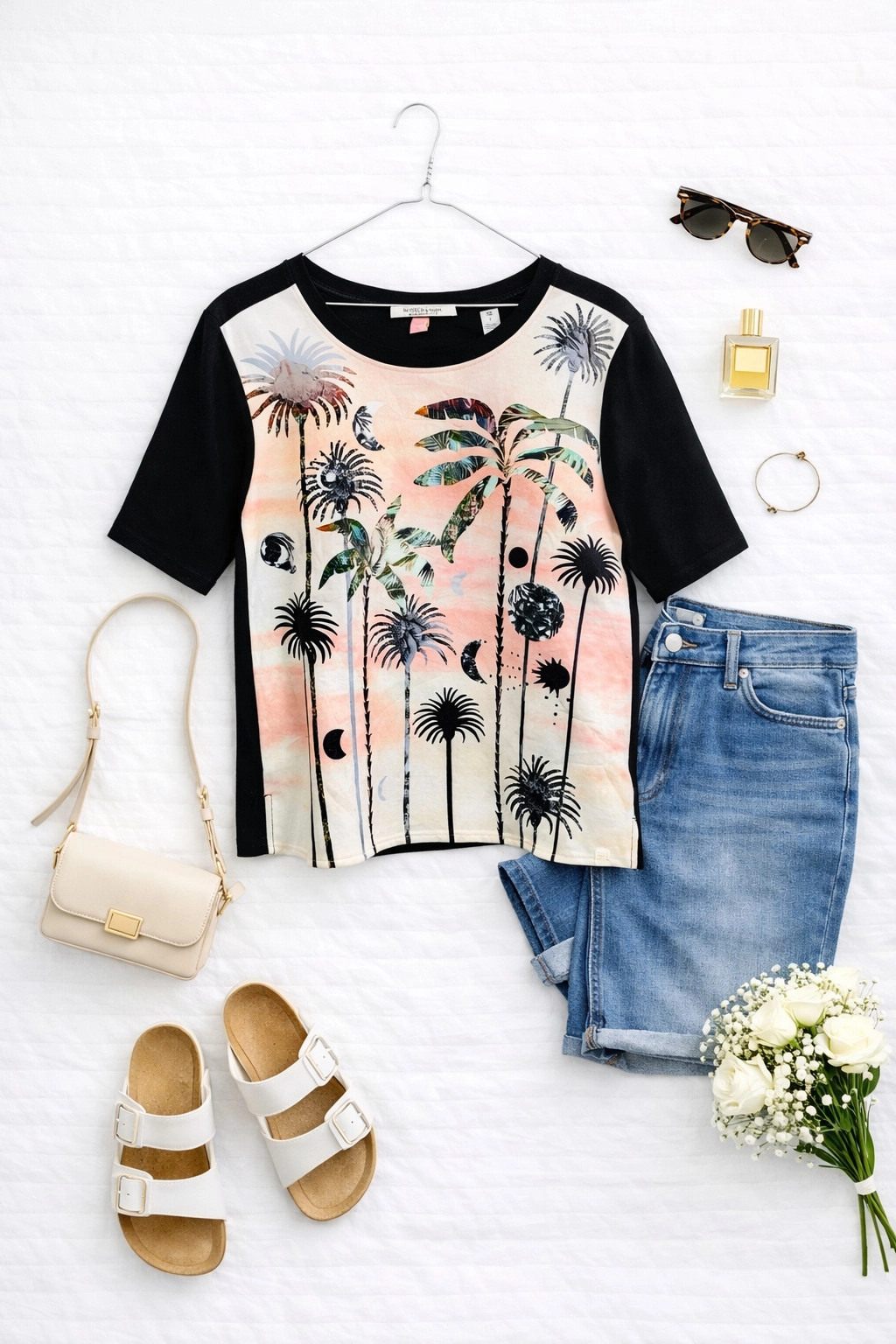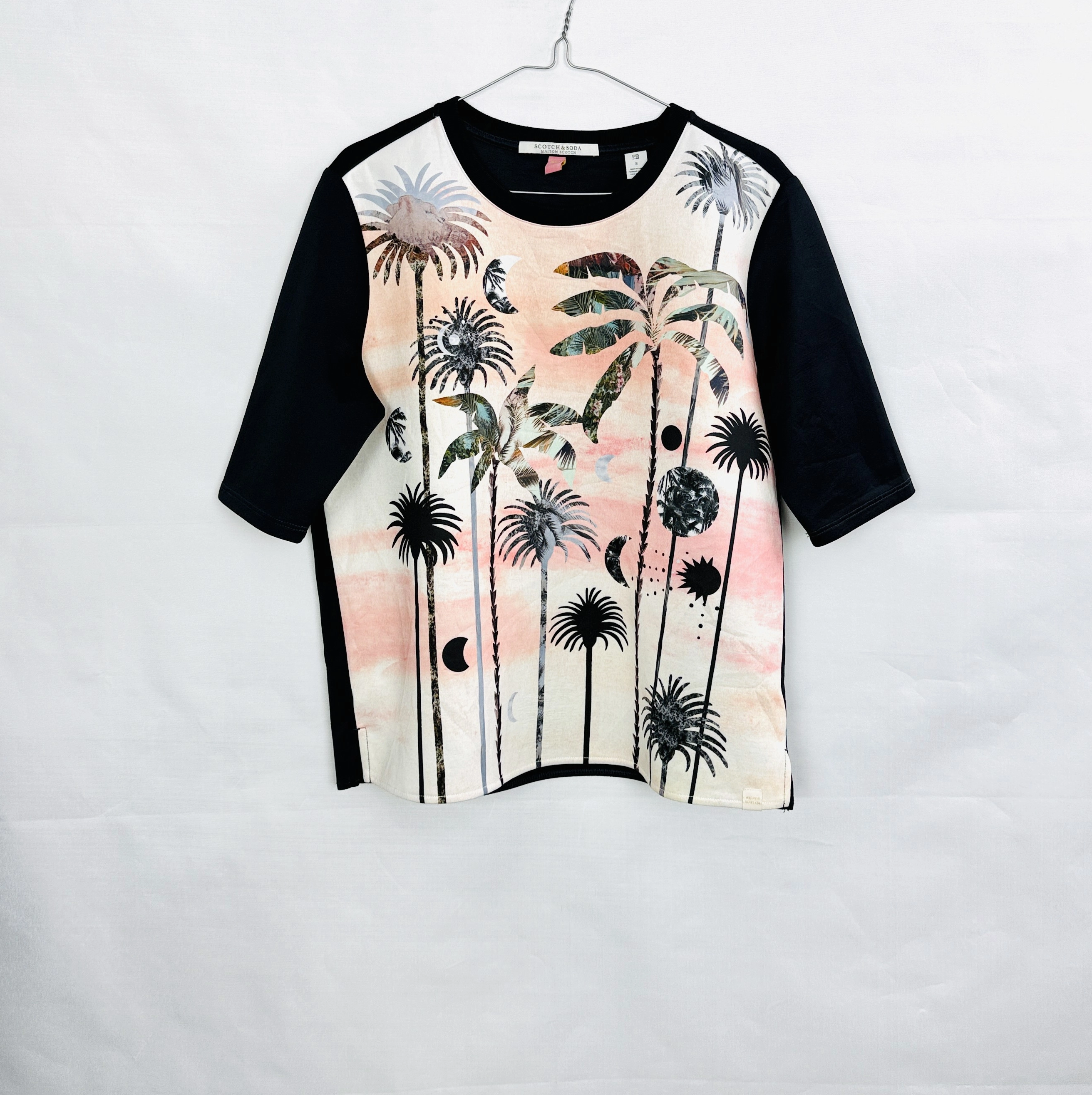 Ta wzorzysta bluzka to doskonałe połączenie artystycznej ekspresji i codziennej wygody, które pozwala wyróżnić się z tłumu i dodać stylizacji niepowtarzalnego charakteru. Przód bluzki zdobi unikalny, malarski motyw palm i księżyców, utrzymany w delikatnej, pastelowej tonacji różu, beżu i szarości, który przywodzi na myśl letnie wieczory i egzotyczne krajobrazy. Kontrastujące, jednolite czarne rękawy i tył podkreślają oryginalność fasonu, tworząc harmonijną całość pełną świeżości i nowoczesnego stylu.