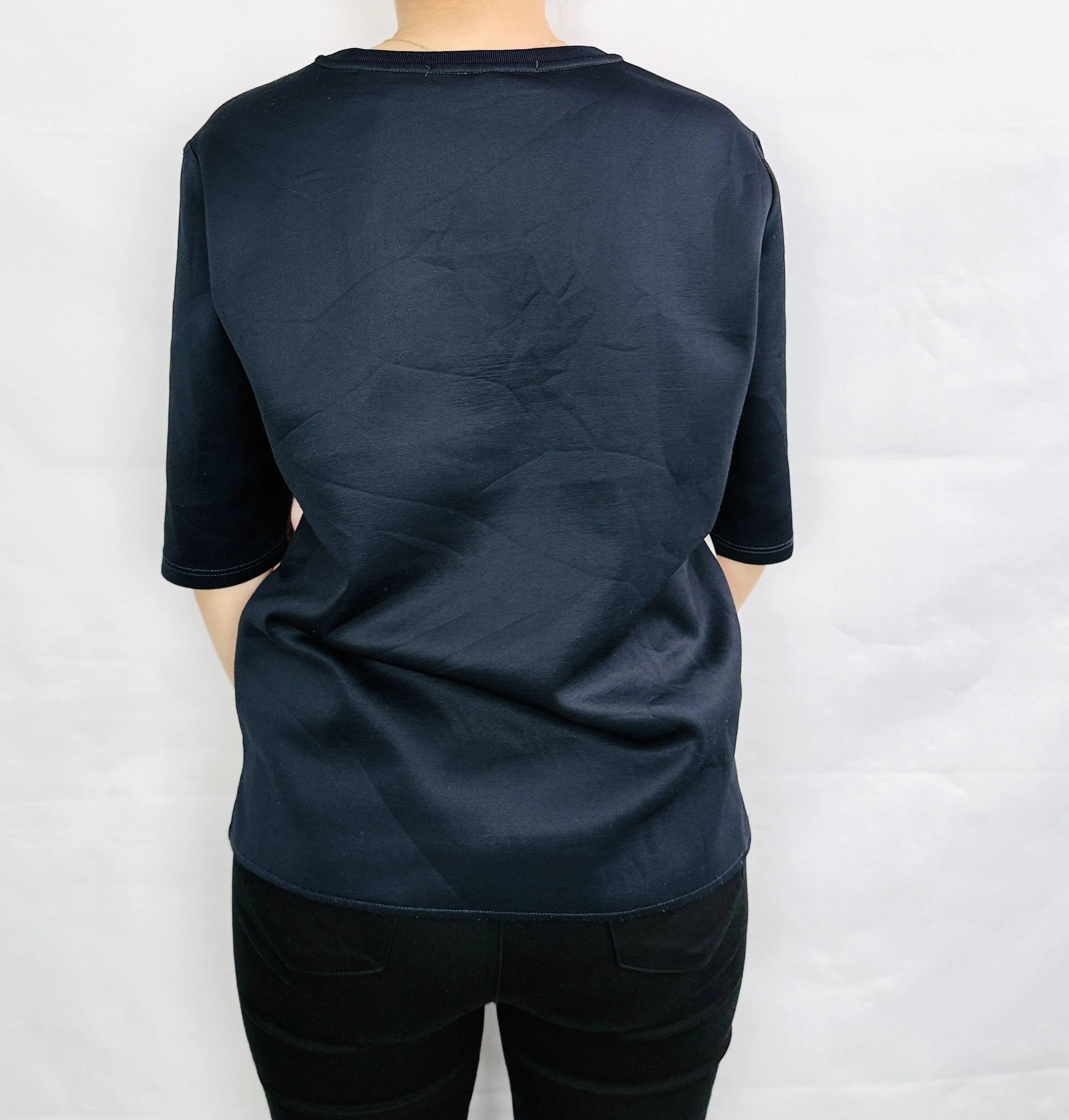 Fason bluzki jest lekko luźny, co zapewnia komfort i swobodę ruchów, a jednocześnie pozwala na efektowne układanie się materiału na sylwetce. Przód z wyrazistym wzorem przyciąga uwagę i nadaje całości artystycznego wyrazu, podczas gdy gładkie rękawy o długości do łokci wprowadzają równowagę i subtelność. Dekolt jest klasyczny, okrągły, co nadaje bluzce uniwersalnego charakteru i pozwala na łatwe łączenie z różnorodnymi dodatkami, od delikatnych naszyjników po wyraziste kolczyki. Materiał ma miękko układającą się, lekko elastyczną powierzchnię, która zapewnia przyjemne uczucie na skórze i trwałość na co dzień.