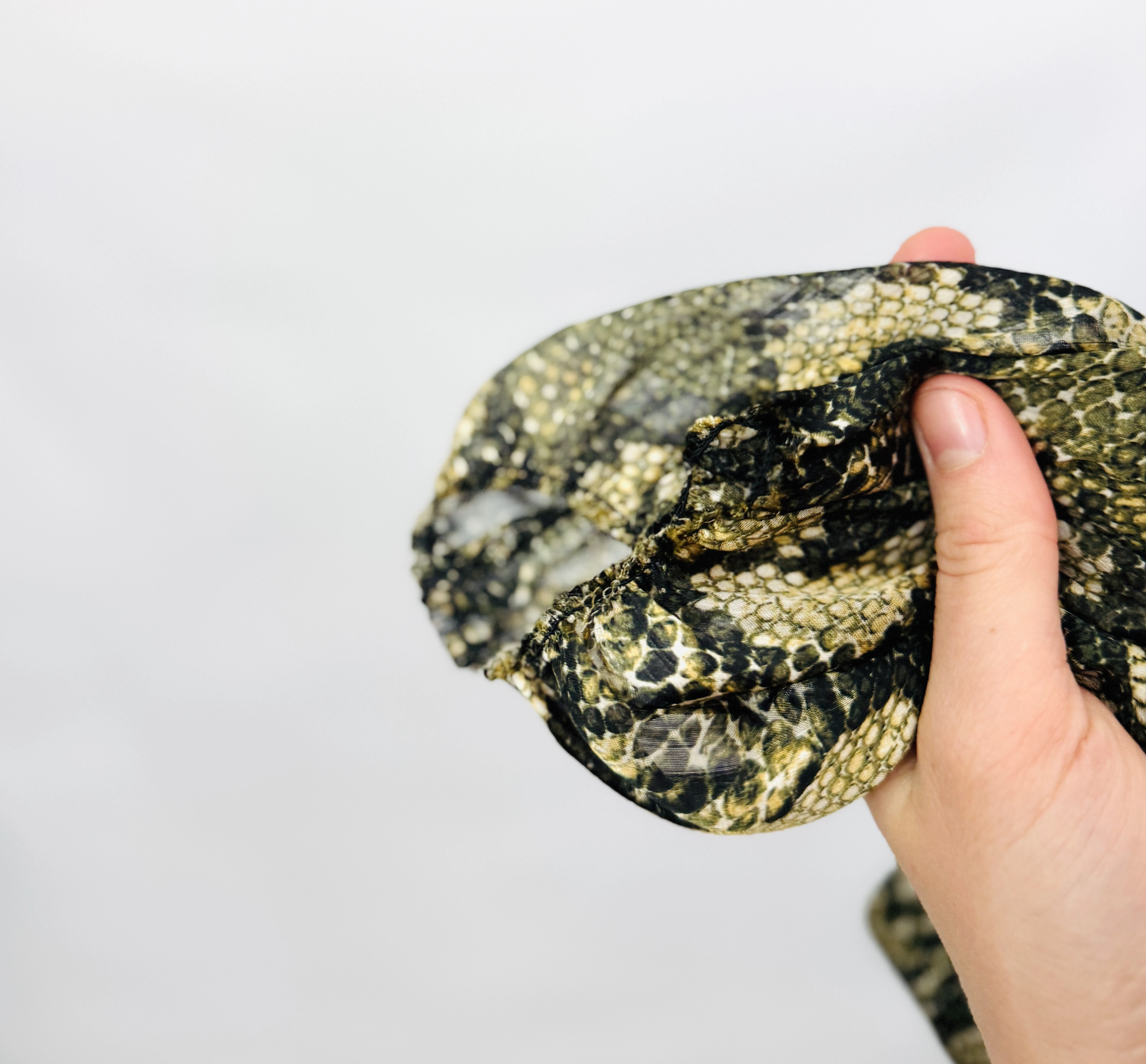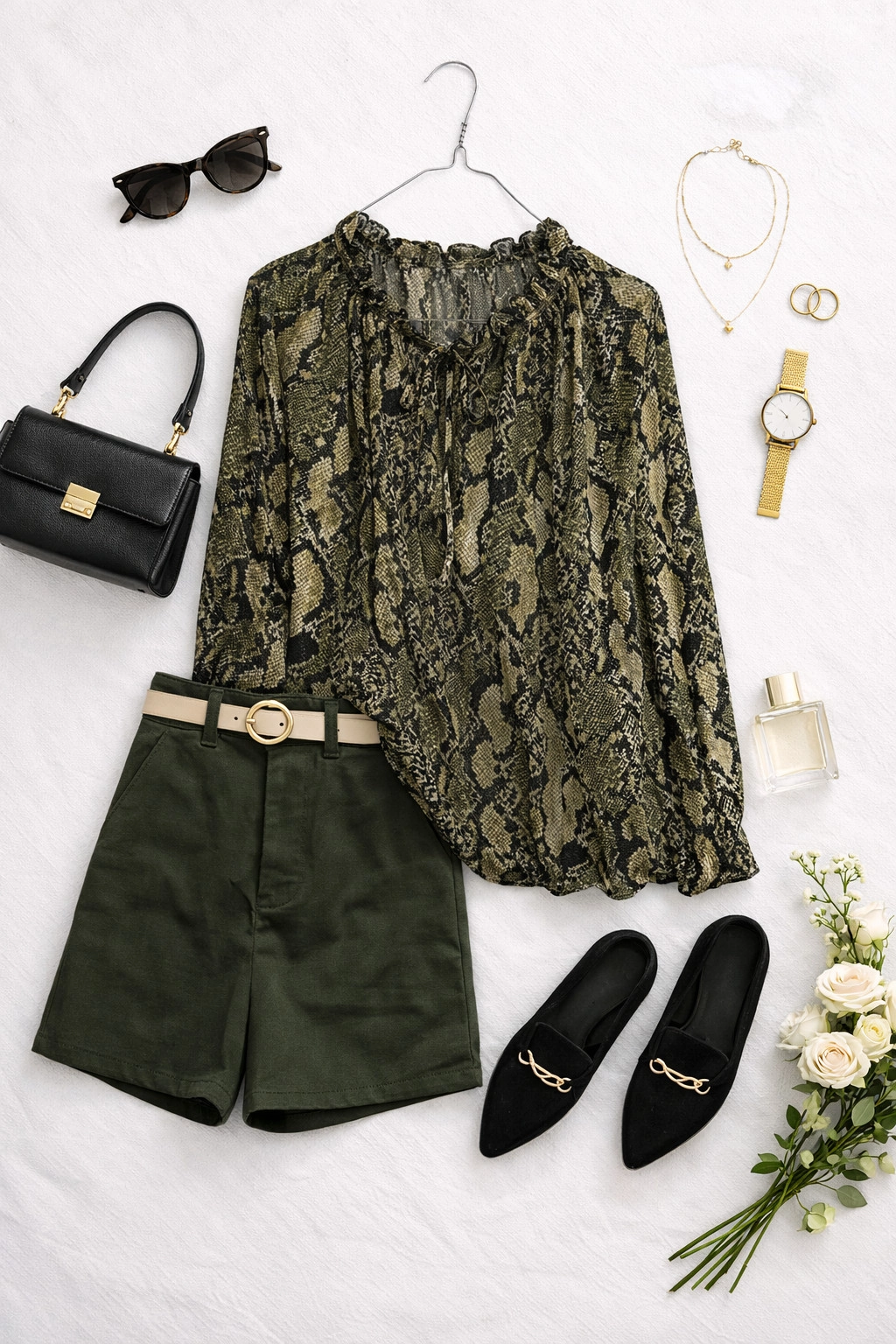 Ta wzorzysta bluzka to kwintesencja nowoczesnej elegancji połączonej z odważnym, zwierzęcym charakterem. Dominujący motyw wężowej skóry w odcieniach oliwkowej zieleni, beżu i głębokiej czerni natychmiast przyciąga uwagę, nadając całości drapieżnego, a zarazem niezwykle szlachetnego wyrazu. To propozycja dla kobiet, które nie boją się modowych eksperymentów i szukają ubrań z charakterem, które potrafią zdefiniować całą stylizację. Bluzka emanuje pewnością siebie i wyrafinowanym stylem, stanowiąc idealny wybór na okazje, w których chcesz poczuć się wyjątkowo i zmysłowo.